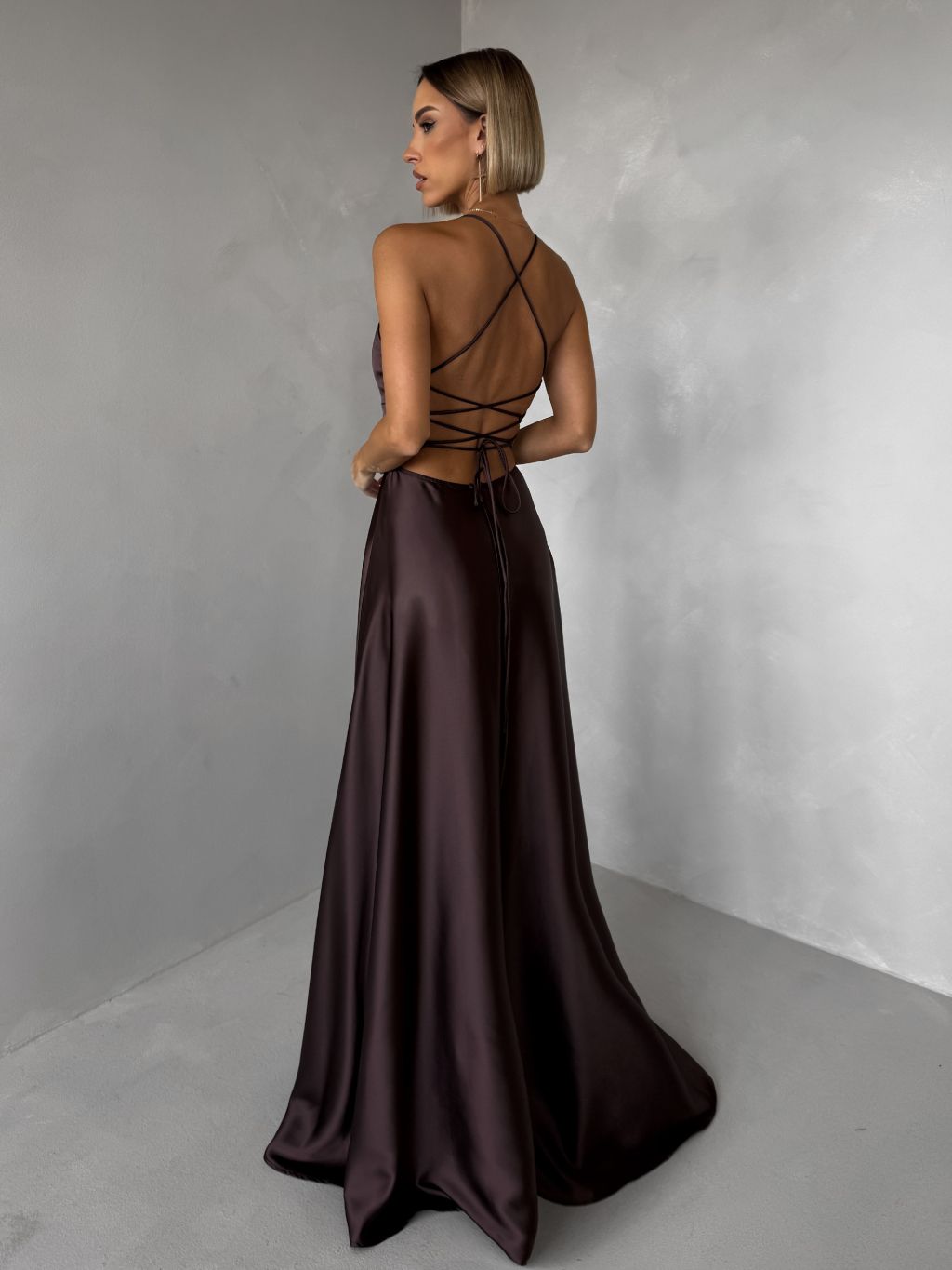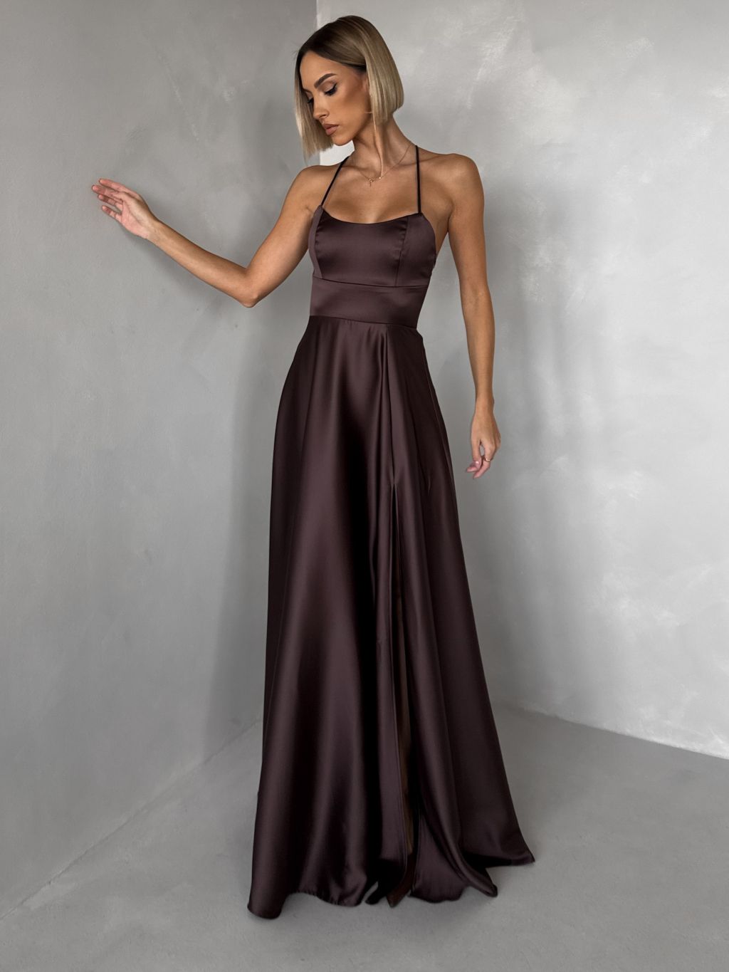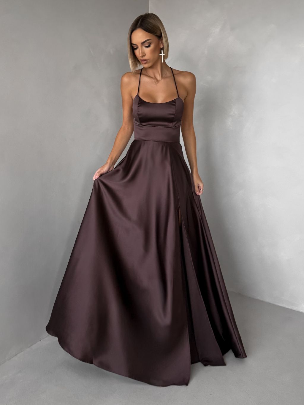 Hnedé dlhé plesové spoločenské šaty CELLINES so šnurovaním a rázporkom