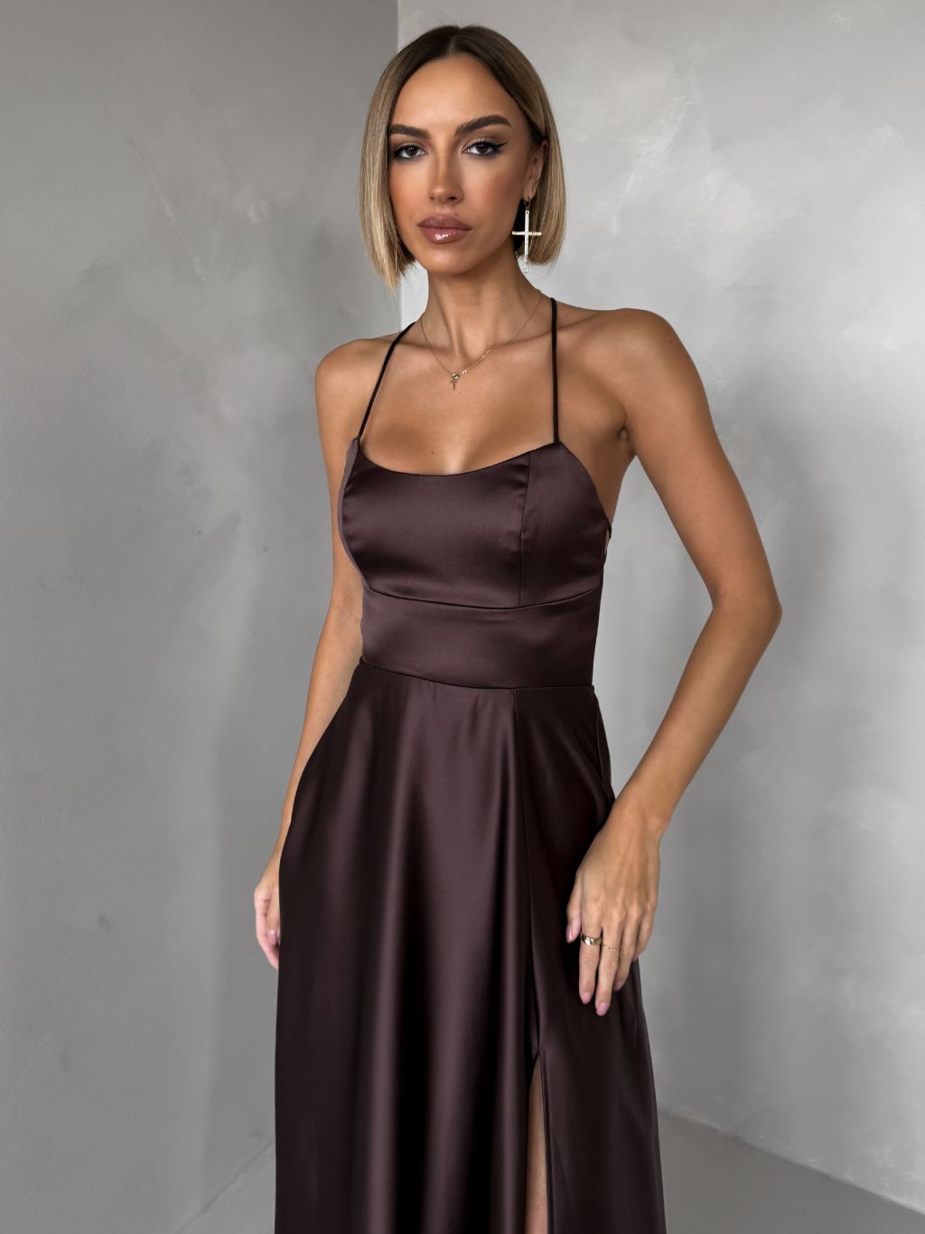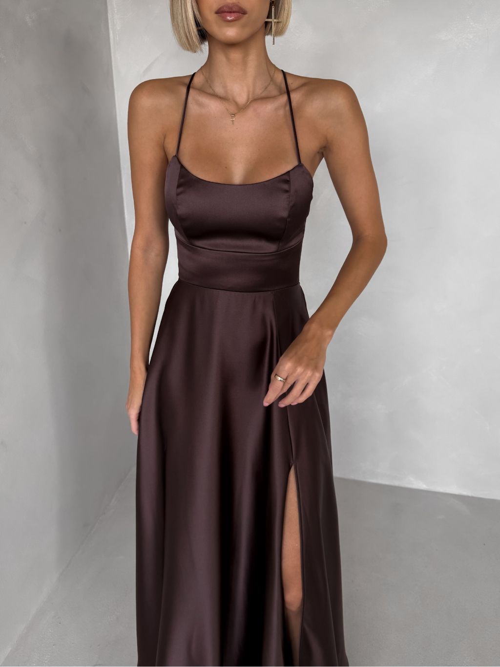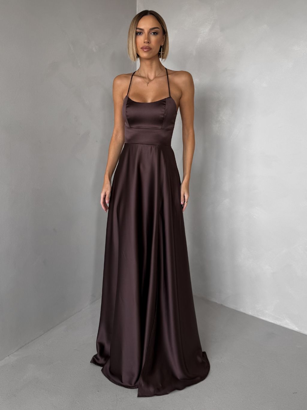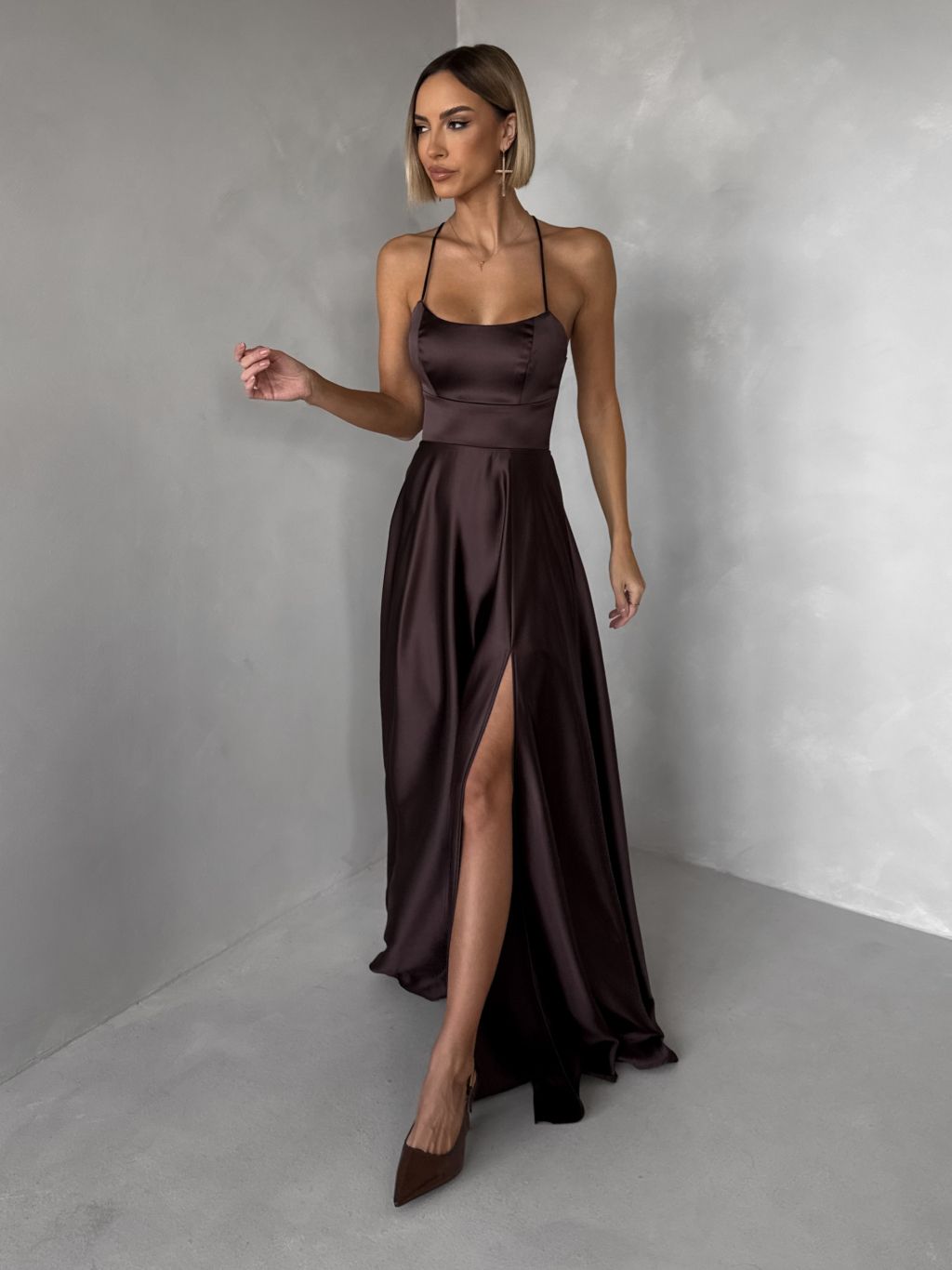 Hnedé dlhé plesové spoločenské šaty CELLINES so šnurovaním a rázporkom