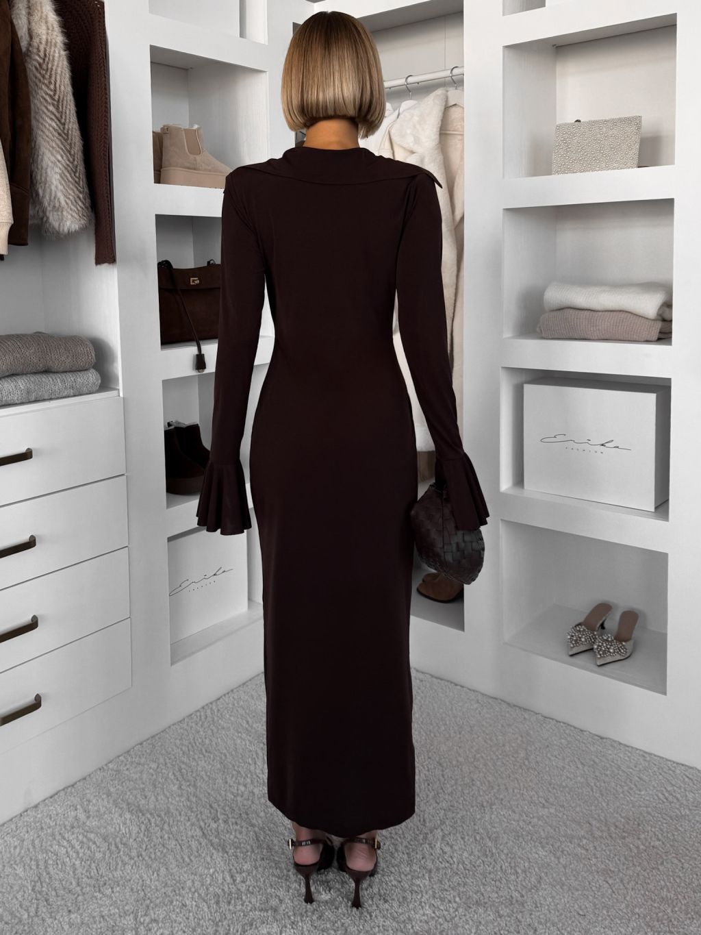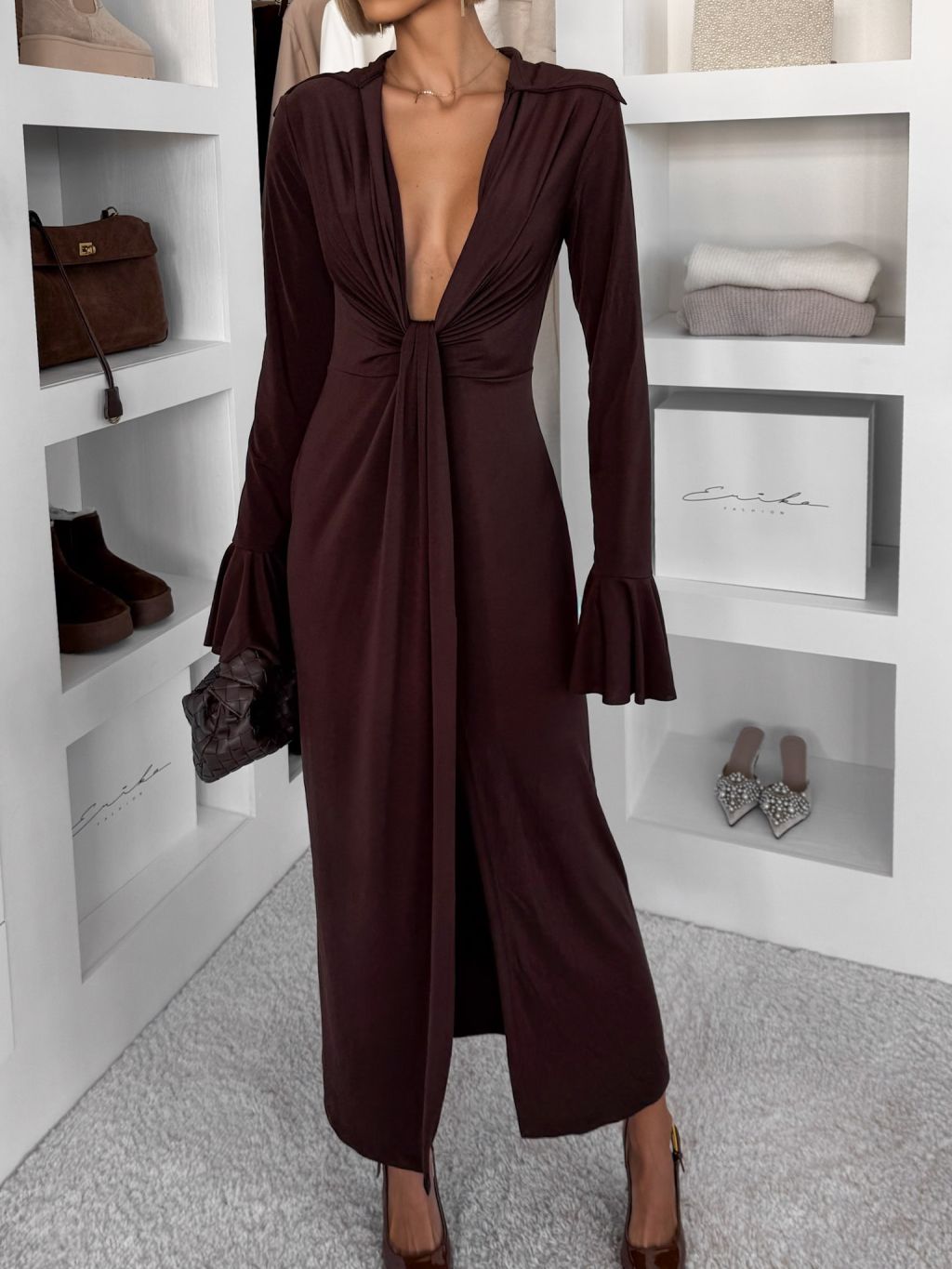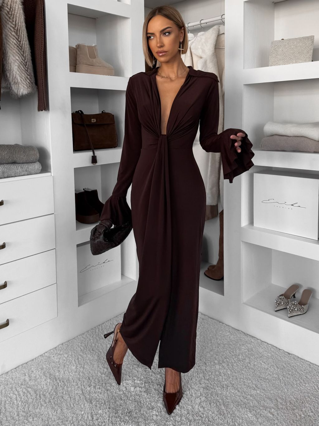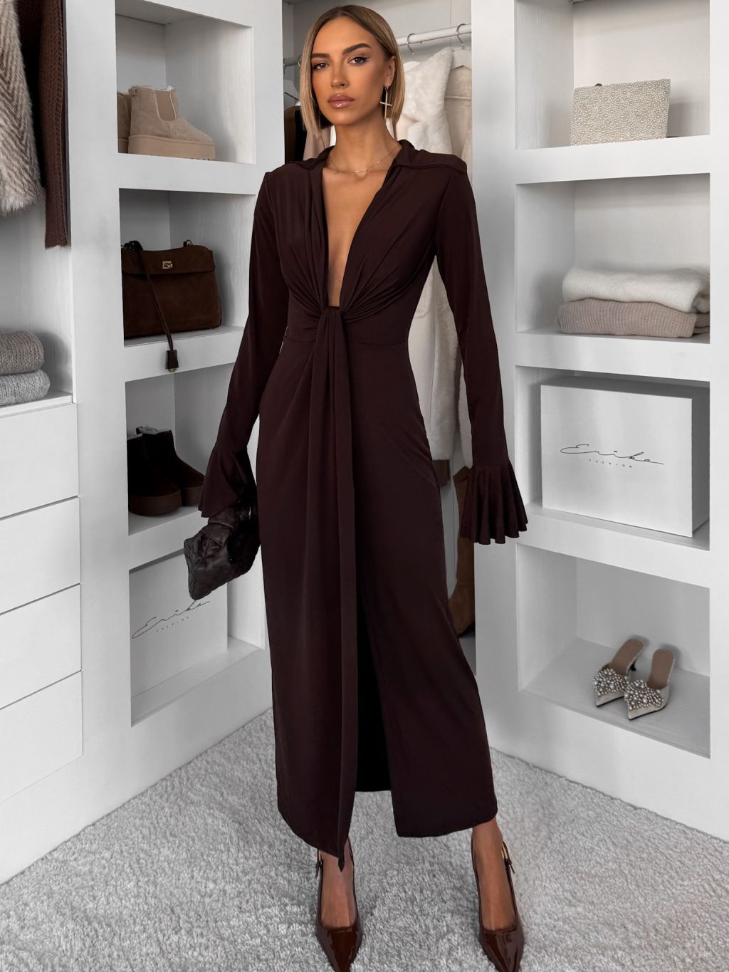 Hnedé dlhé šaty OSTIVEN s hlbovým výstrihom
