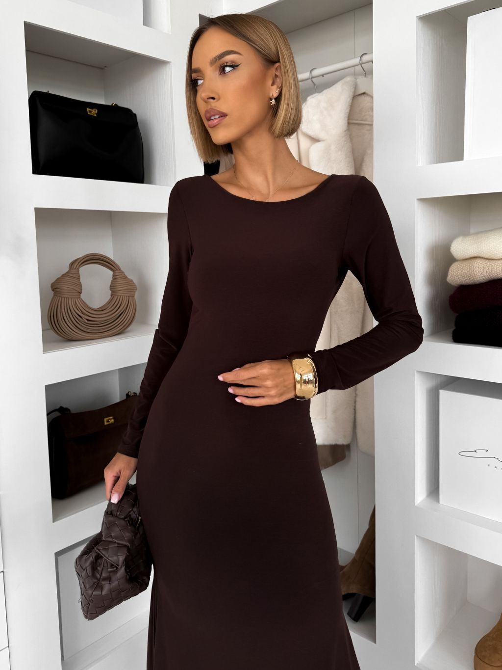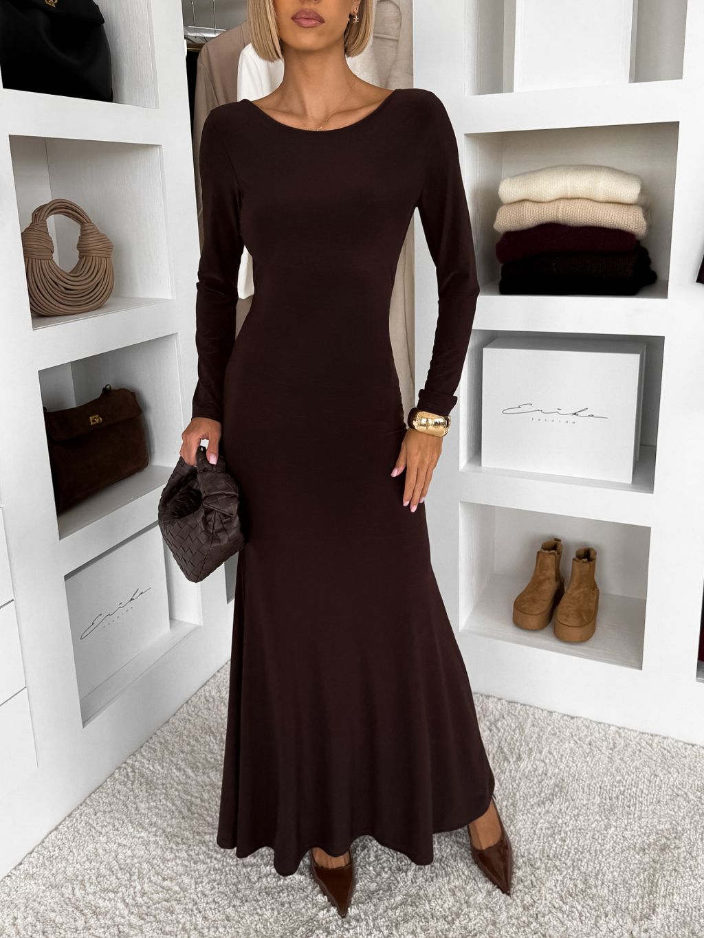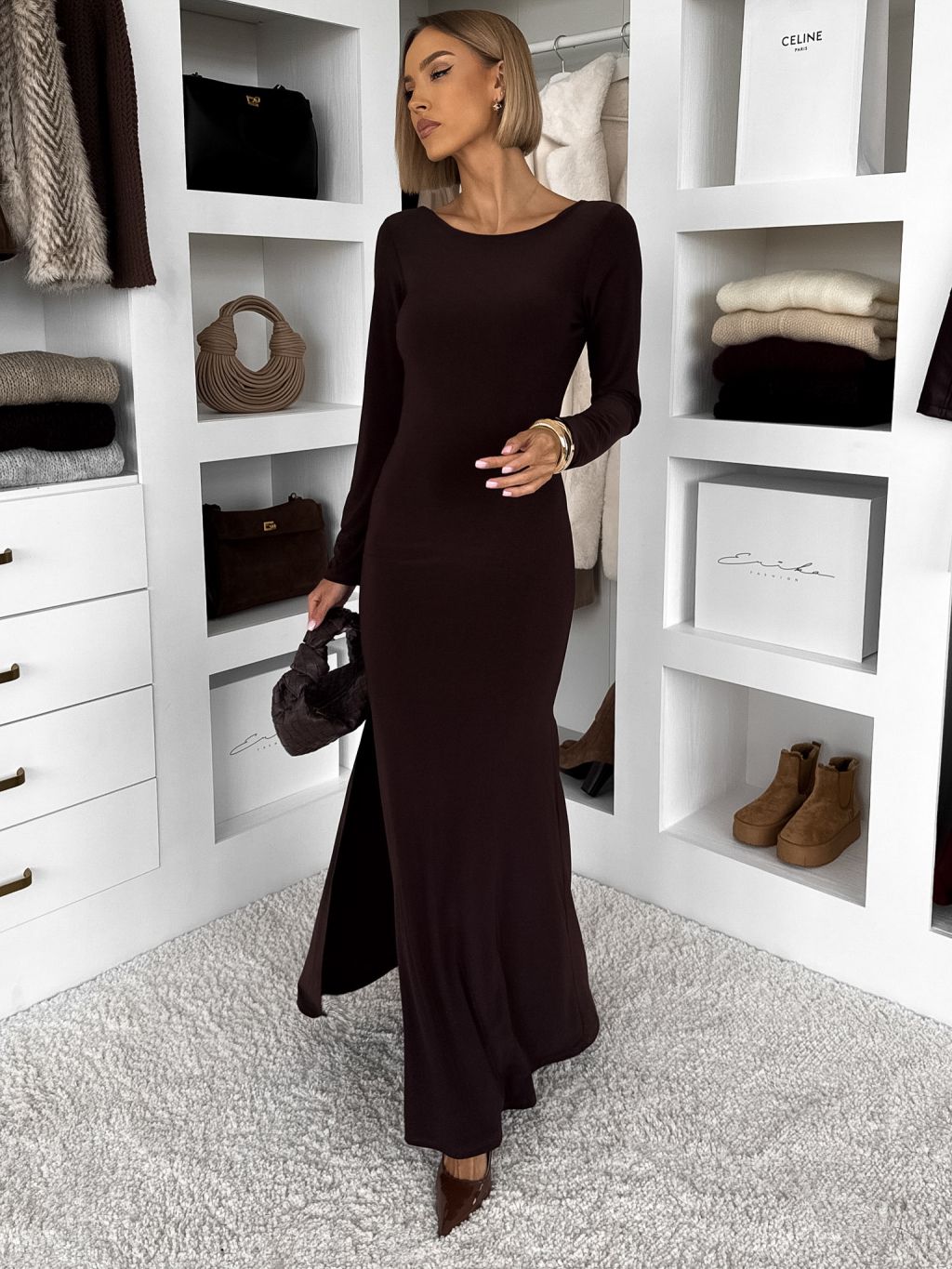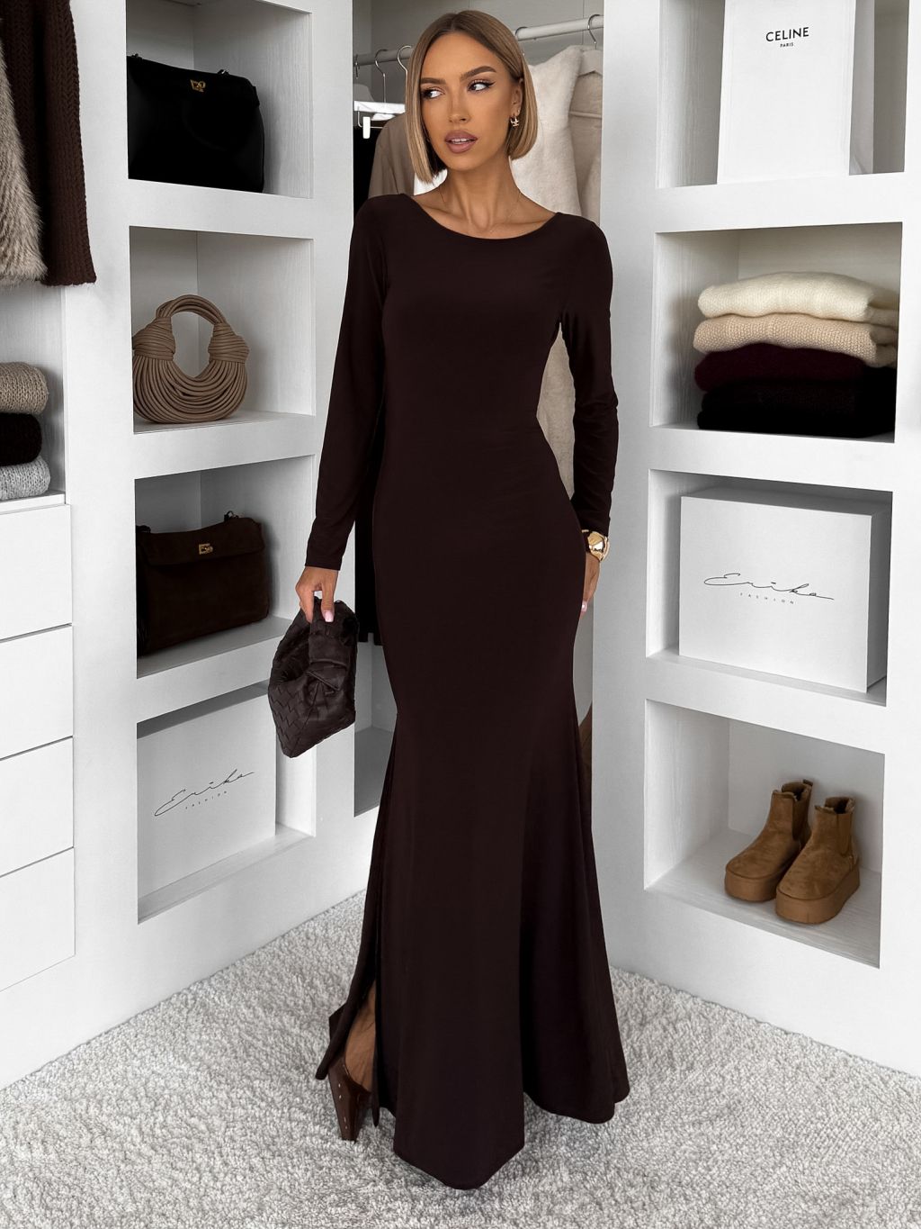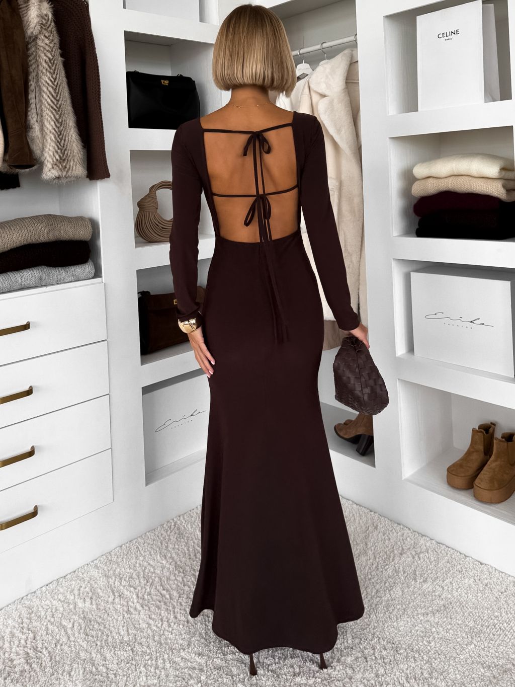Hnedé dlhé spoločenské šaty TAVOLIE s holým chrbtom