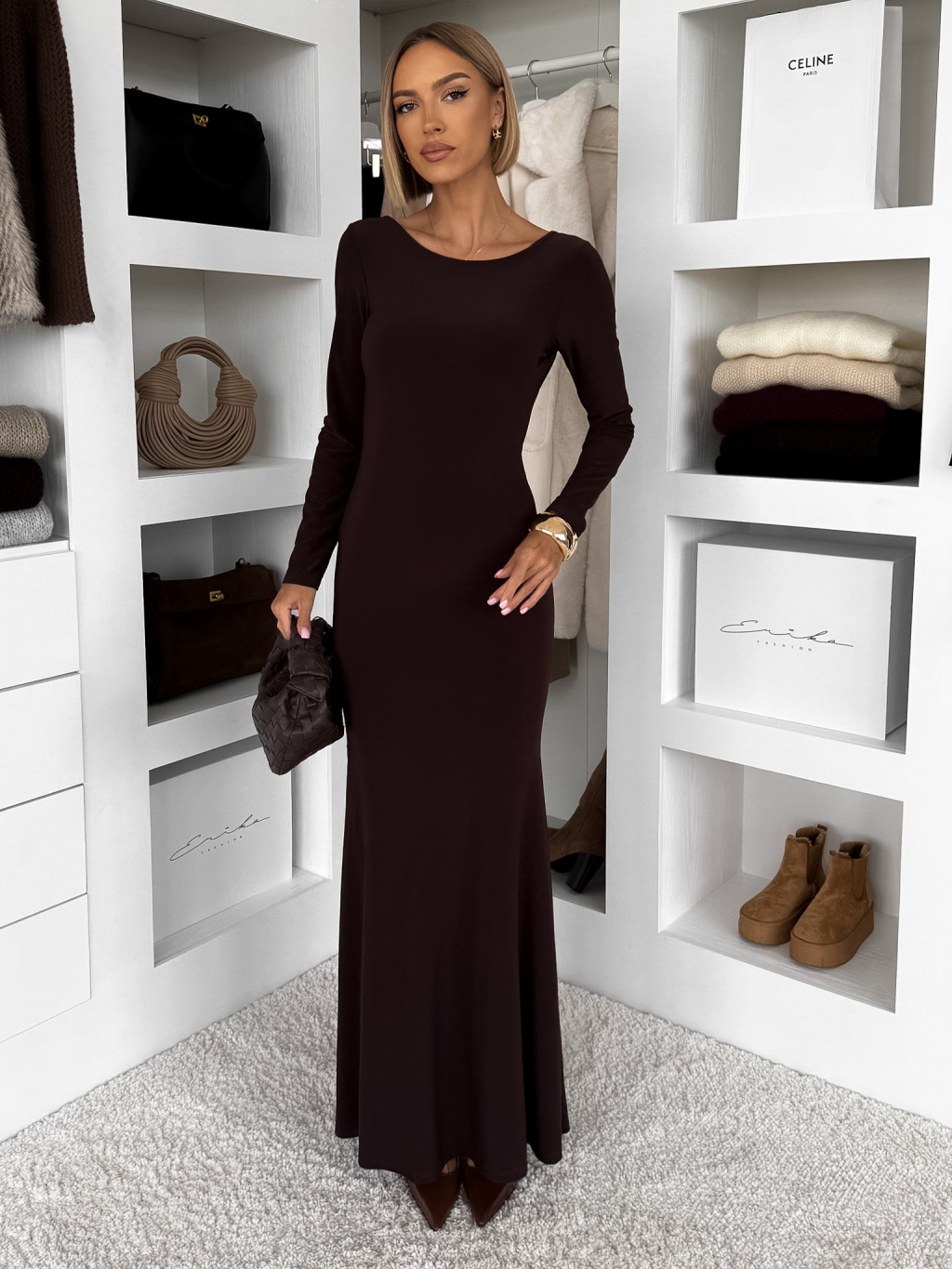 Hnedé dlhé spoločenské šaty TAVOLIE s holým chrbtom