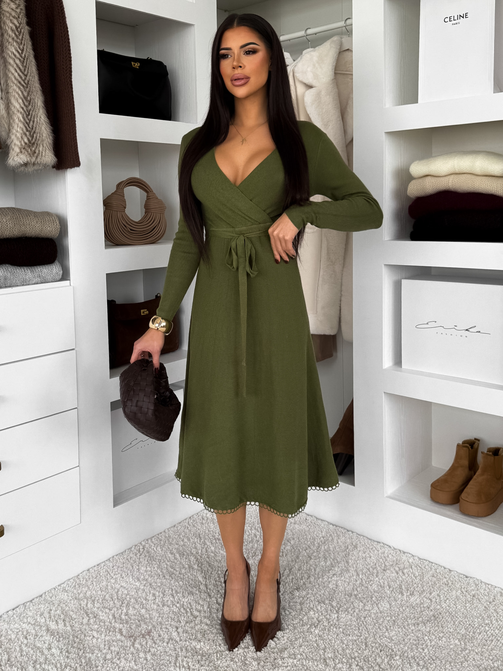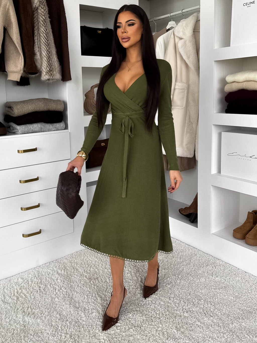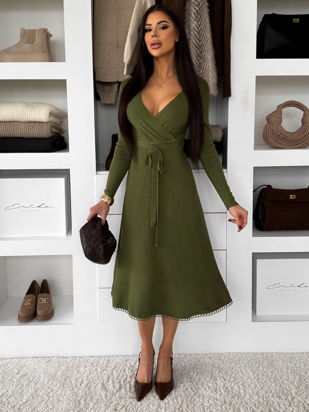 Kaki elegantné áčkové midi šaty TEYVORA s opaskom