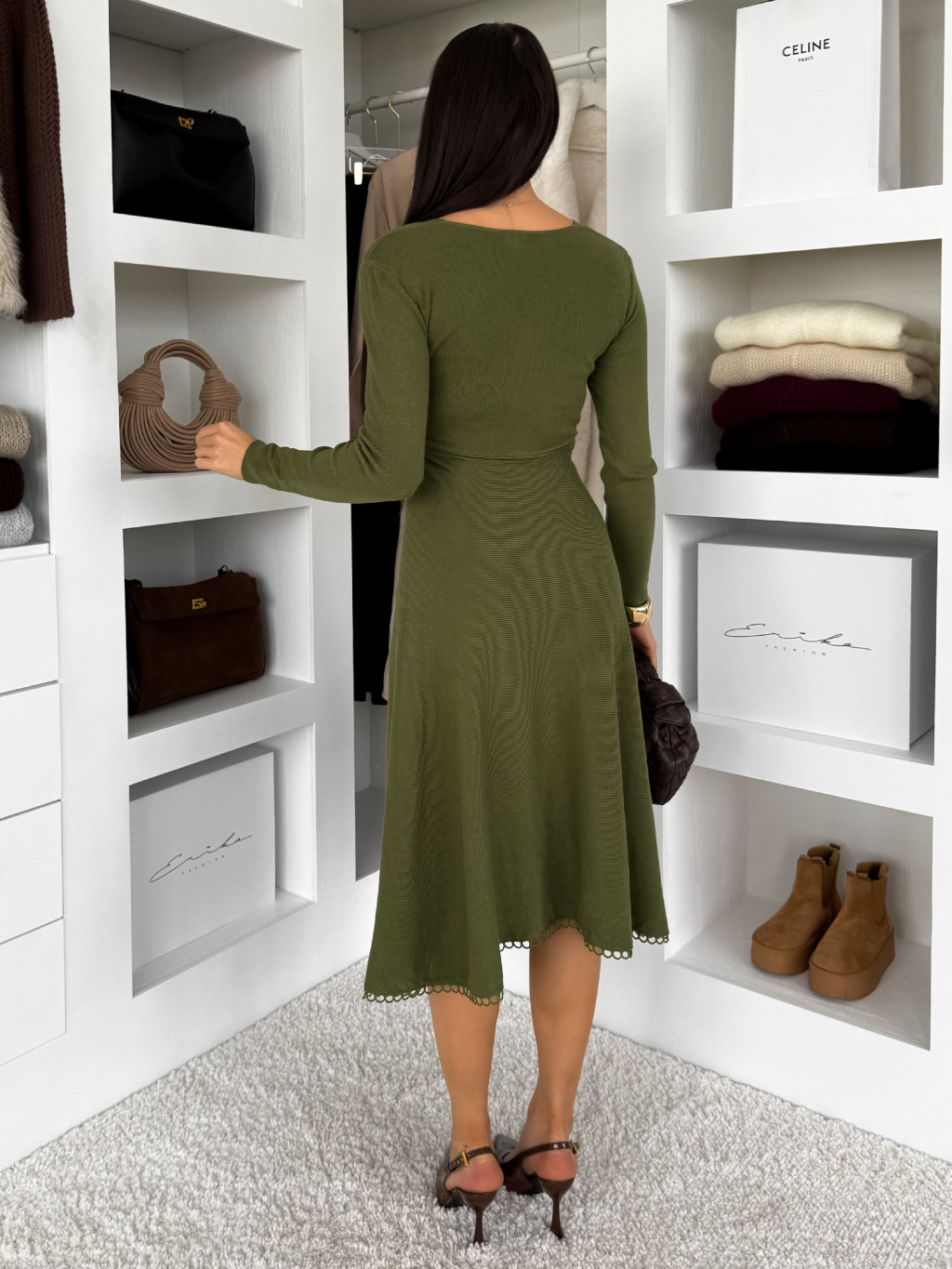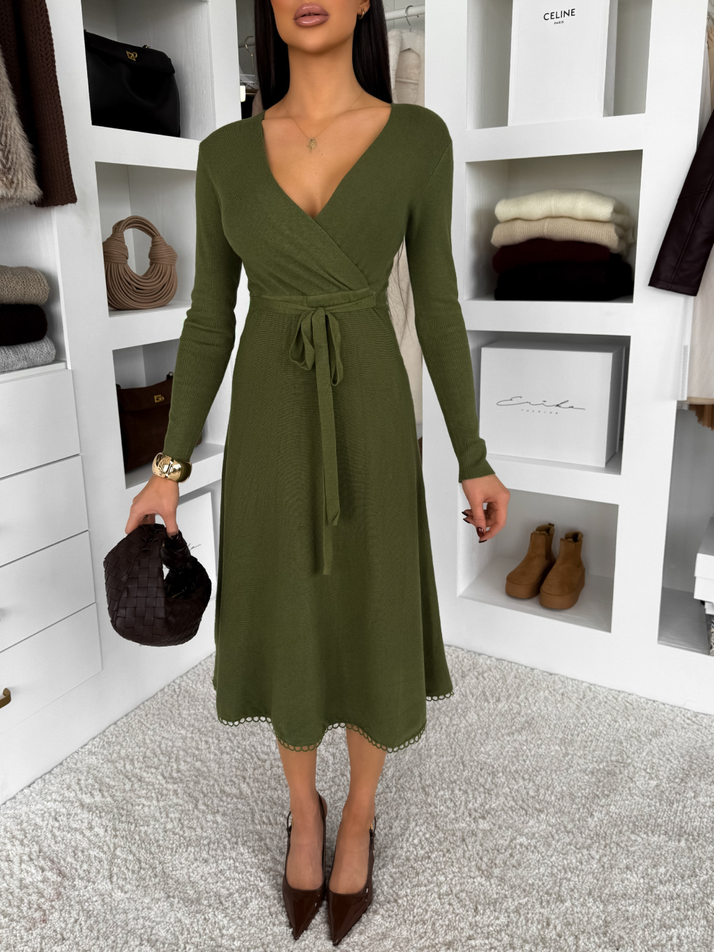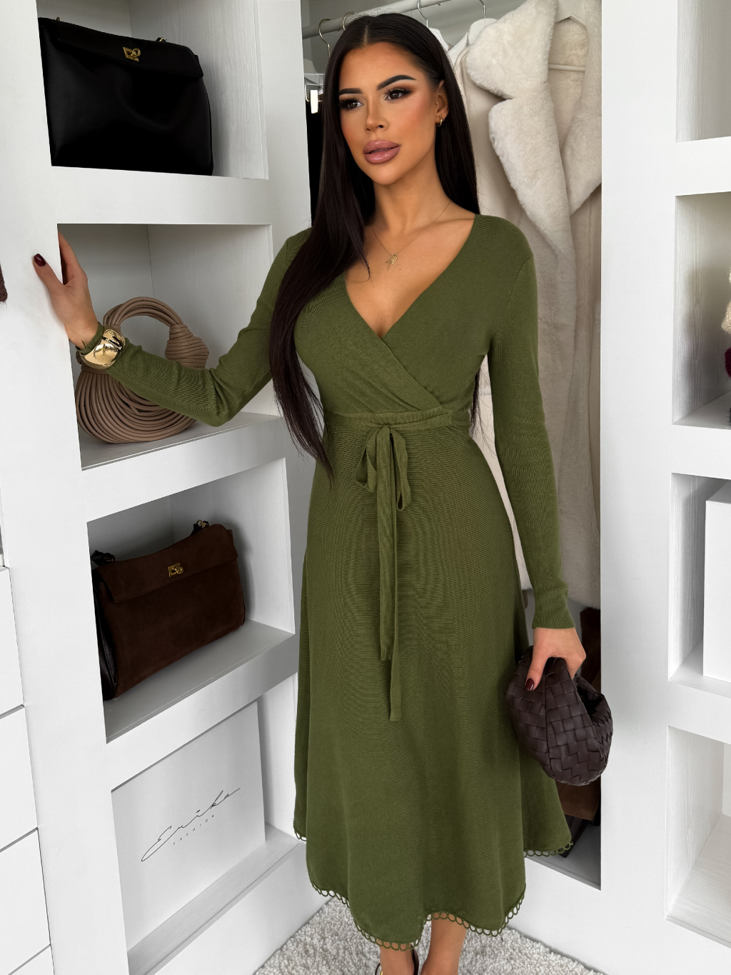 Kaki elegantné áčkové midi šaty TEYVORA s opaskom