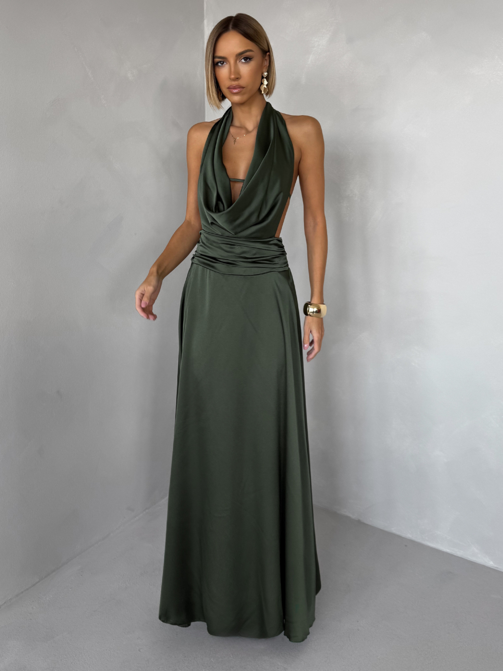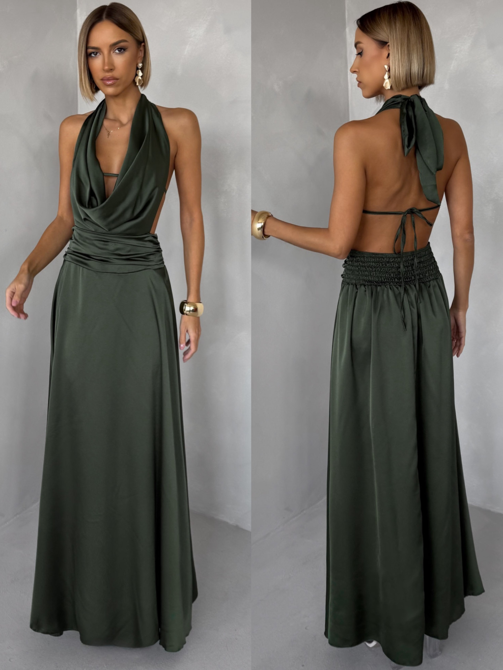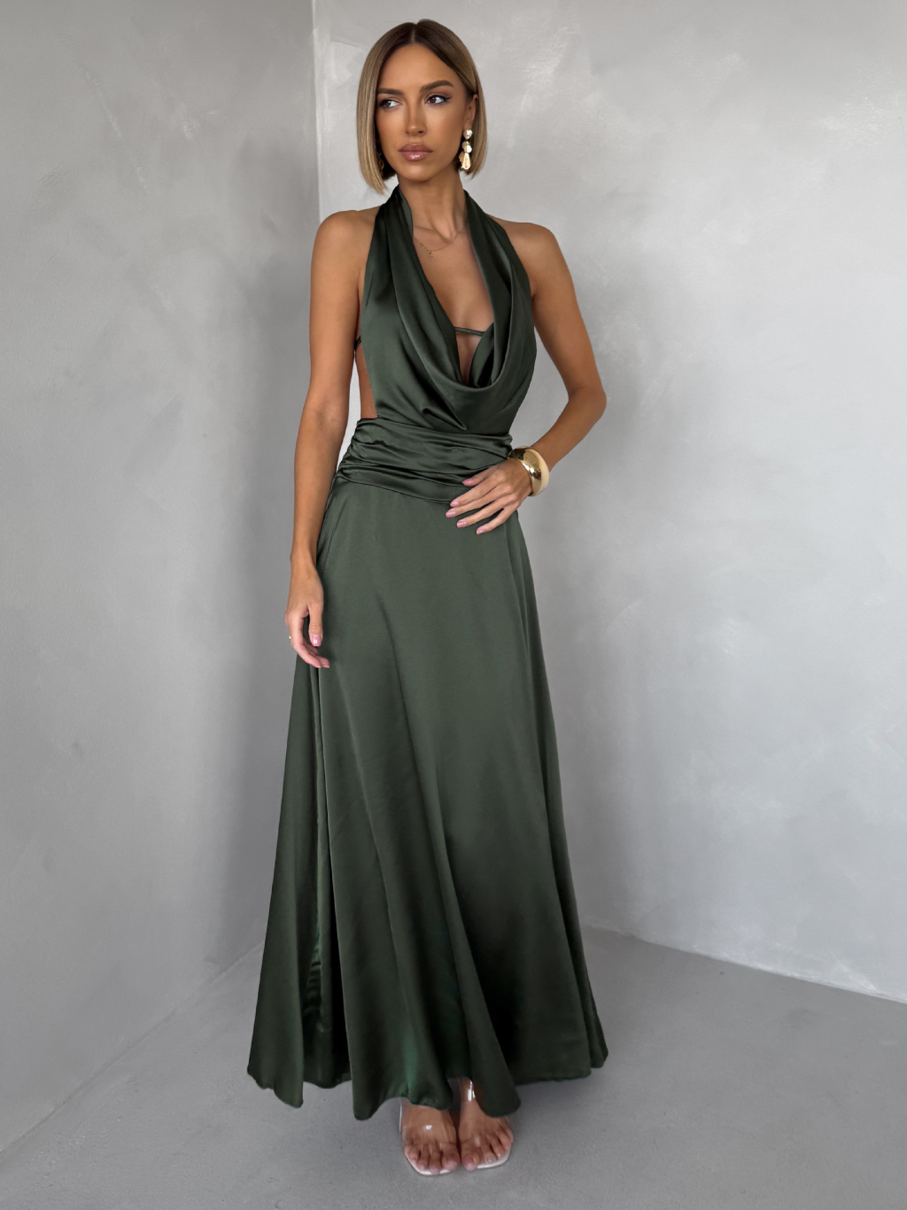 Kaki saténové dlhé šaty FANDARI s výstrihom
