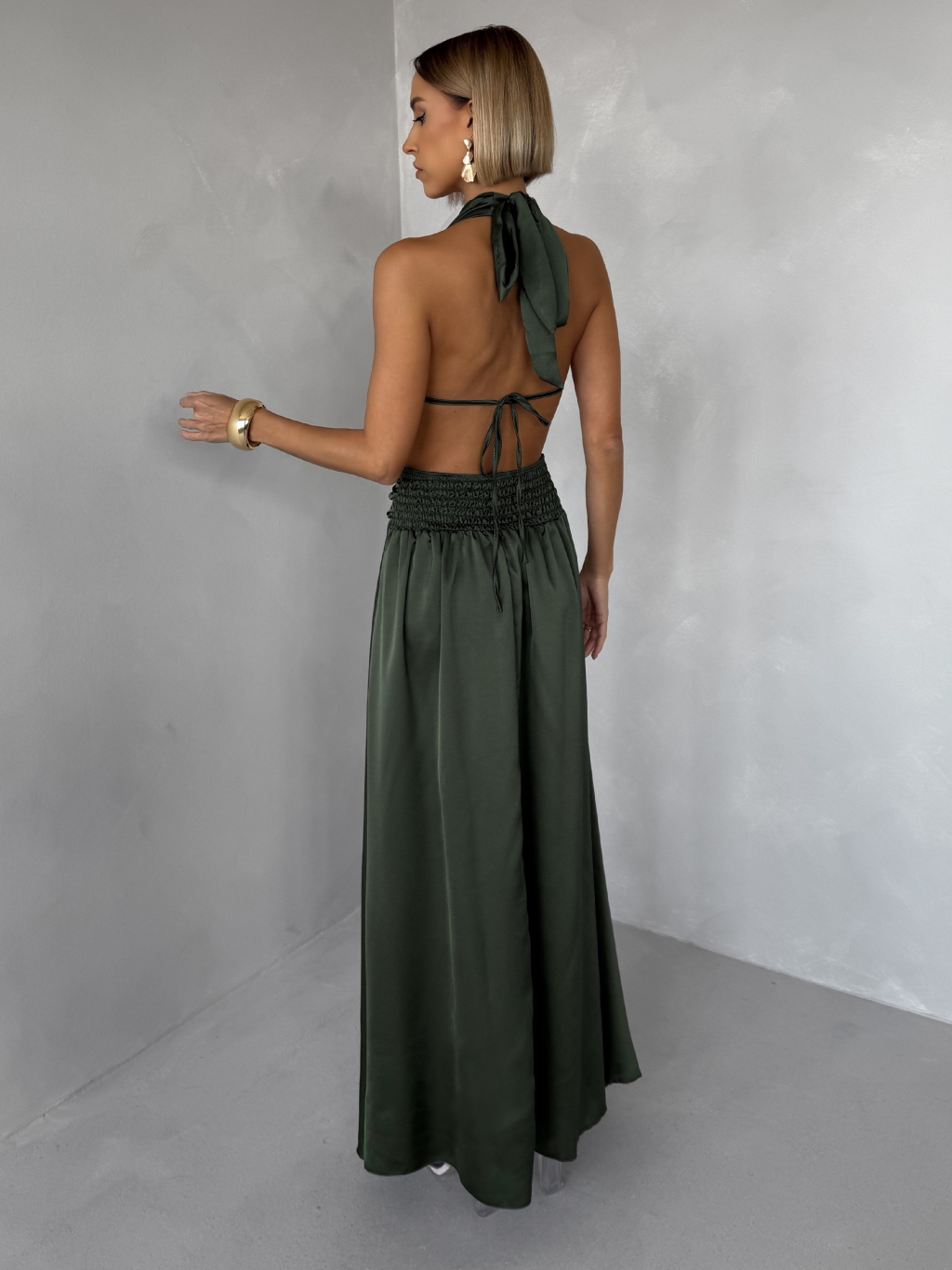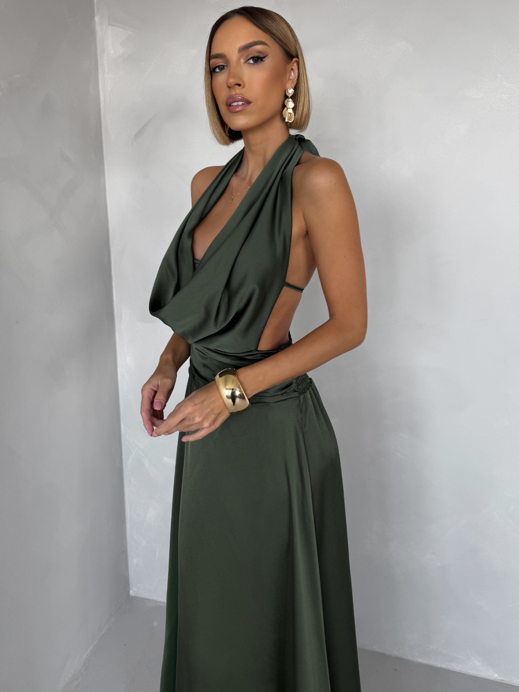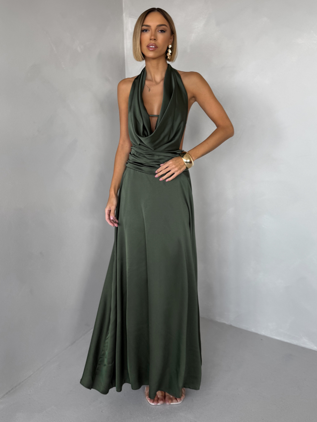 Kaki saténové dlhé šaty FANDARI s výstrihom
