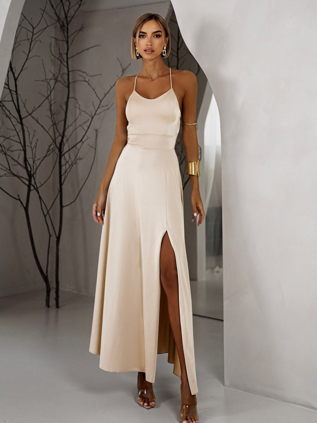 Krémové saténové dlhé šaty SIMUEL so šnurovaním