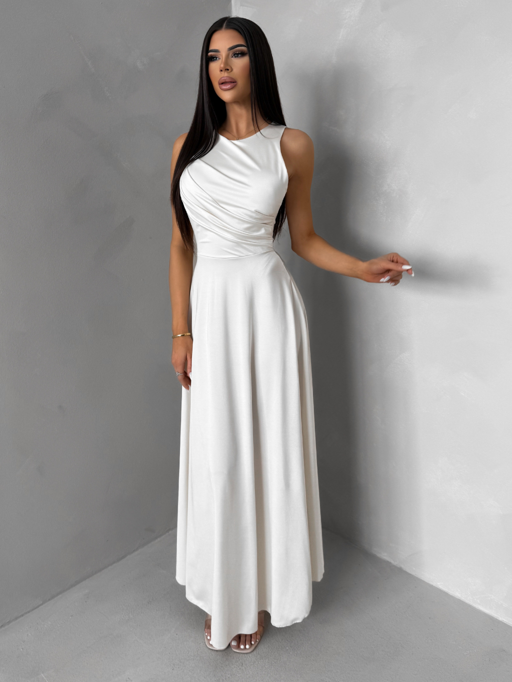 Krémové spoločenské jednoduché dlhé šaty TEMIRA
