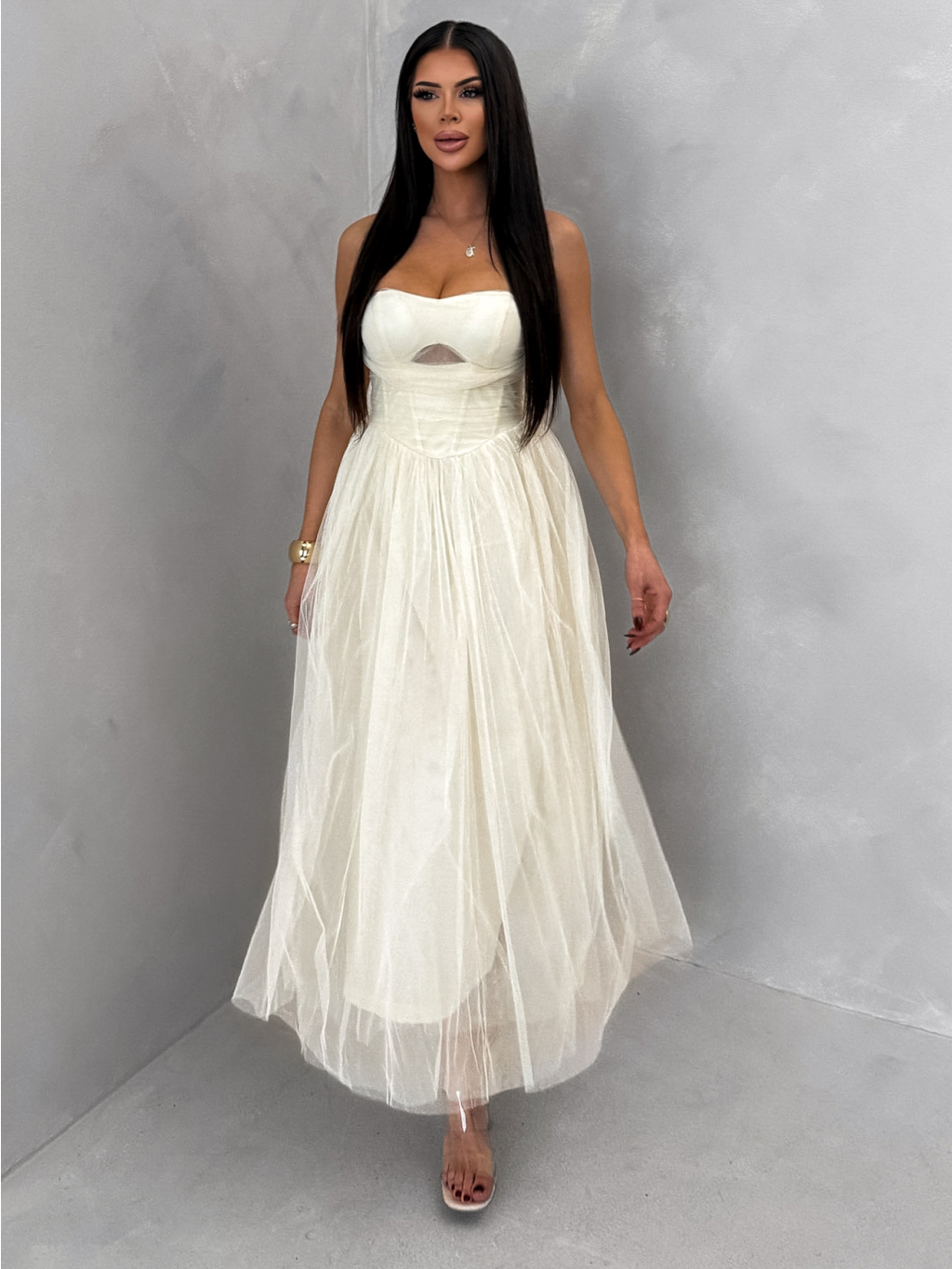 Krémové spoločenské tylové midi šaty SOLAVIE