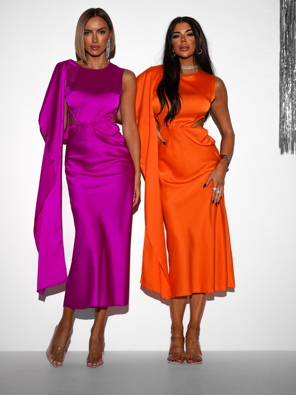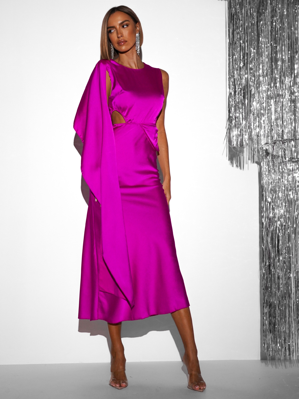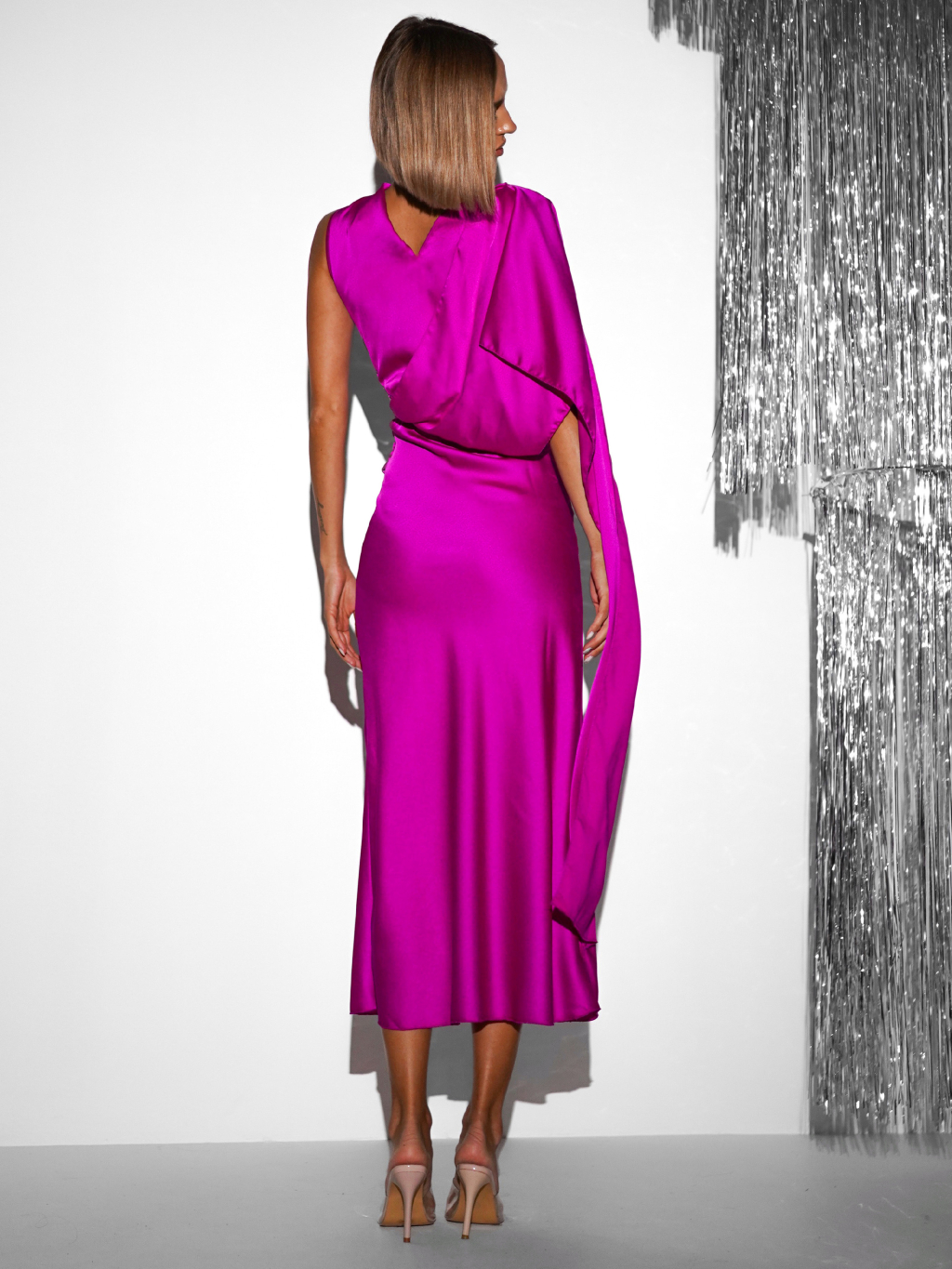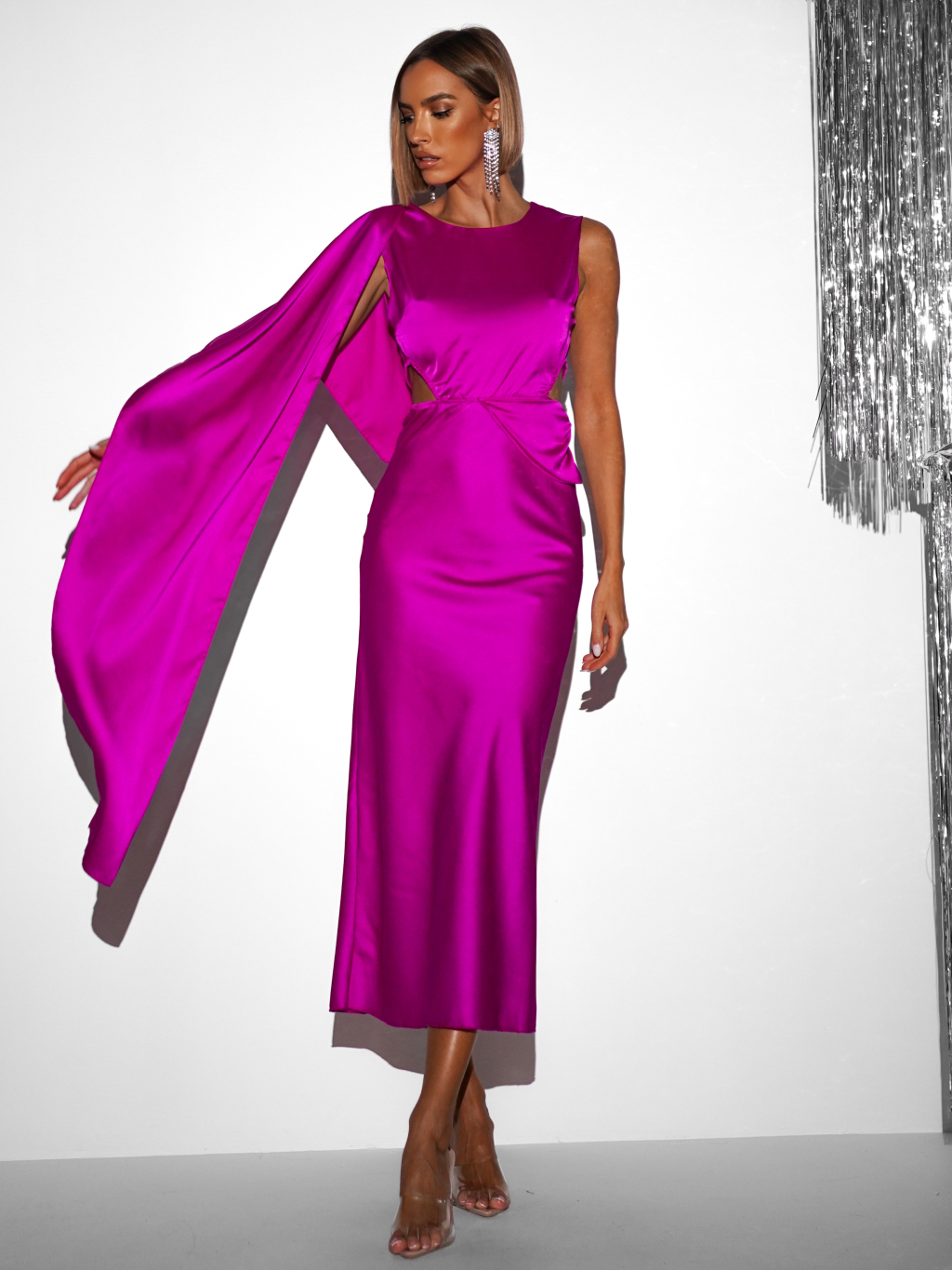 Magenta saténové dlhé šaty JUTTA s prestrihmi