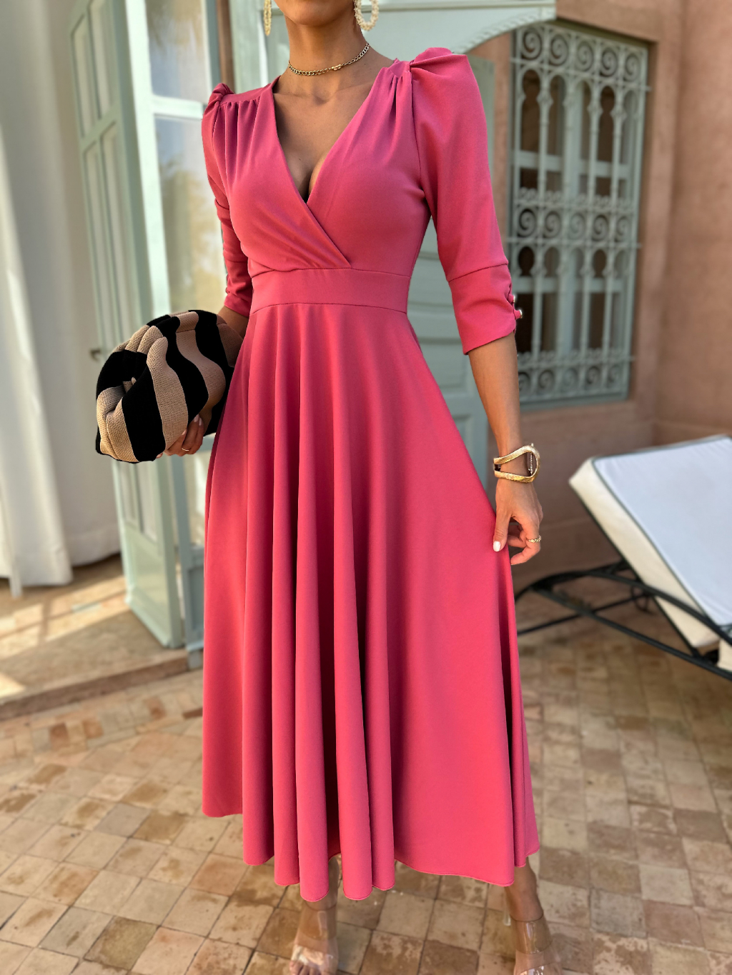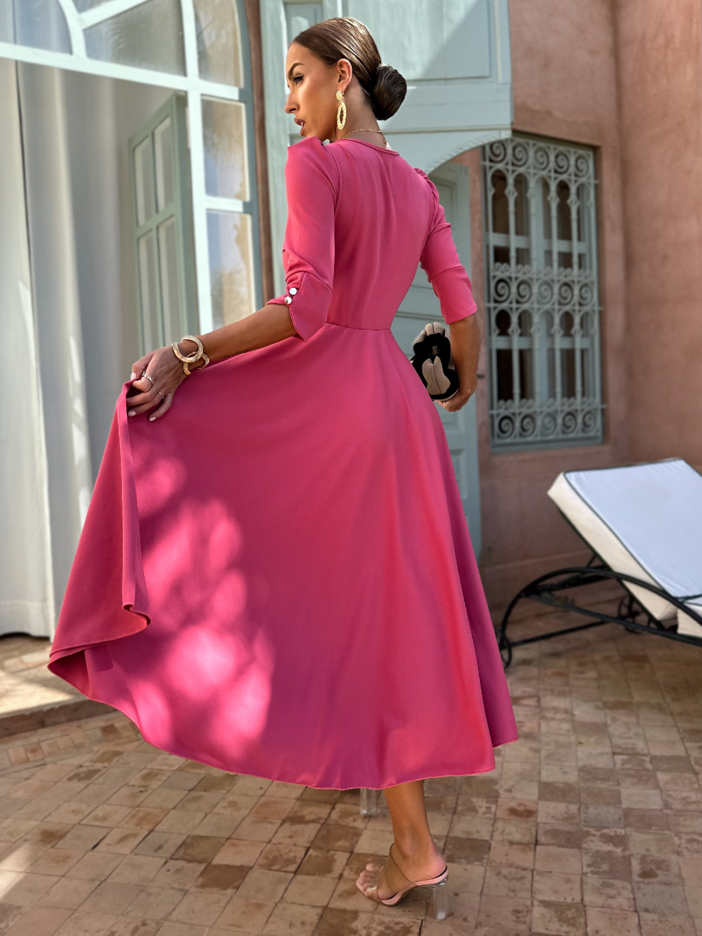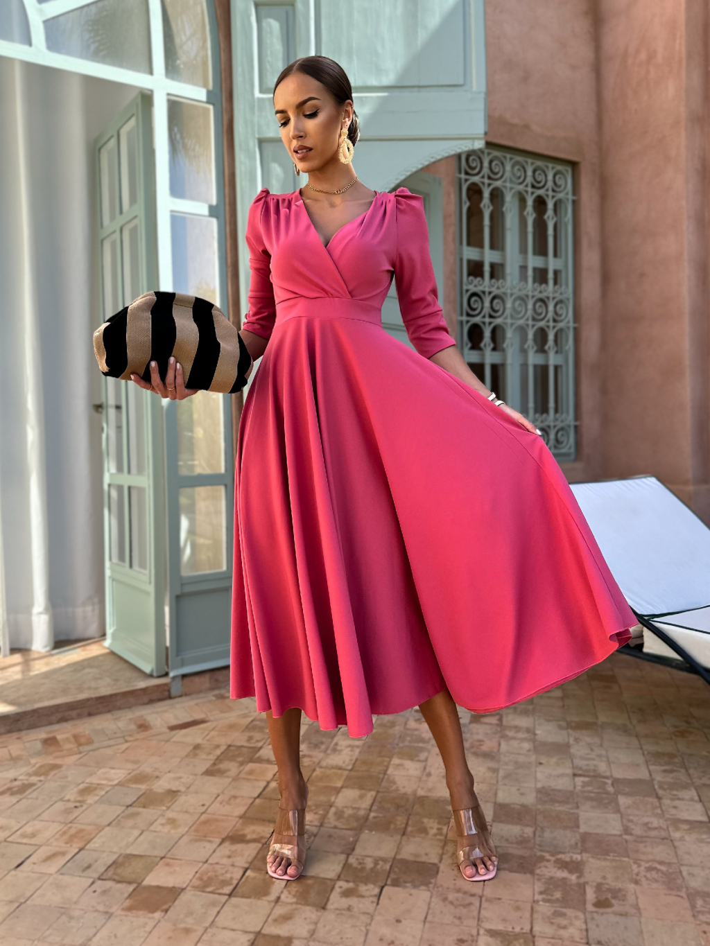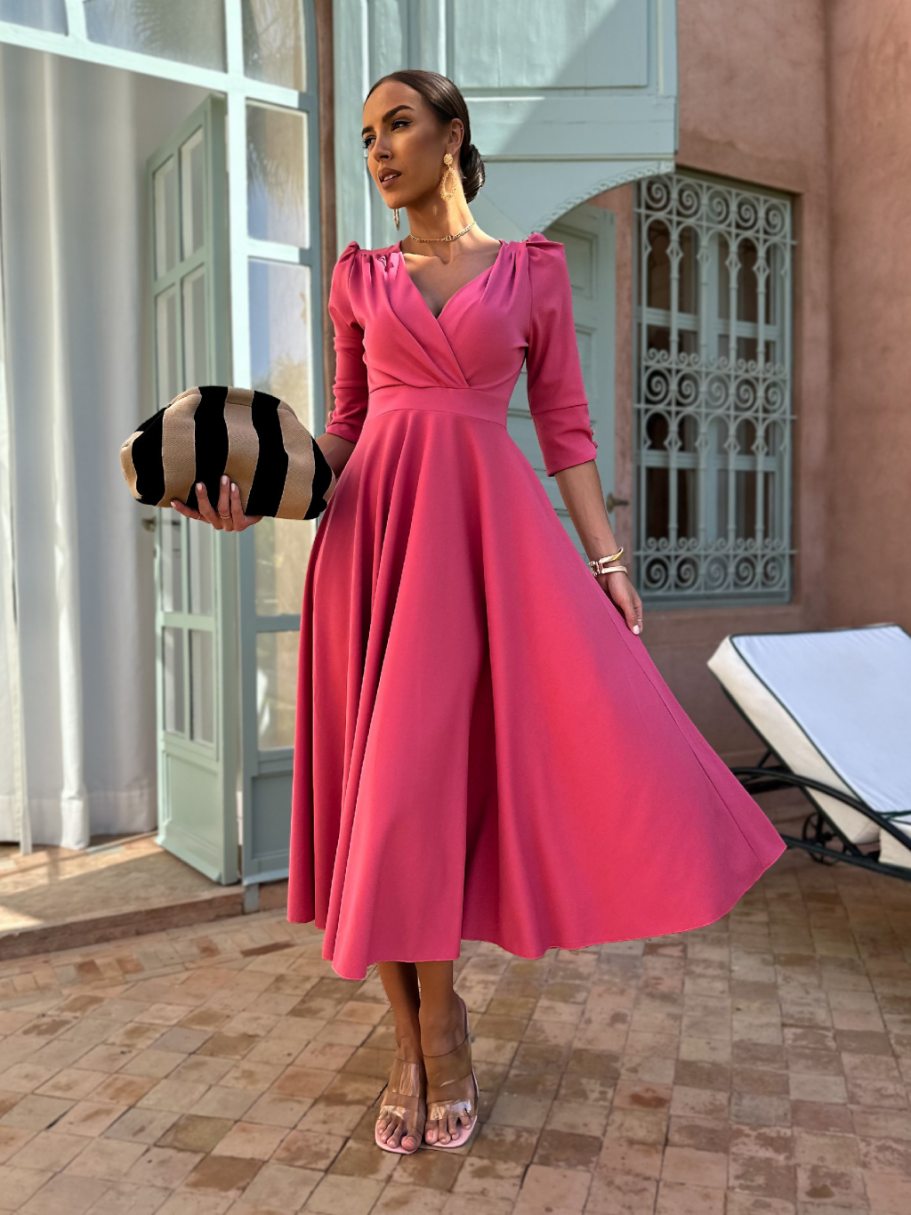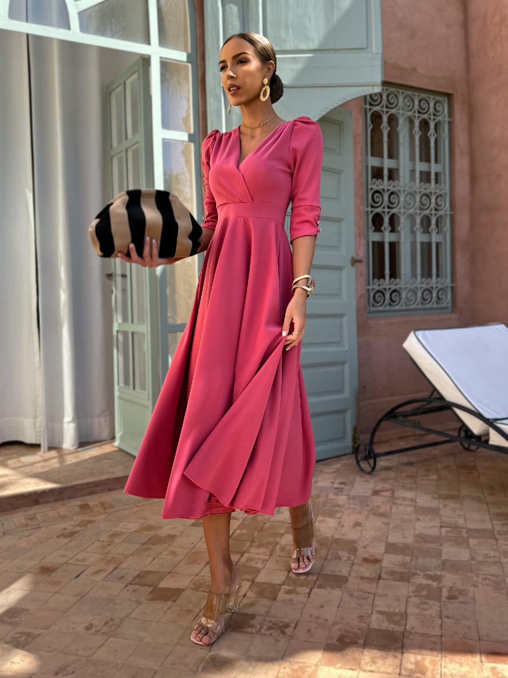 Malinové dlhé vypasované šaty LAPATA s výstrihom