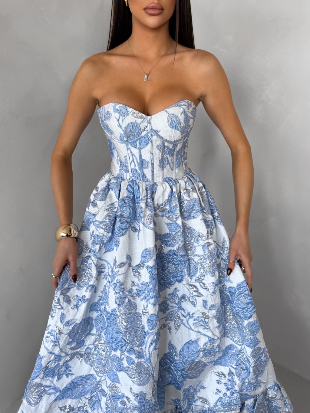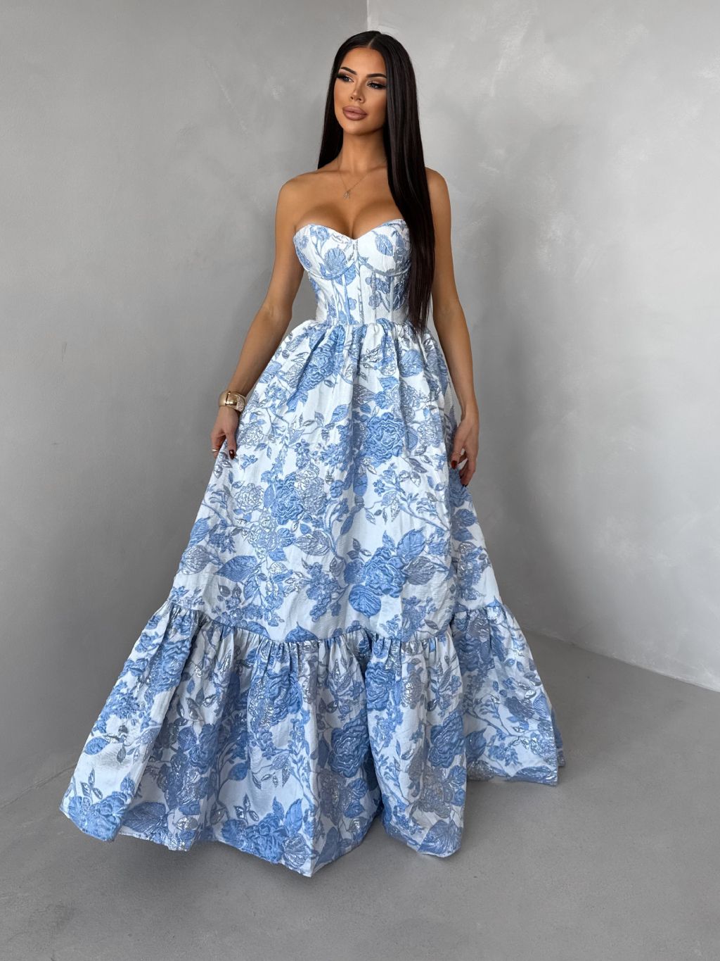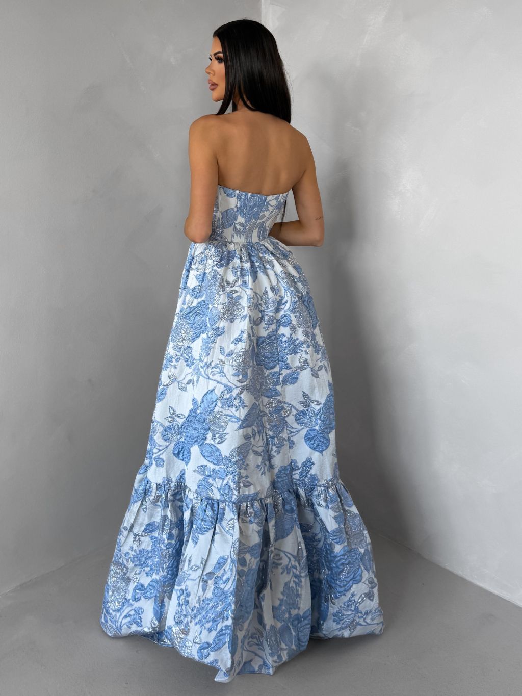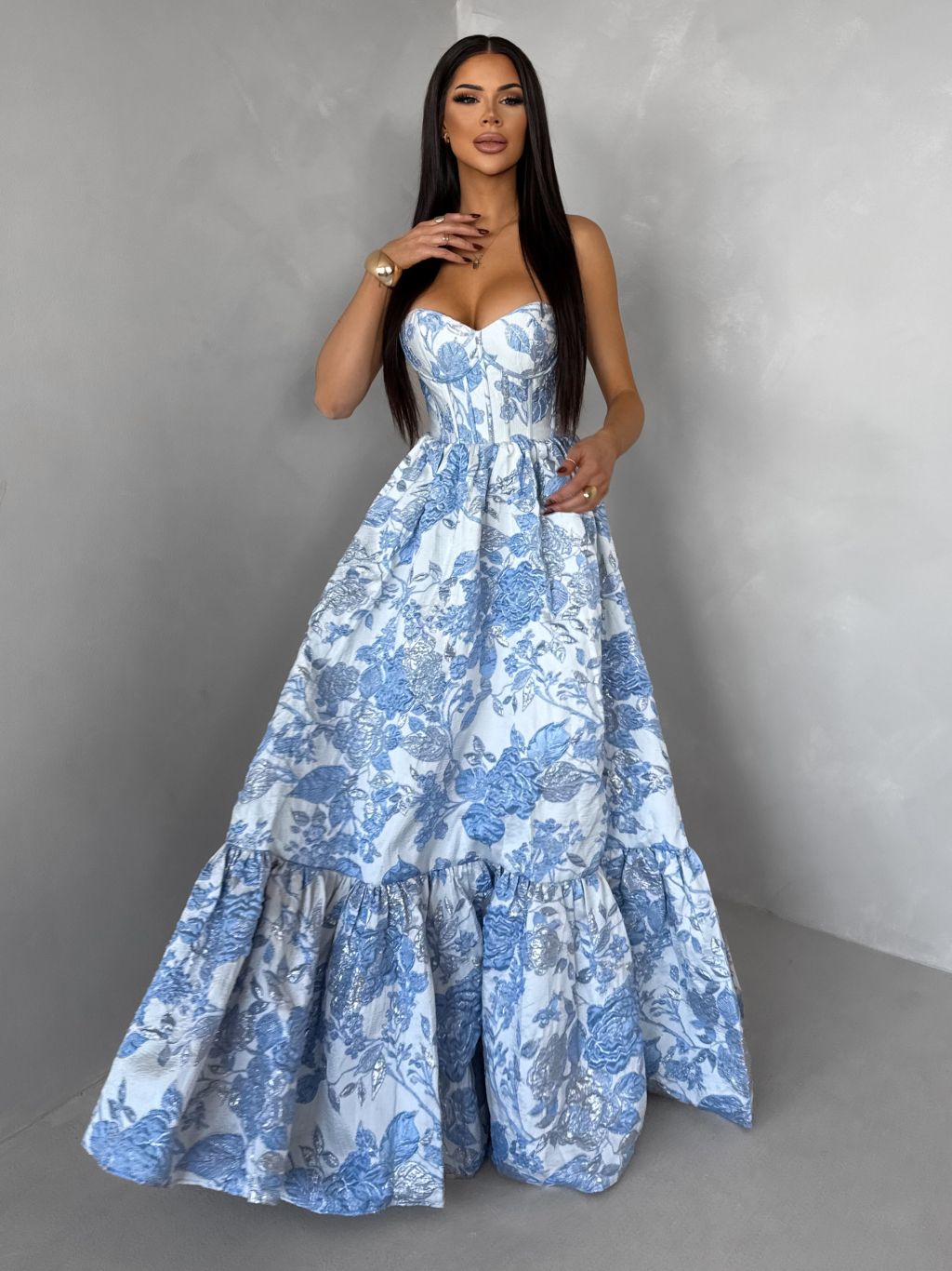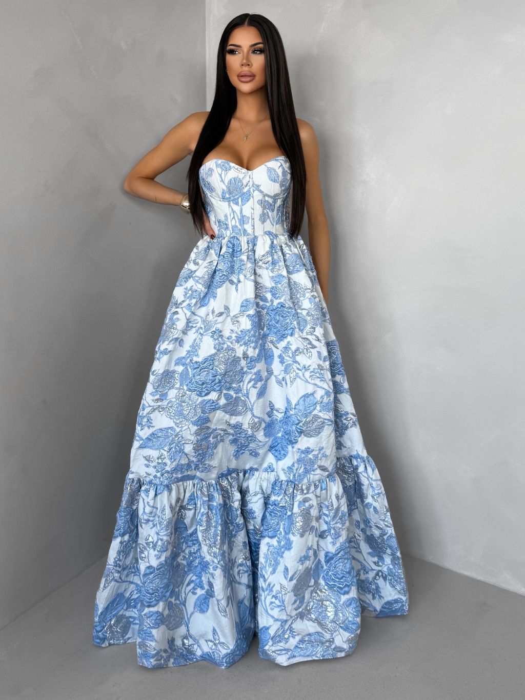 Modré spoločenské dlhé šaty VENOLIA s kvetinovým vzorom