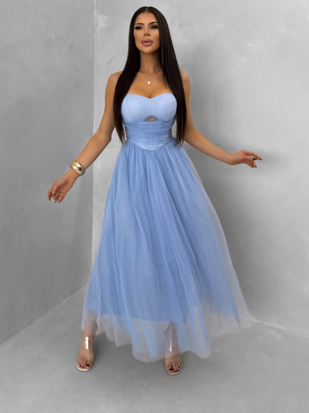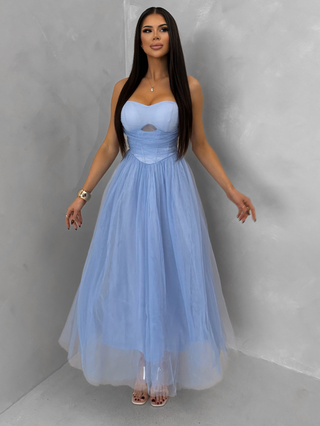 Modré spoločenské tylové midi šaty SOLAVIE