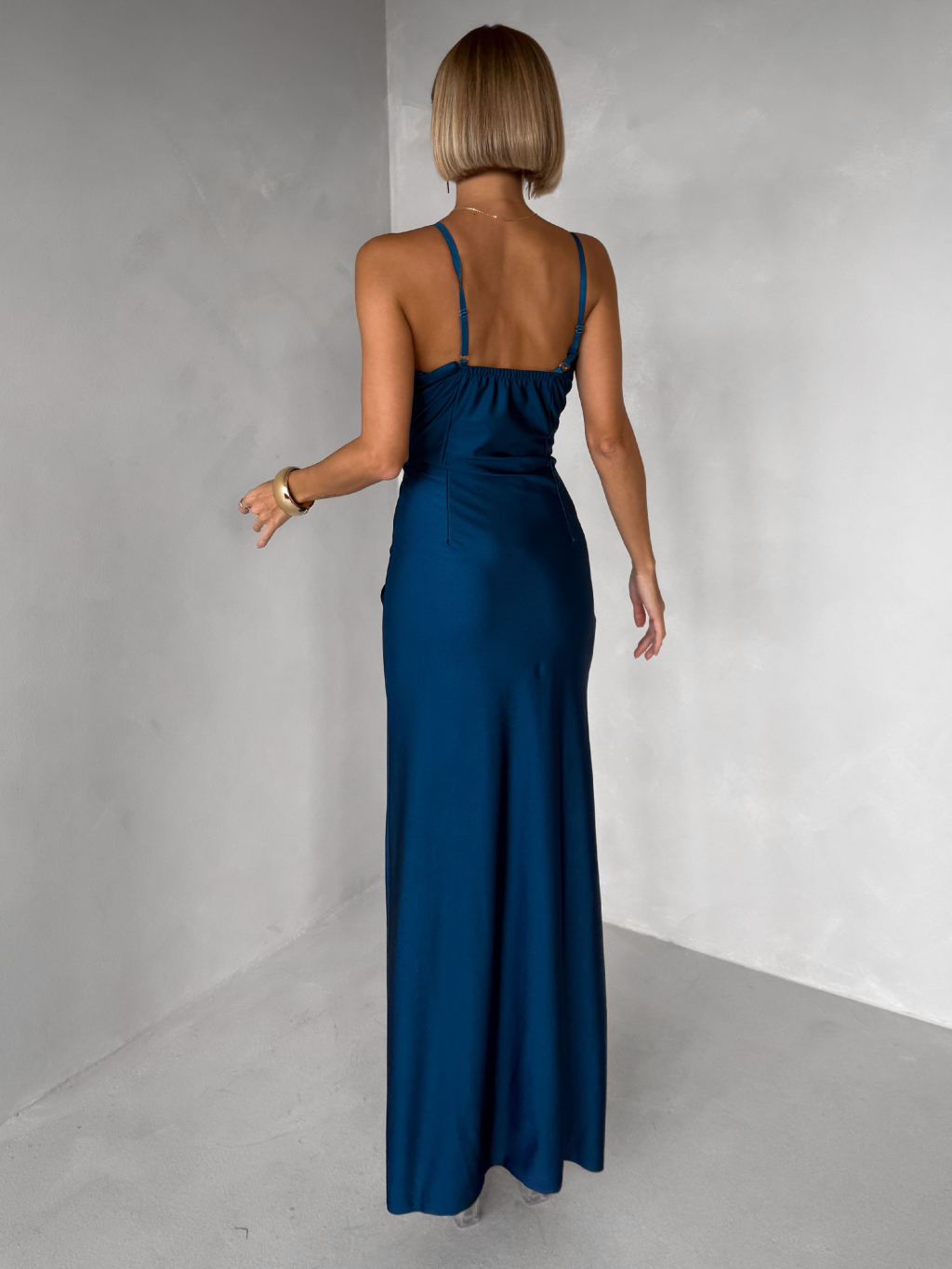 Petrolejová dlhé saténové spoločenské šaty ORIXY s výstrihom