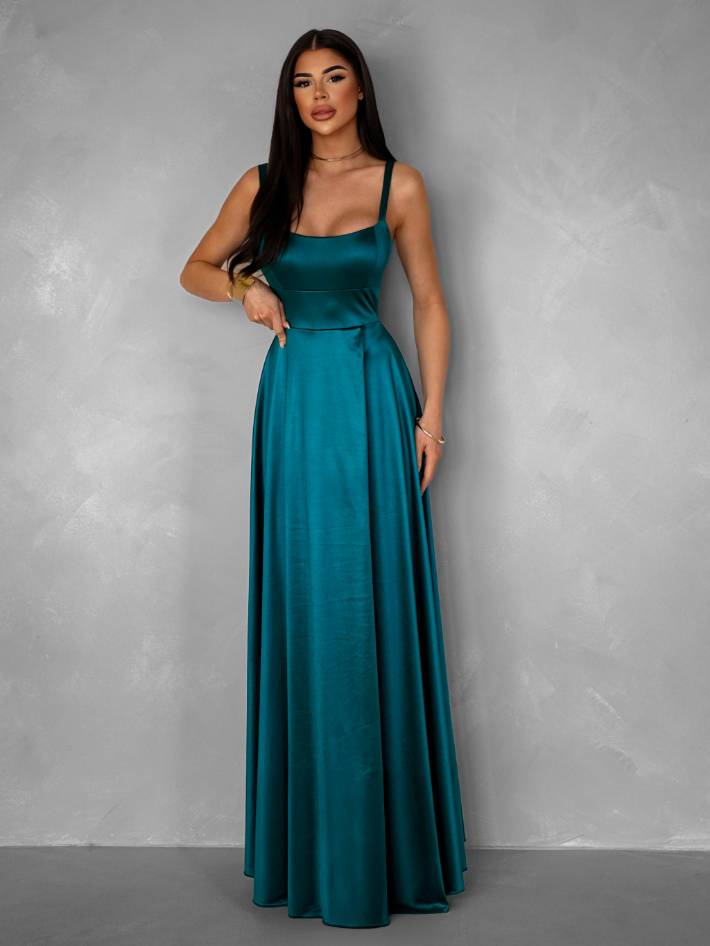 Petrolejové dlhé saténové šaty HELSIN na ramienka