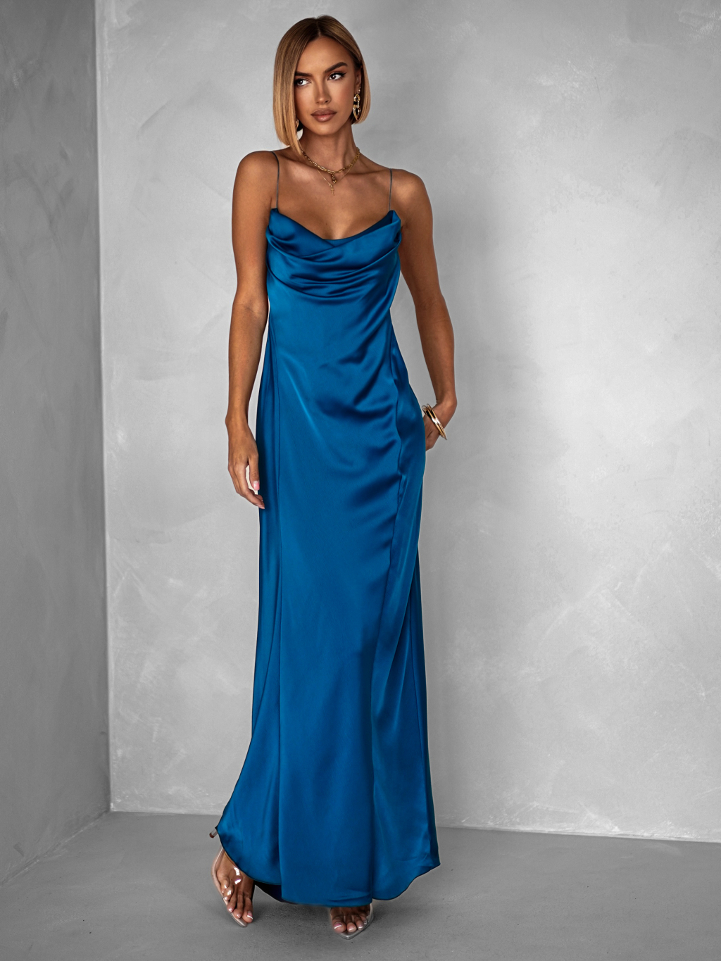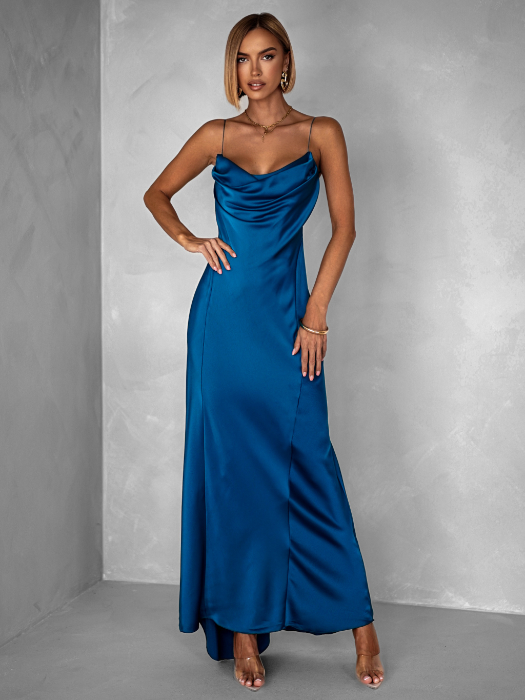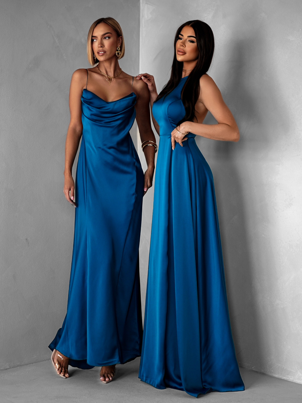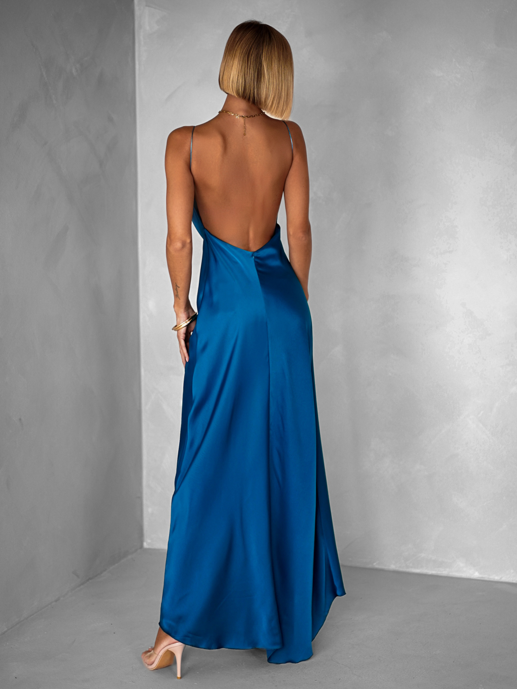 Petrolejové dlhé saténové šaty UNUTA s odhaleným chrbtom