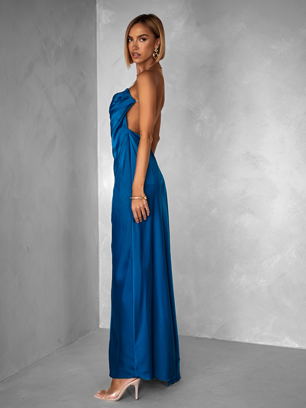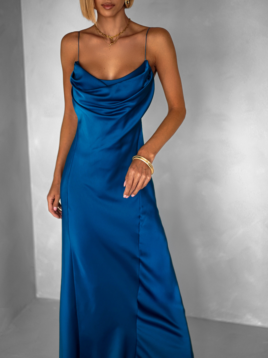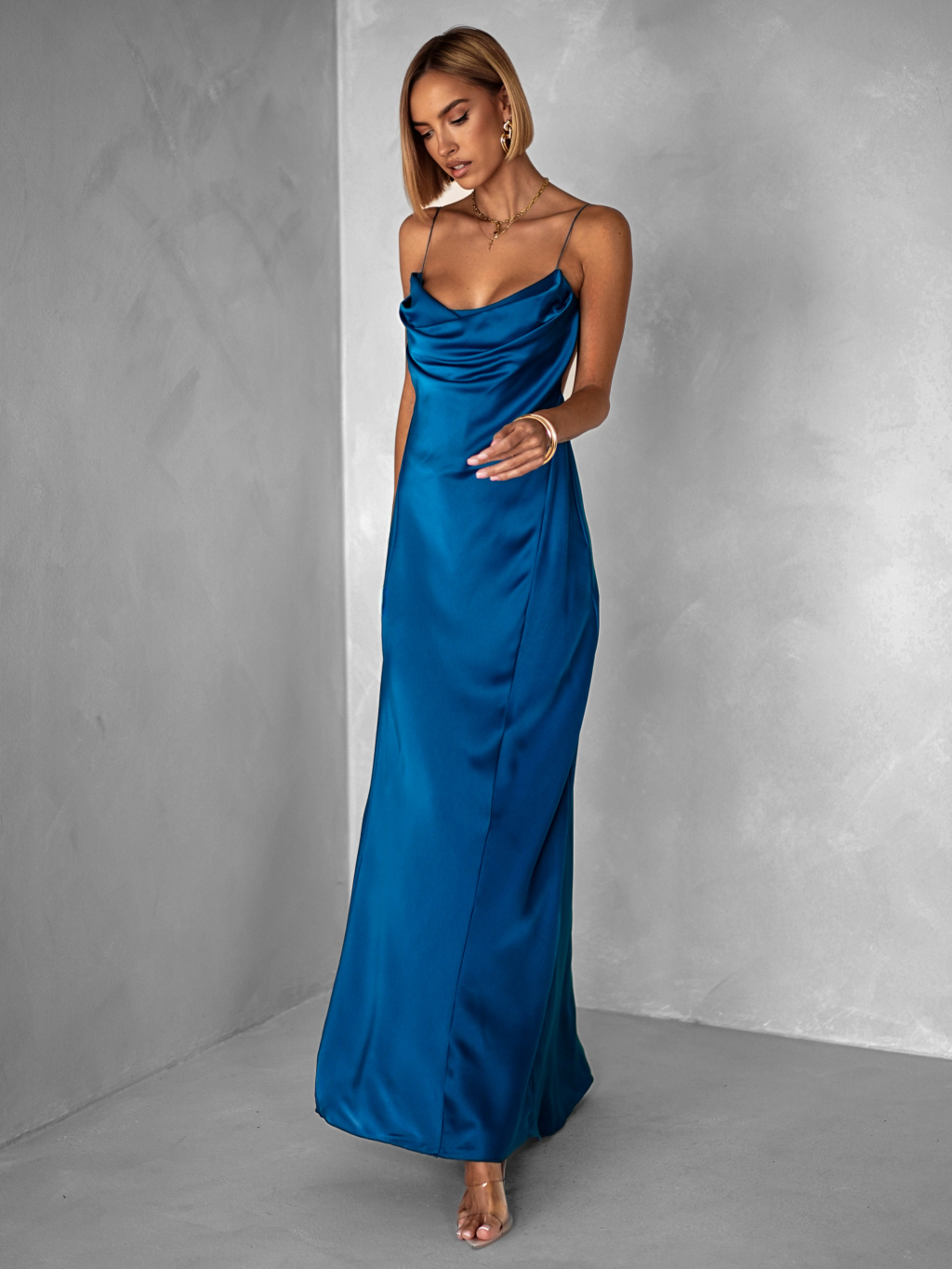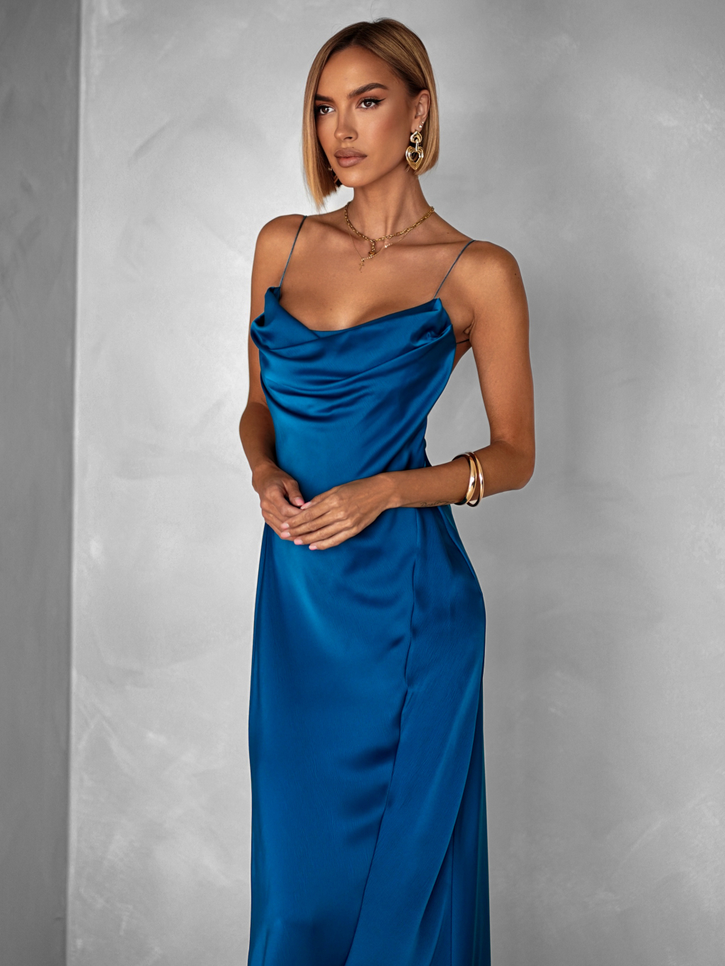 Petrolejové dlhé saténové šaty UNUTA s odhaleným chrbtom