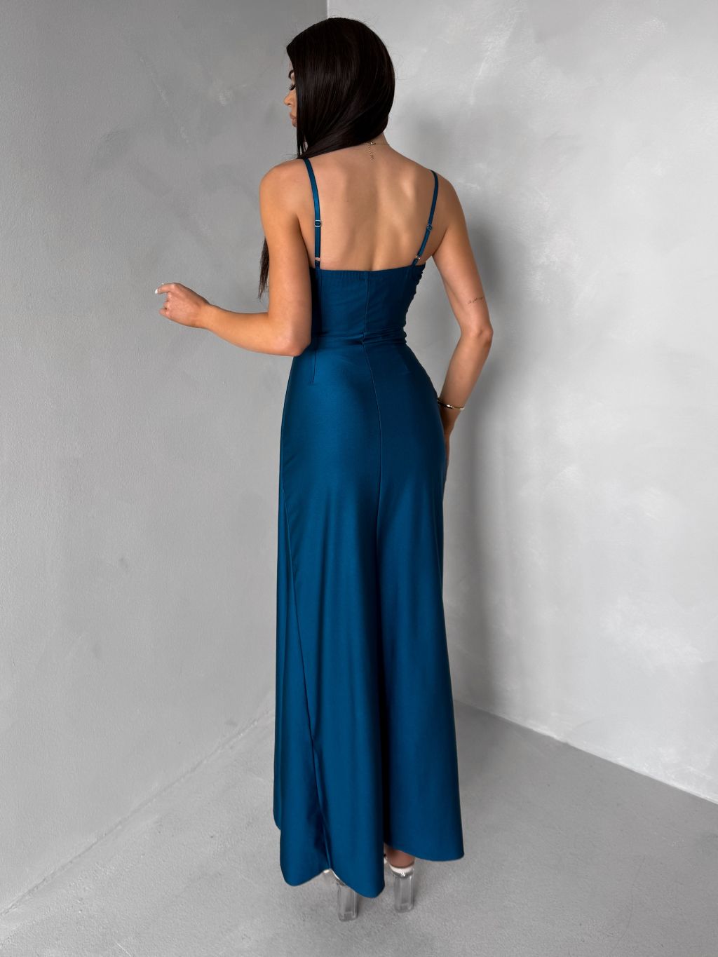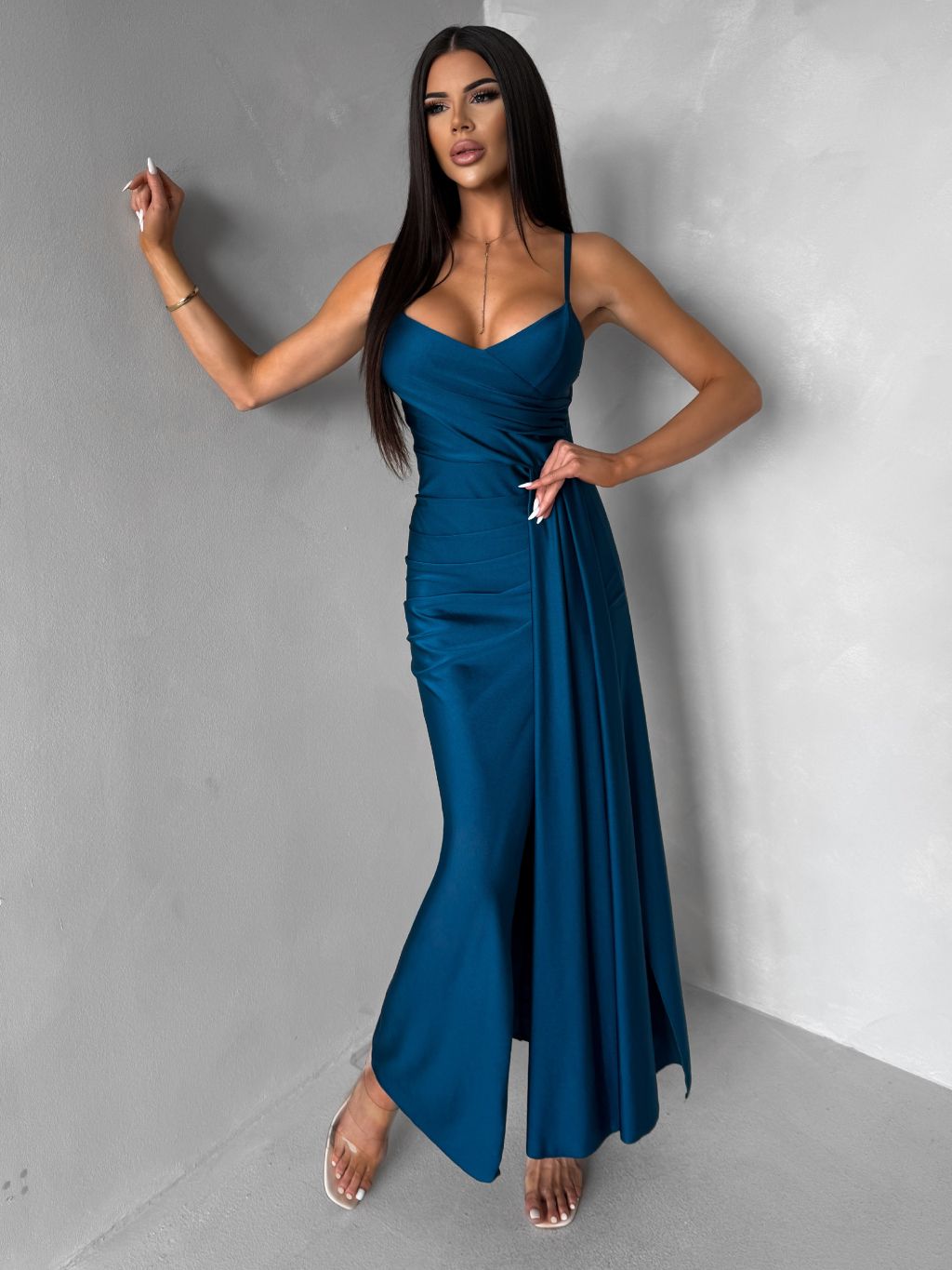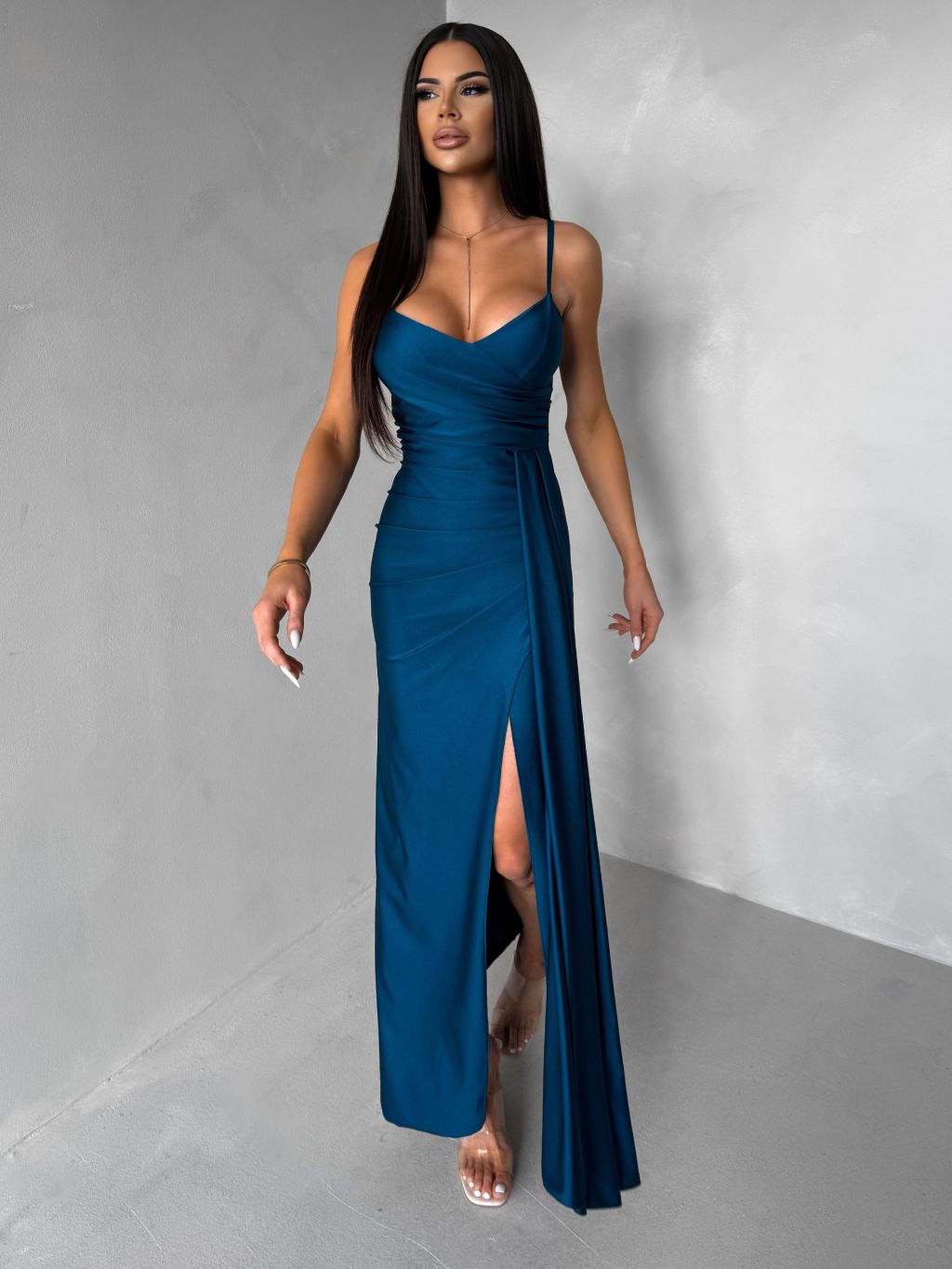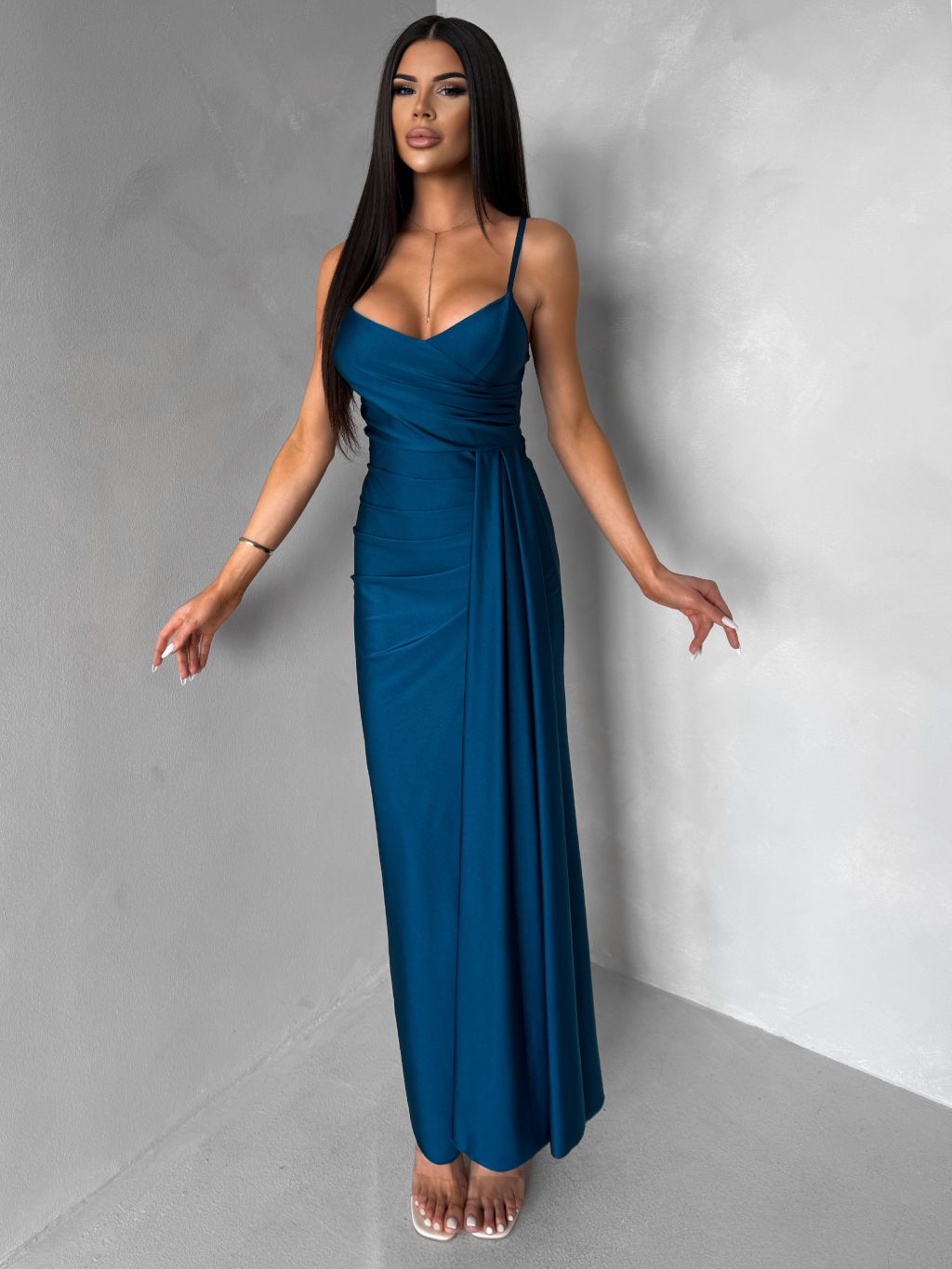Petrolejové dlhé spoločenské šaty OLIRYA s výstrihom