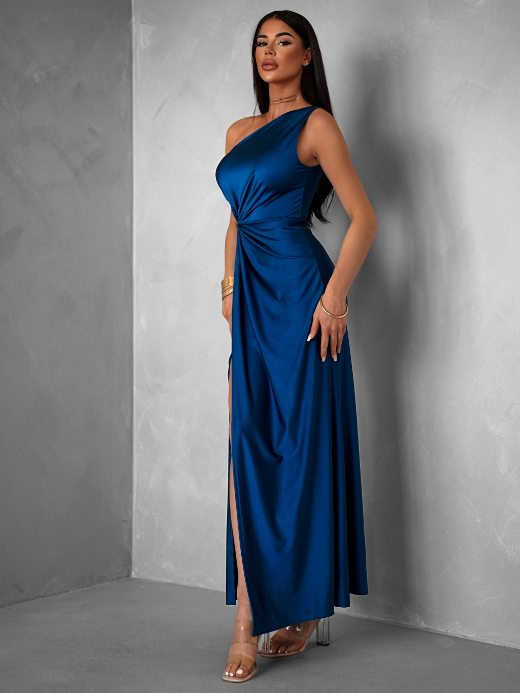 Petrolejové saténové šaty FIAMMAR na jedno rameno
