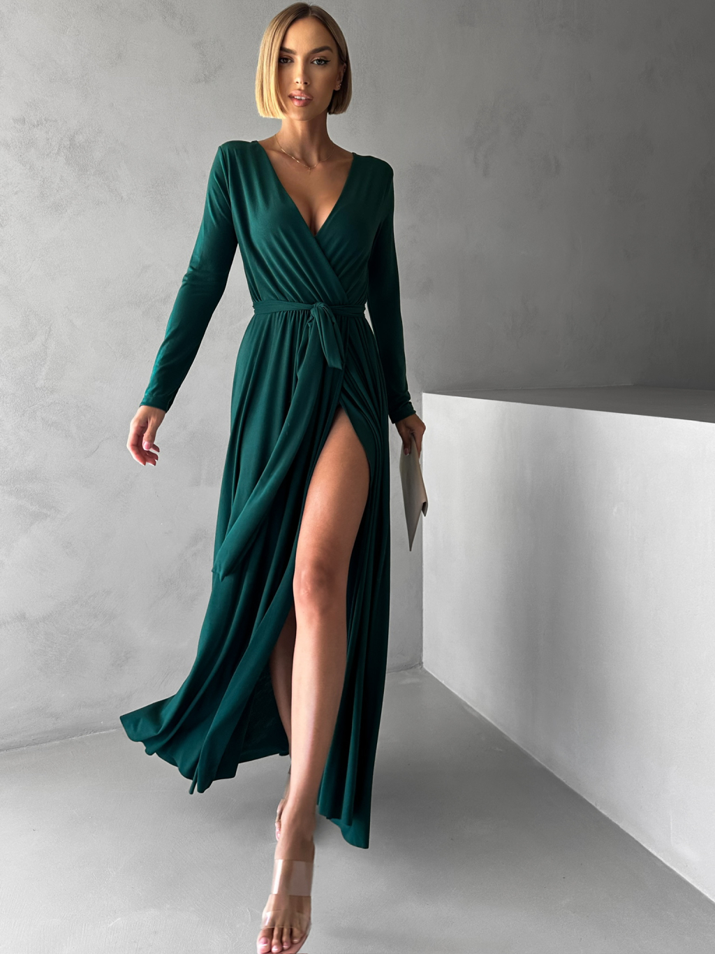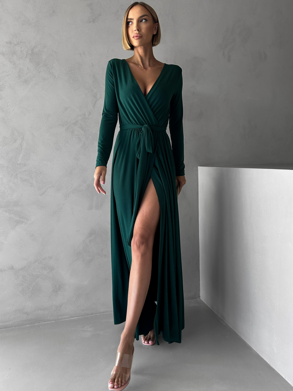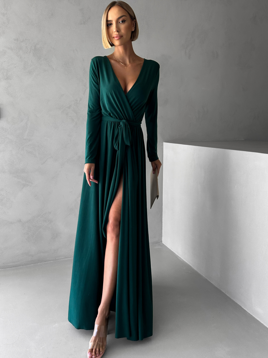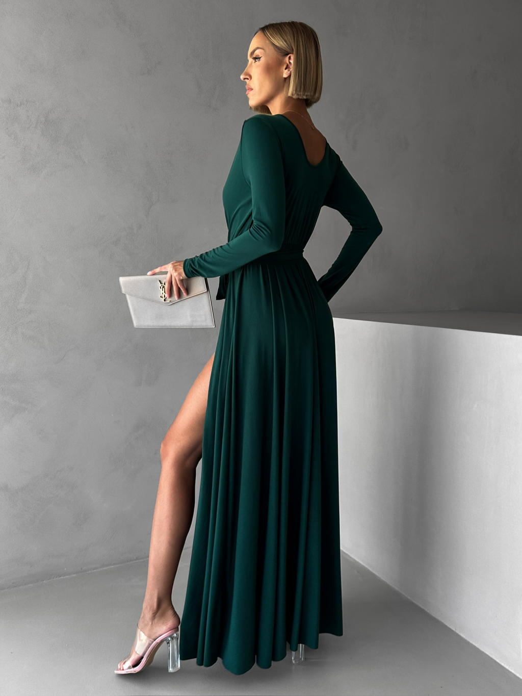 Smaragdové dlhé večerné šaty JOELLIAN s dlhým rukávom