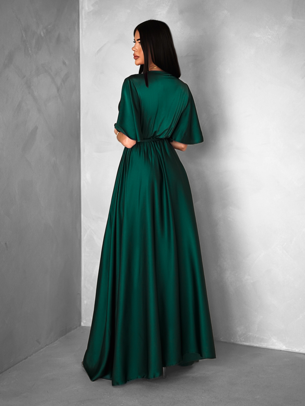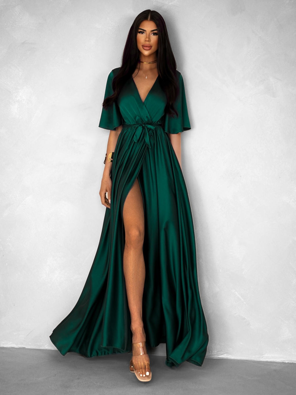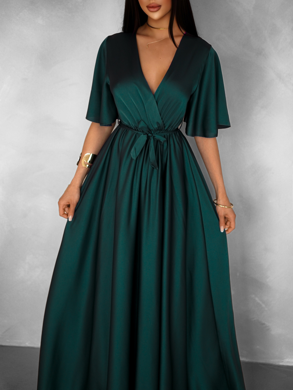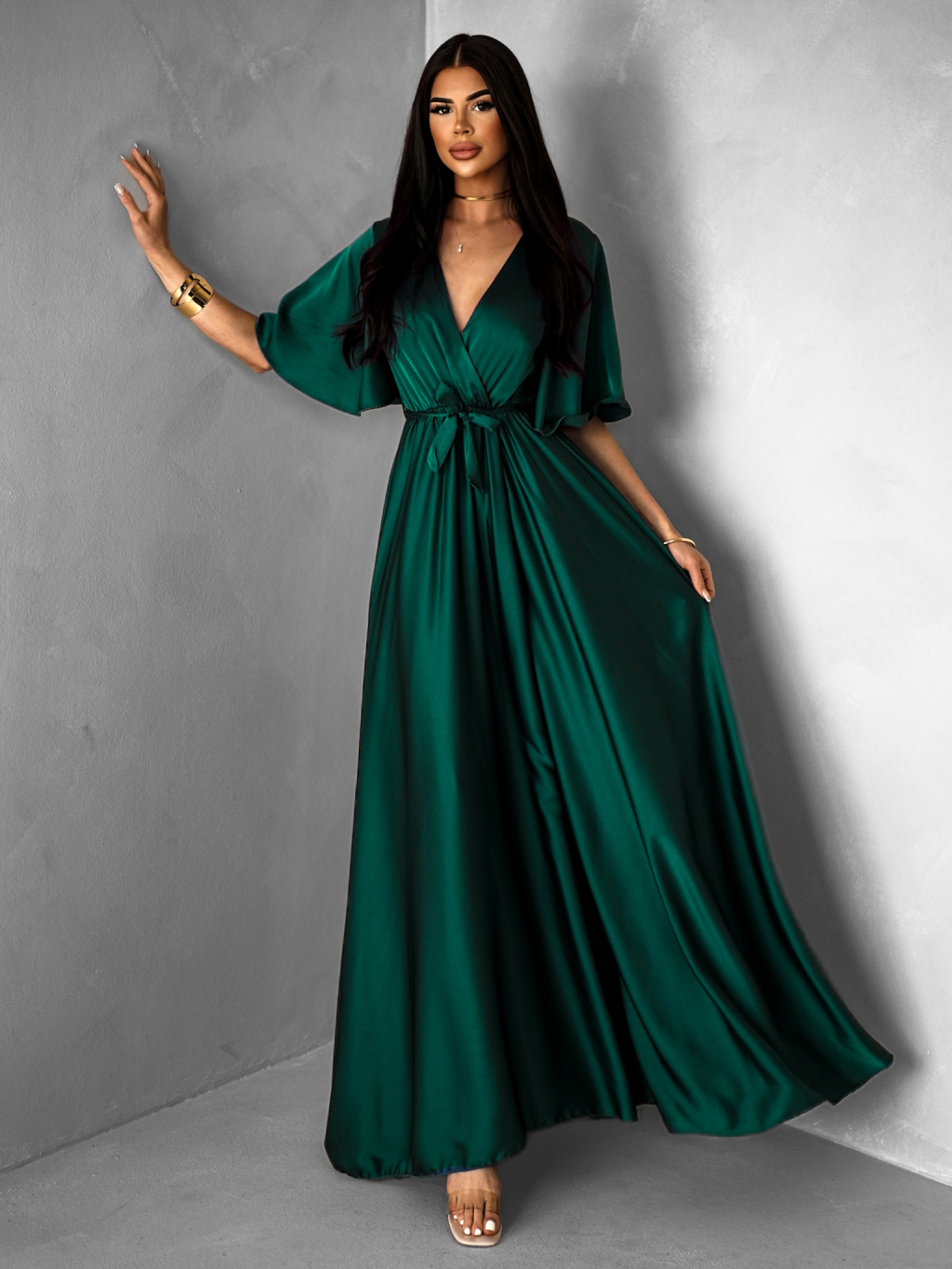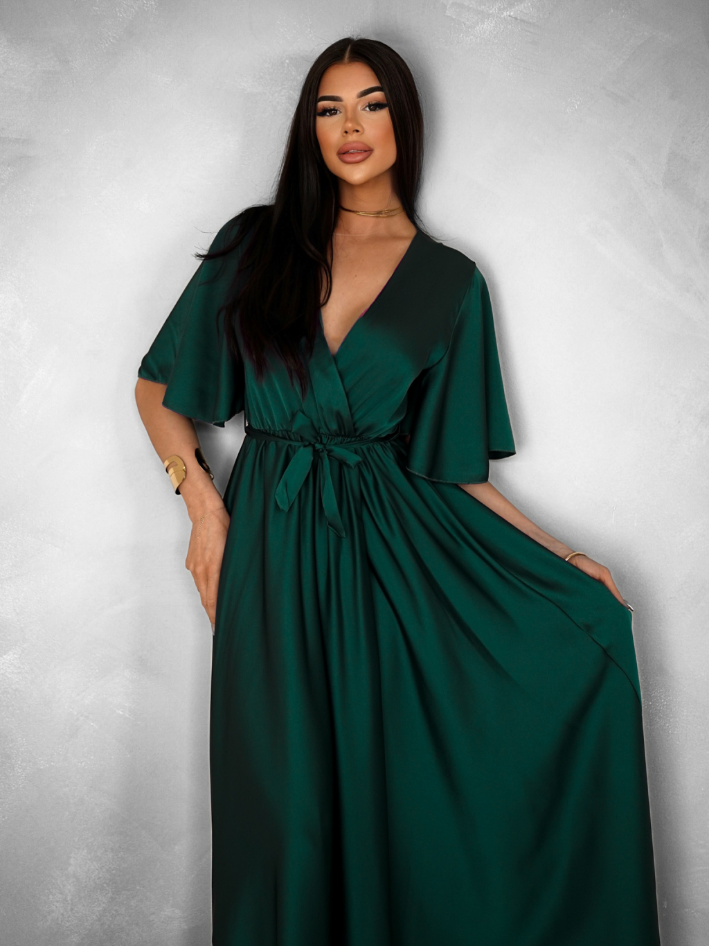 Smaragdové saténové dlhé šaty GO HOME s výstrihom