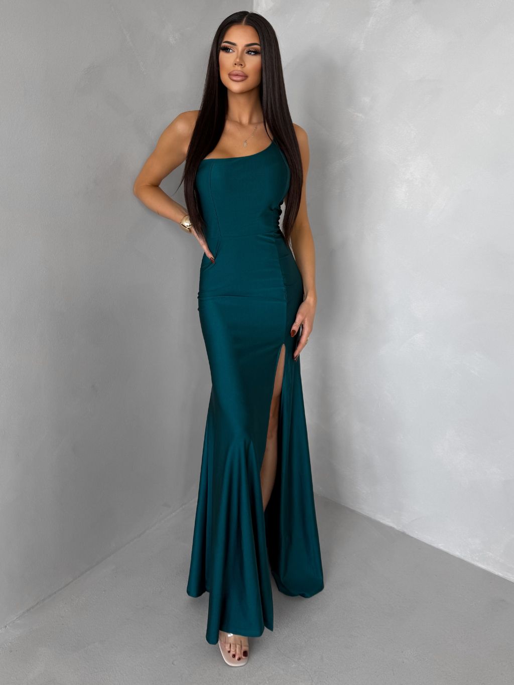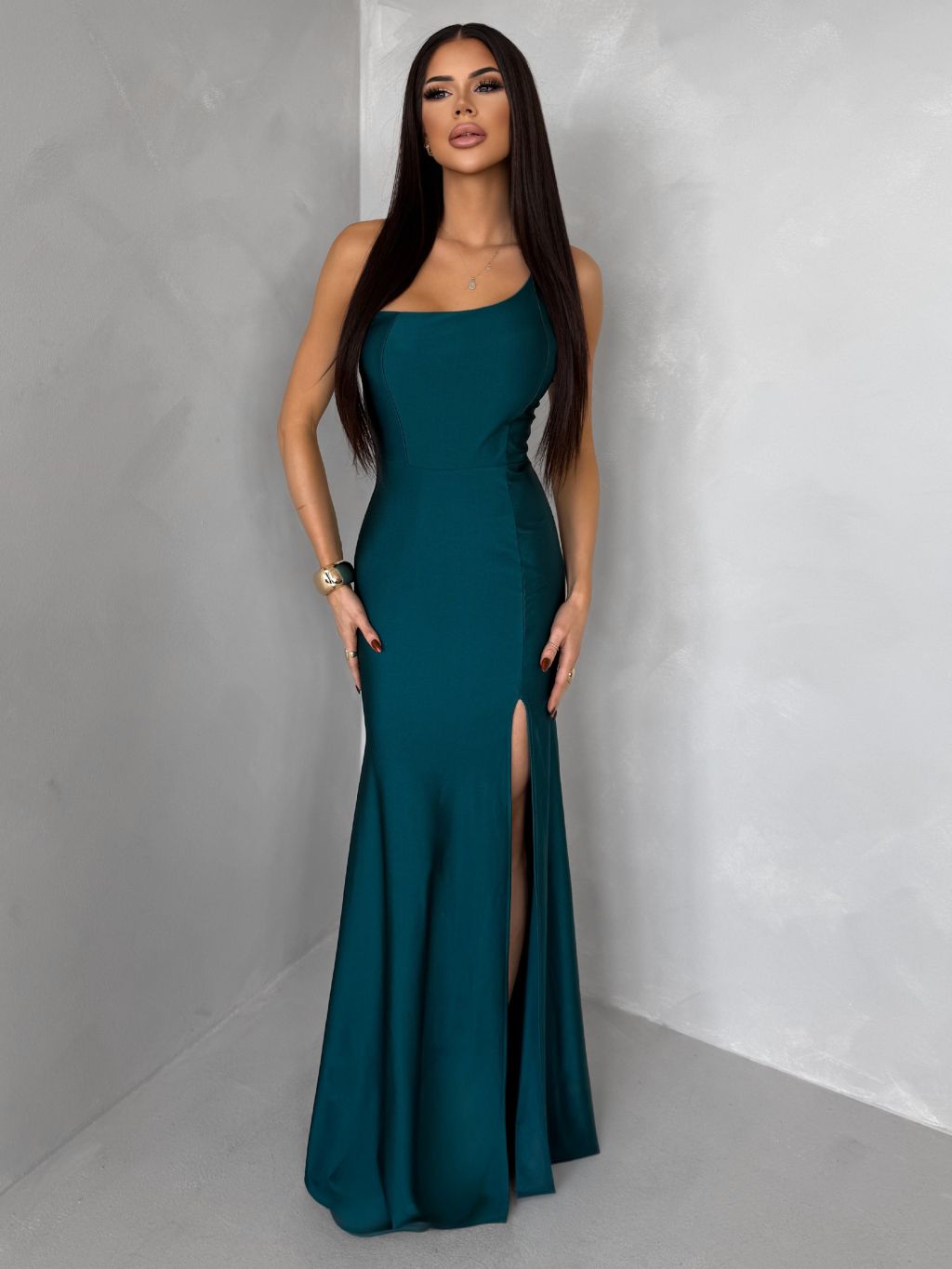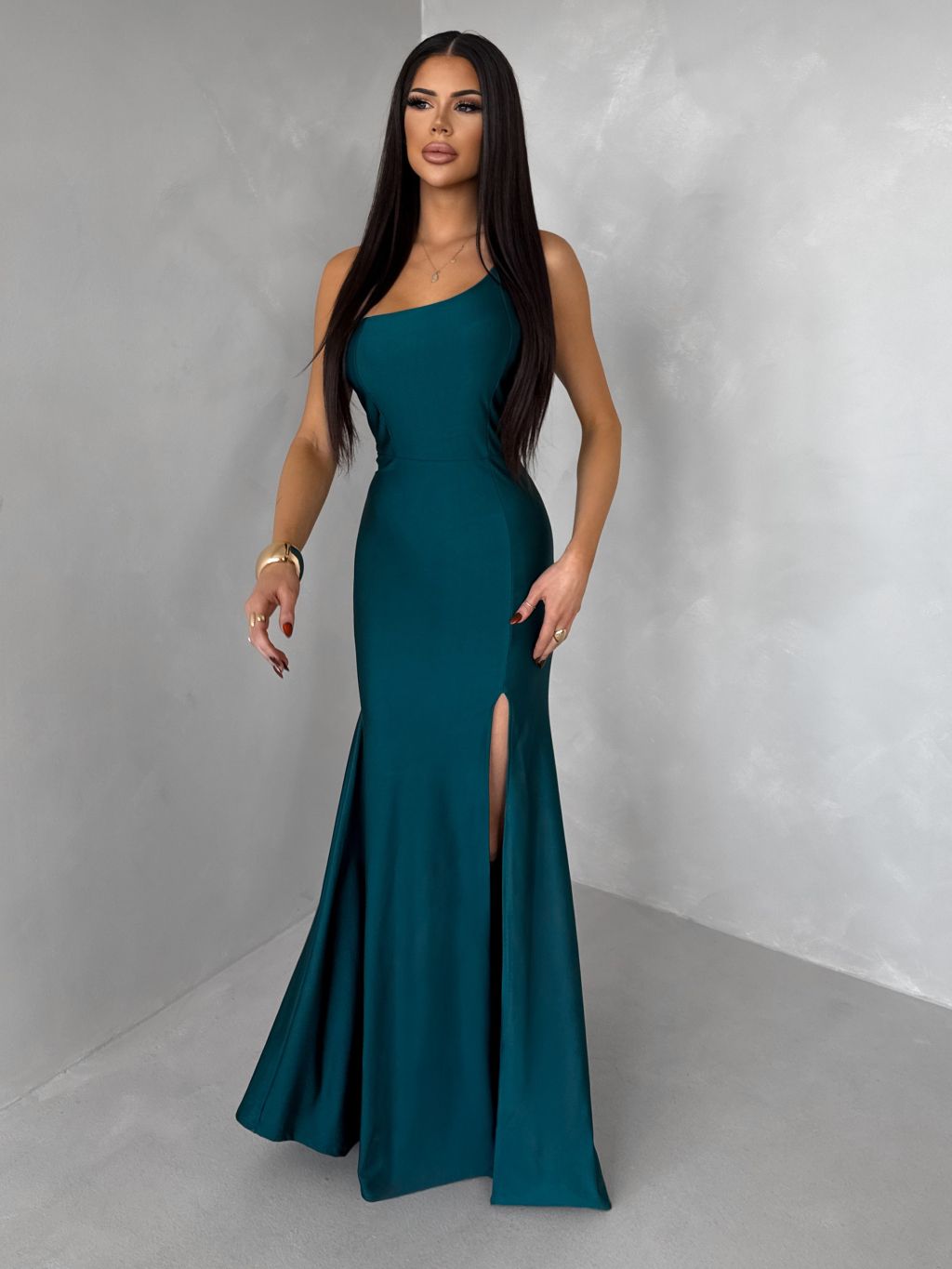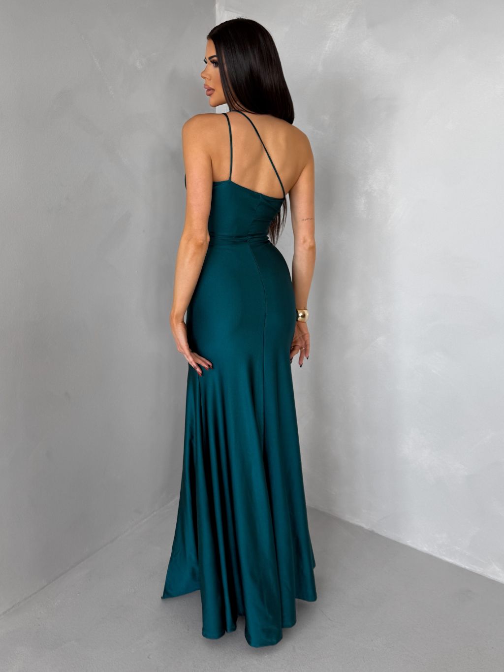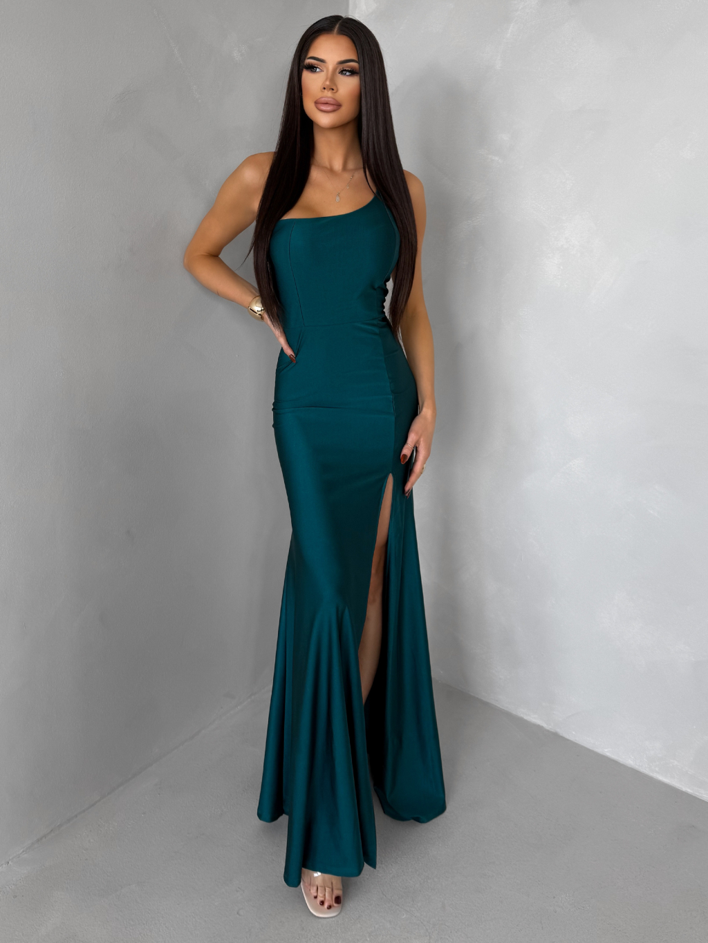 Smaragdové spoločenské asymetrické šaty GAREVIA s rázporkom