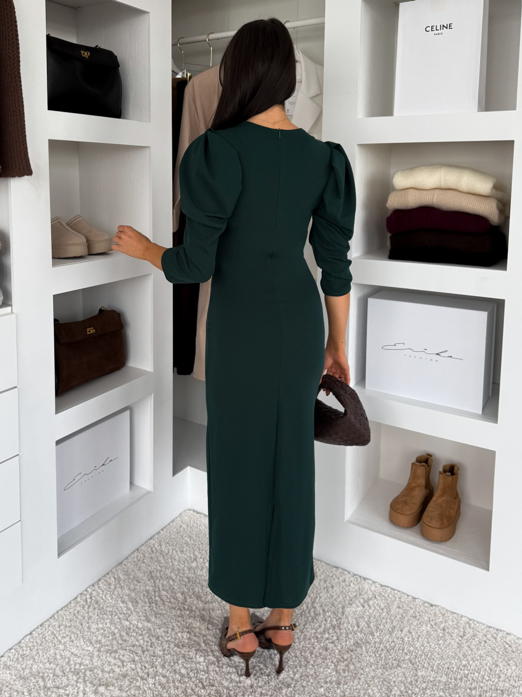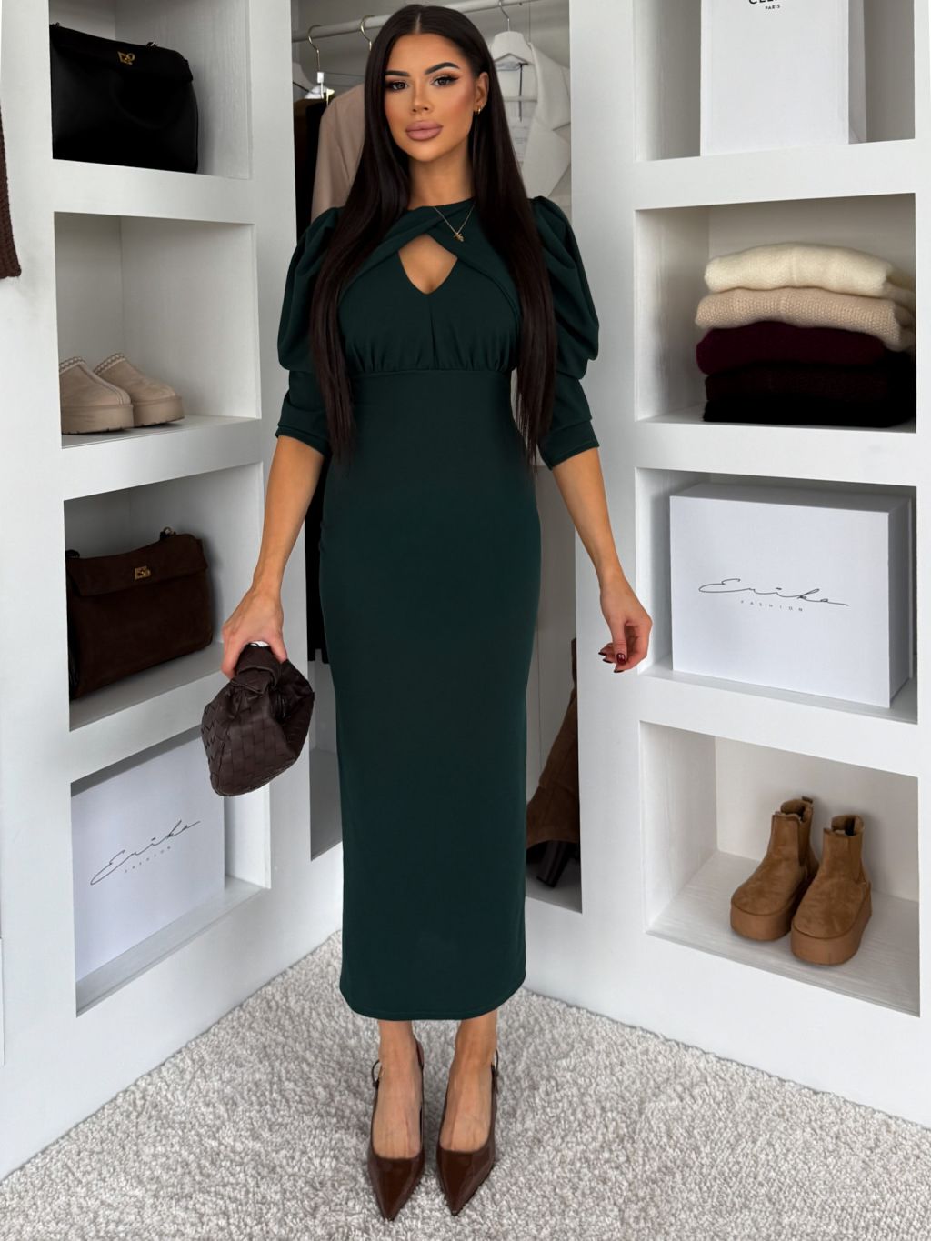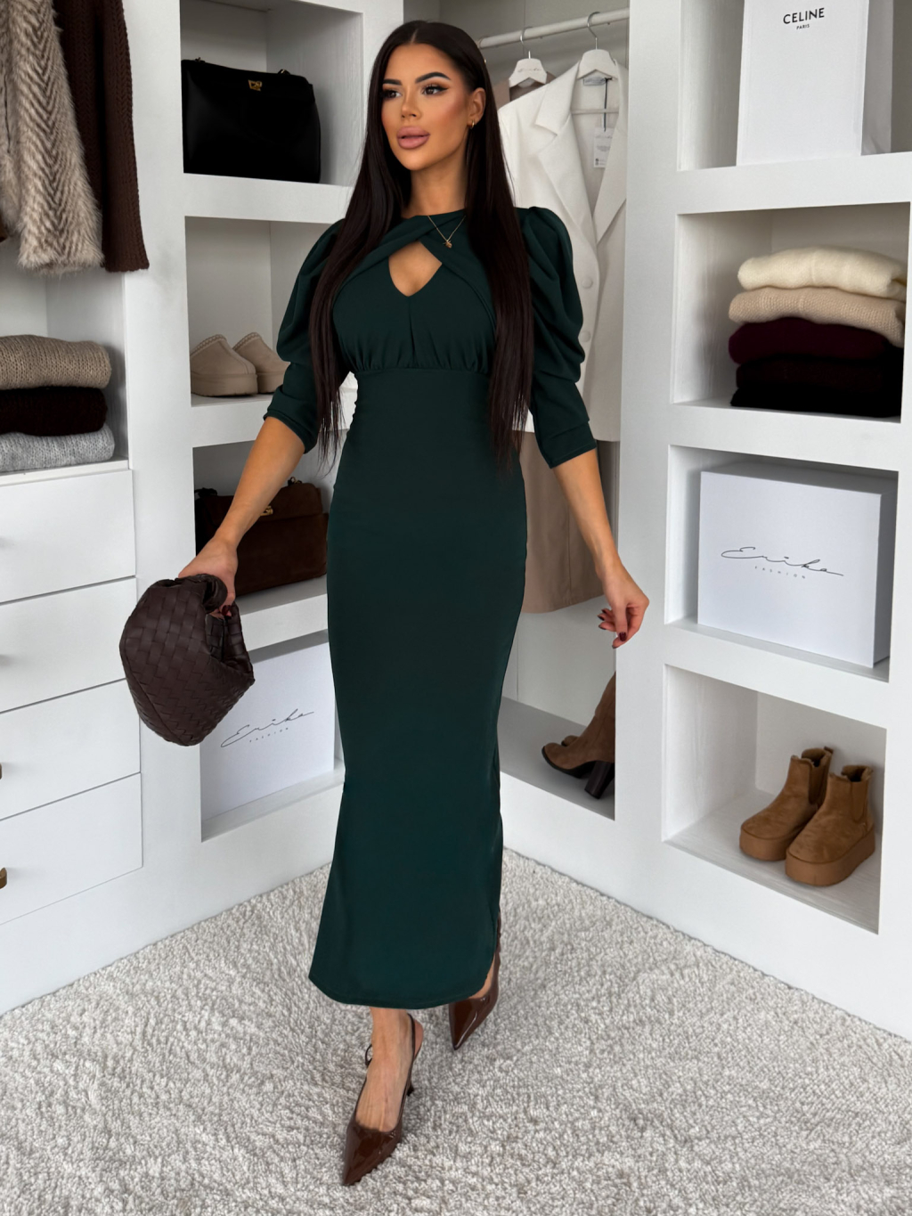 Smaragdové spoločenské midi šaty KYRAYA s rázporkom