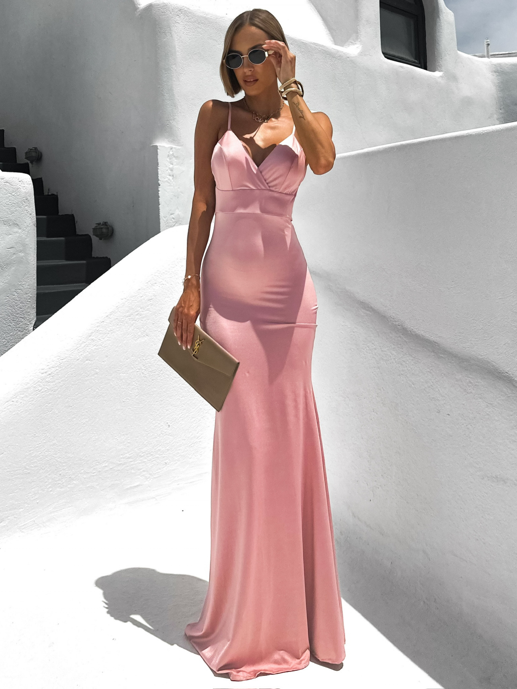 Staroružové dlhé saténové šaty MARSELLE s výstrihom