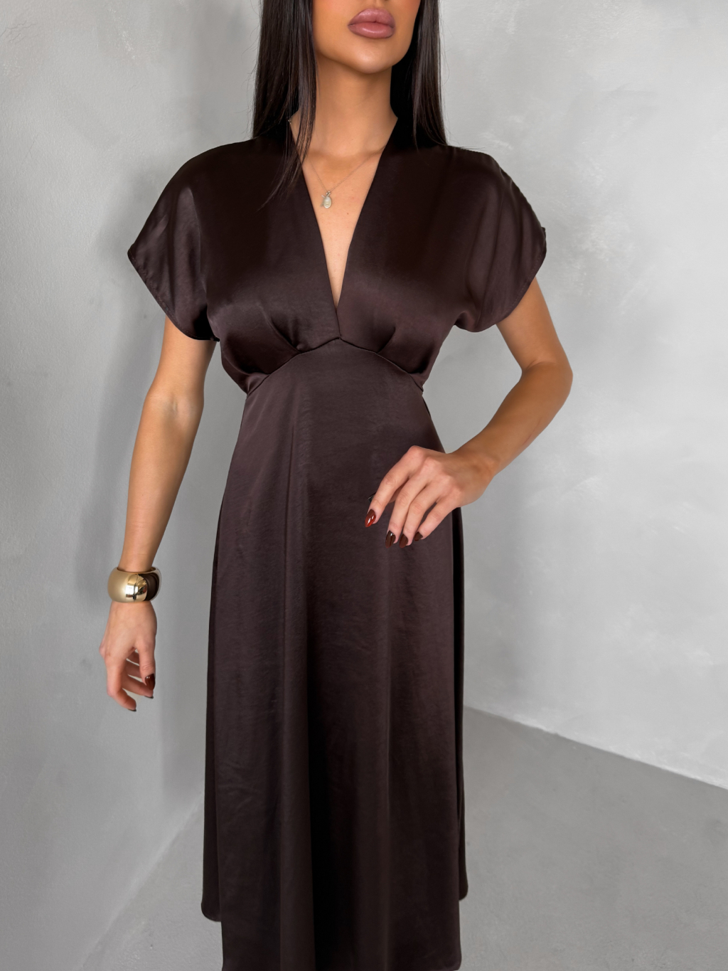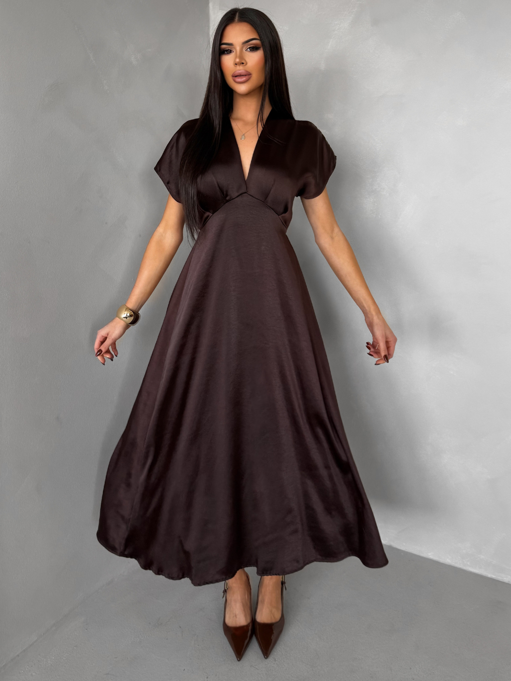 Tmavo hnedé elegantné spoločenské midi šaty OMNIS