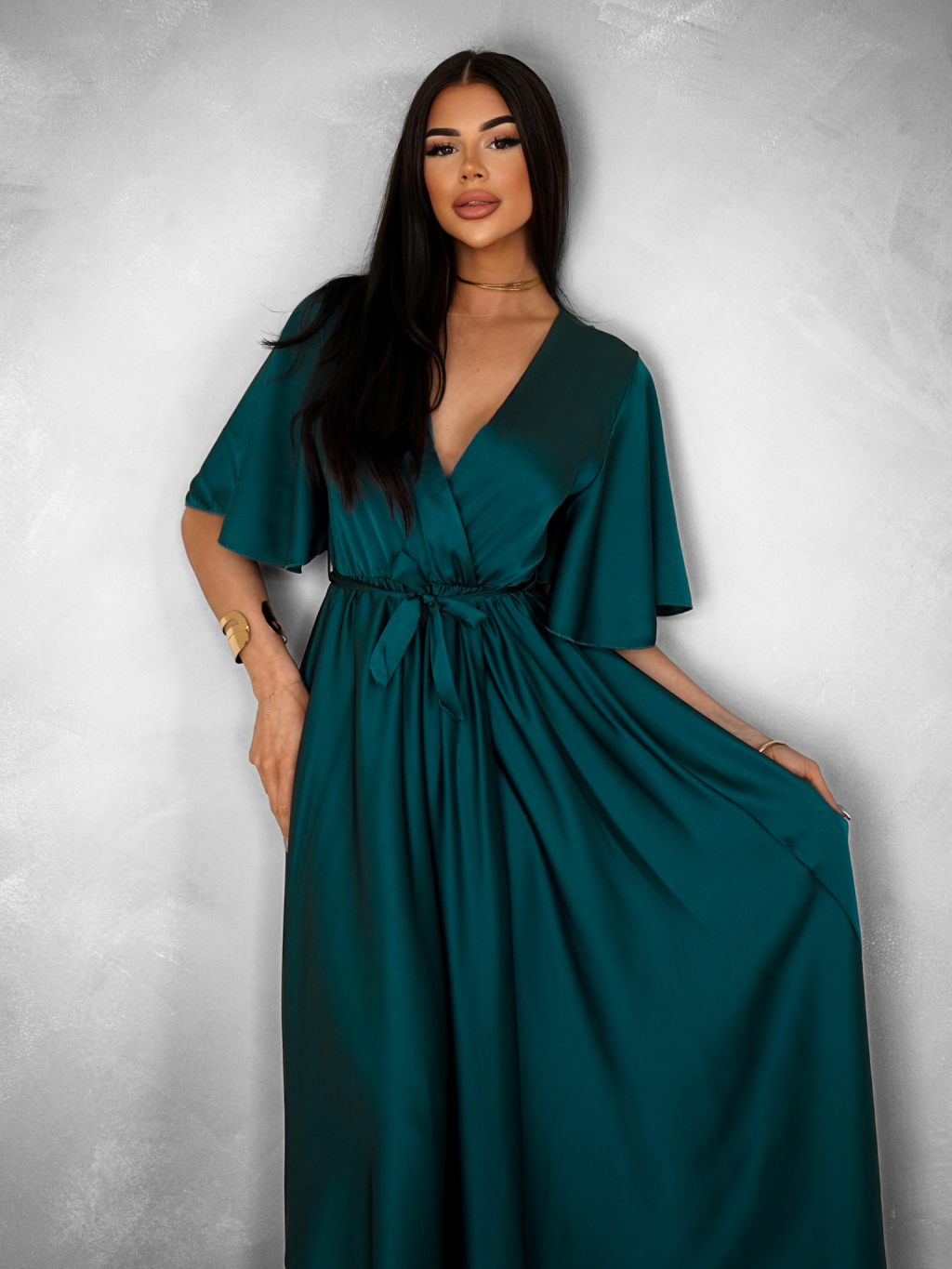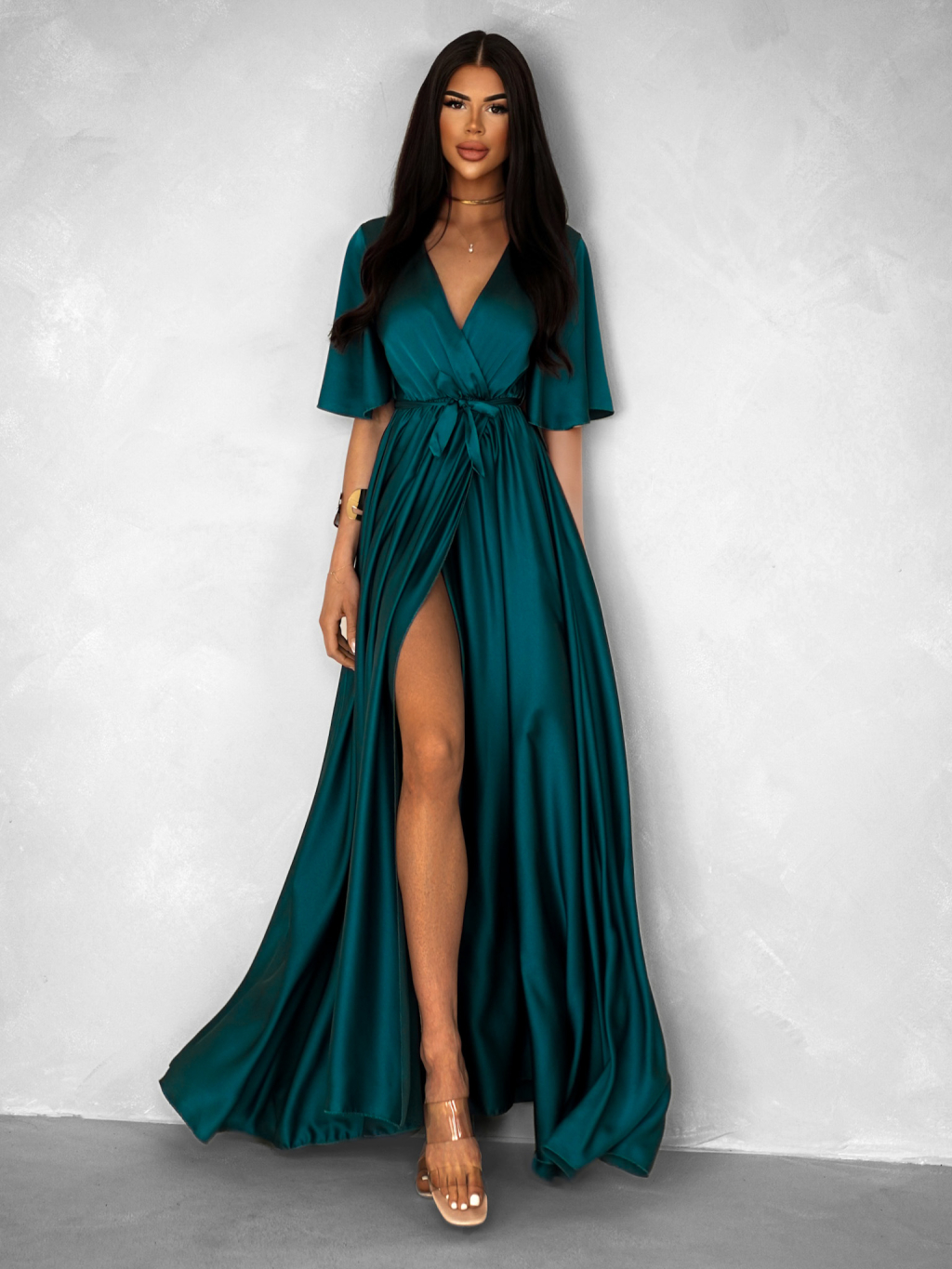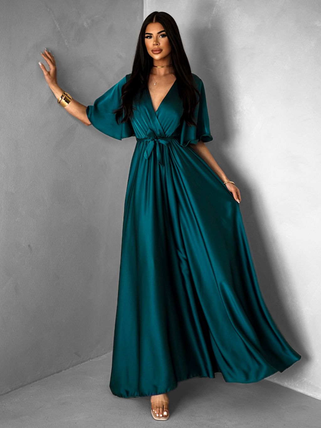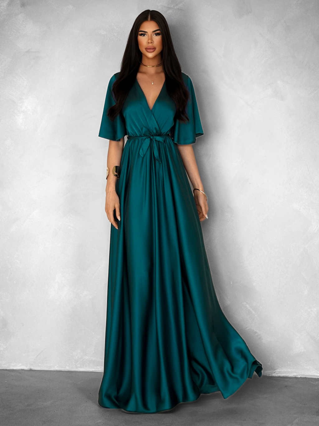 Tmavo petrolejové dlhé saténové šaty GO HOME s krátkym rukávom