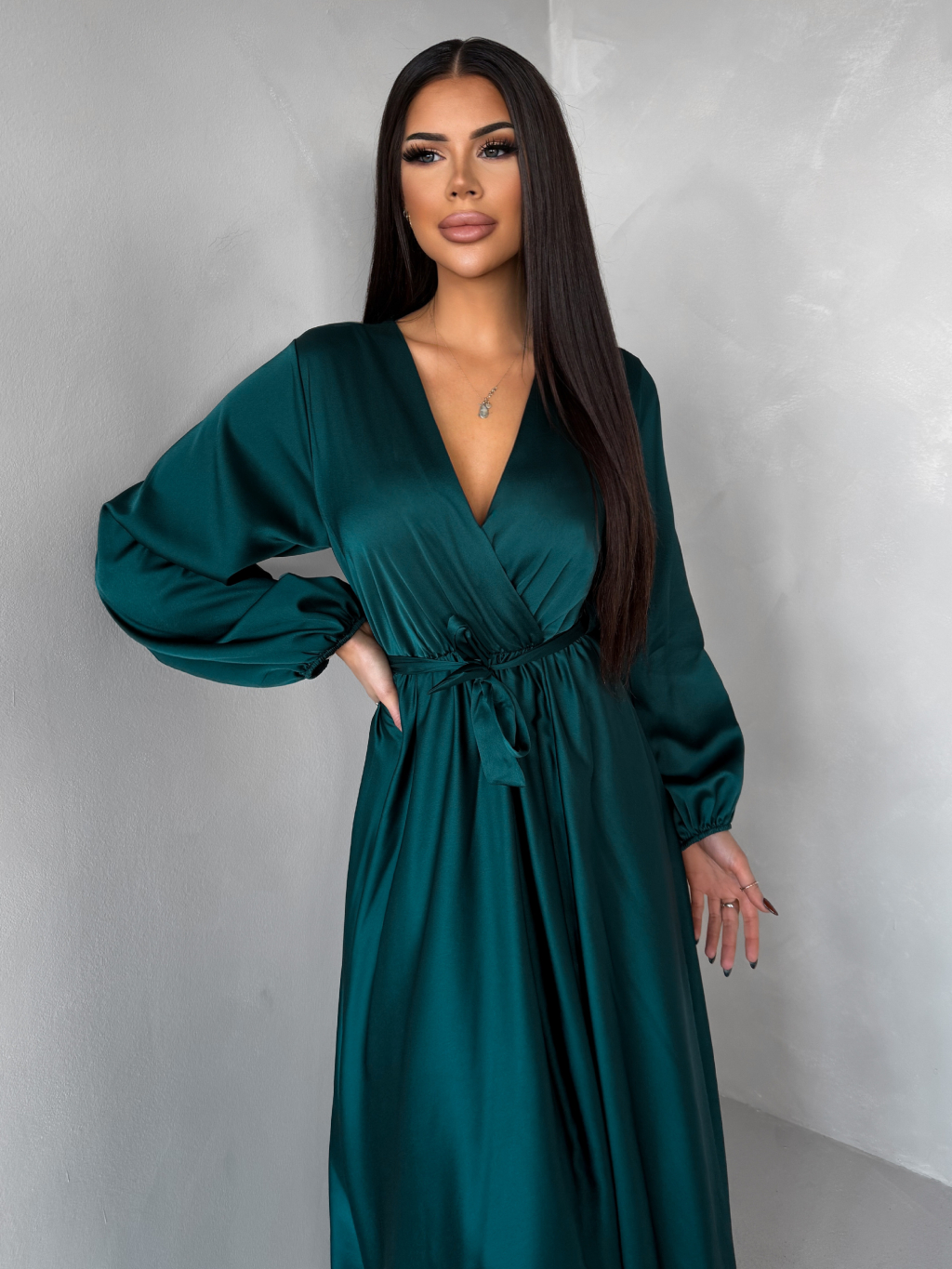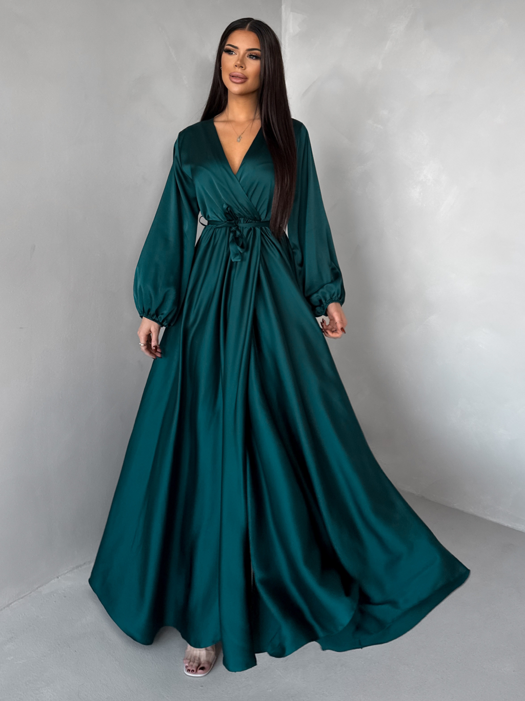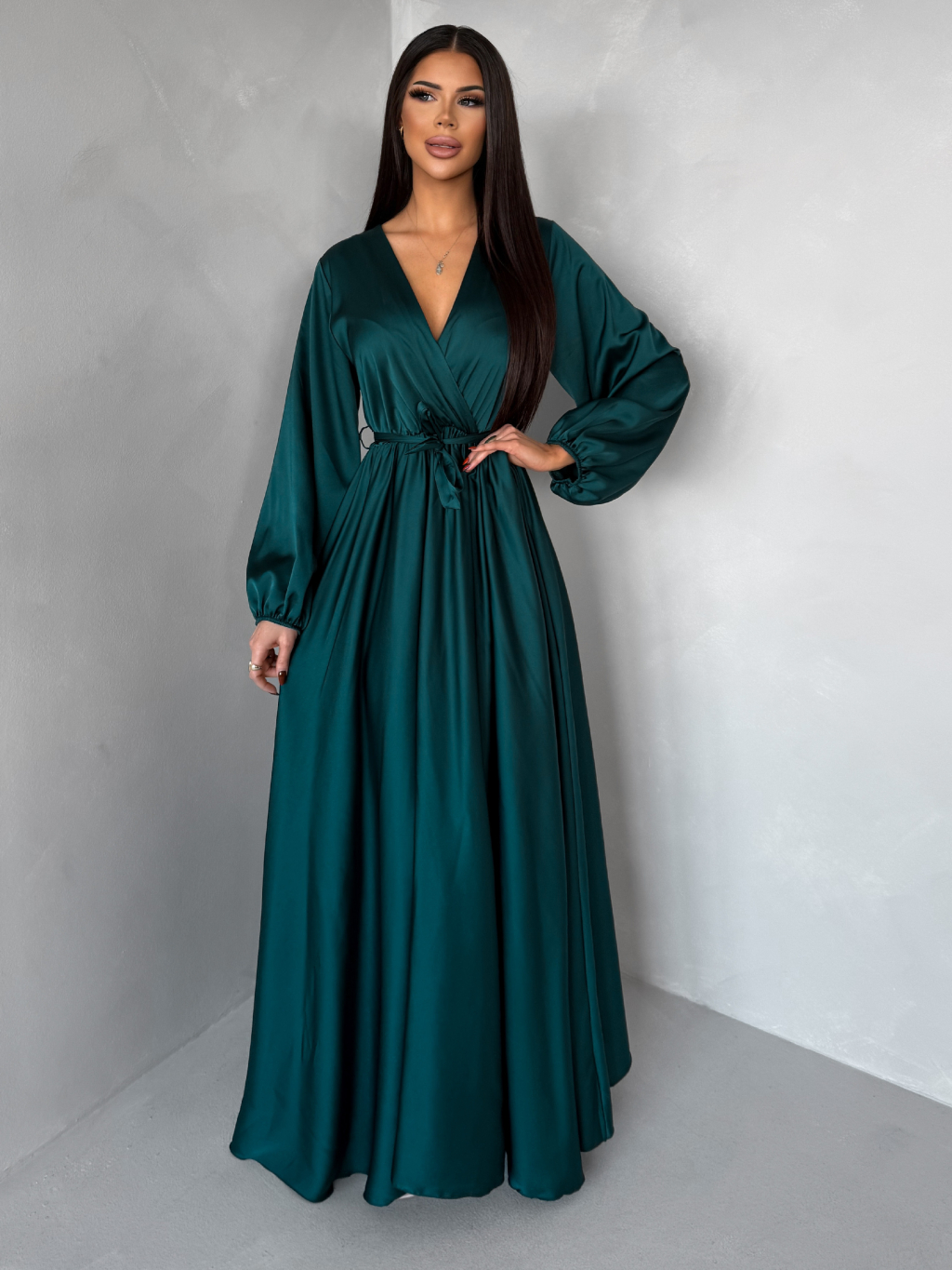 Tmavo petrolejové dlhé saténové šaty WOMAN s opaskom