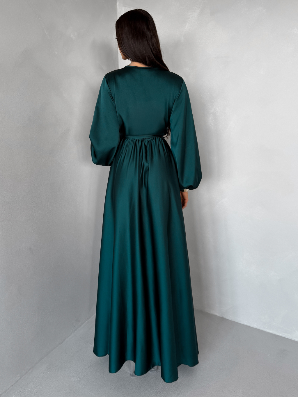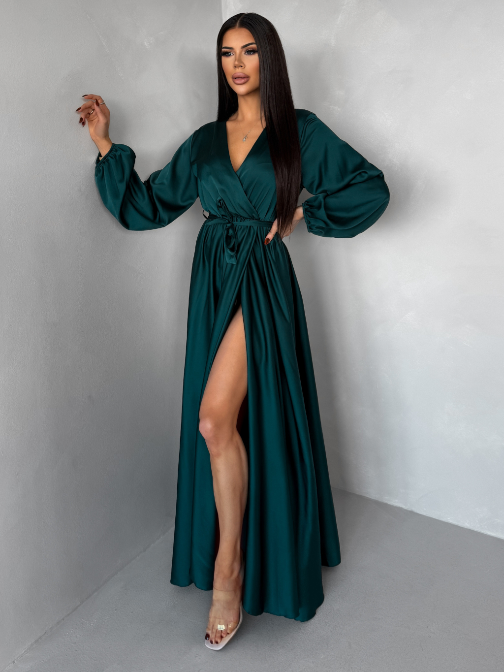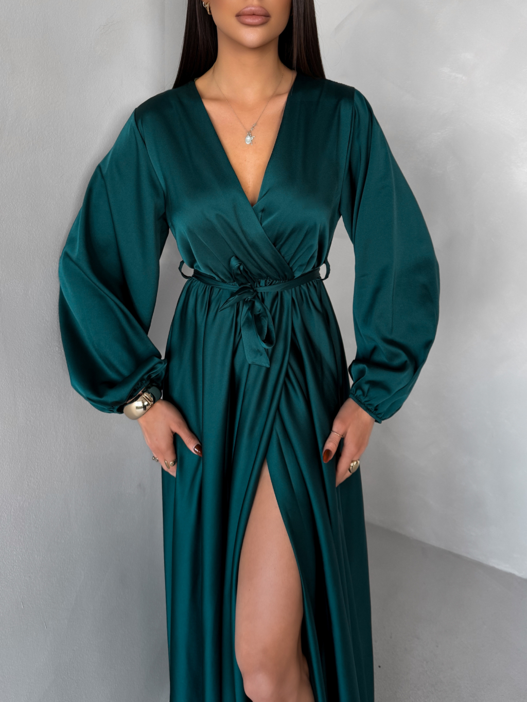 Tmavo petrolejové dlhé saténové šaty WOMAN s opaskom
