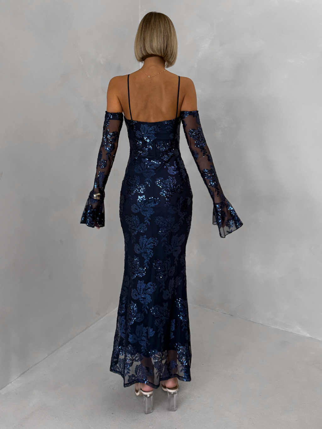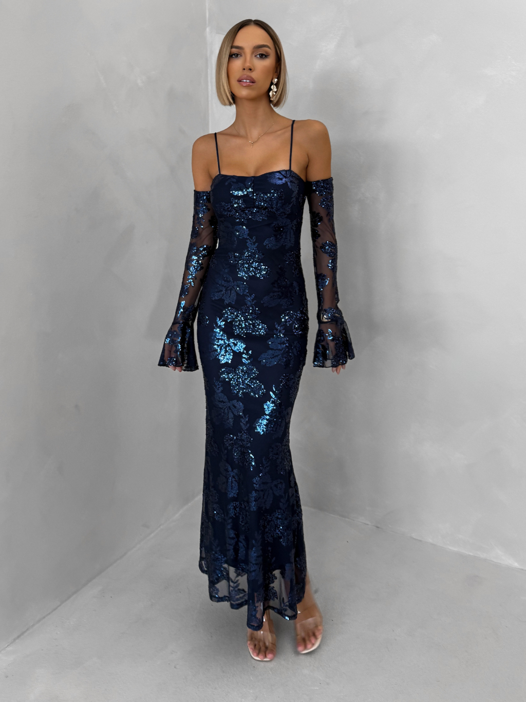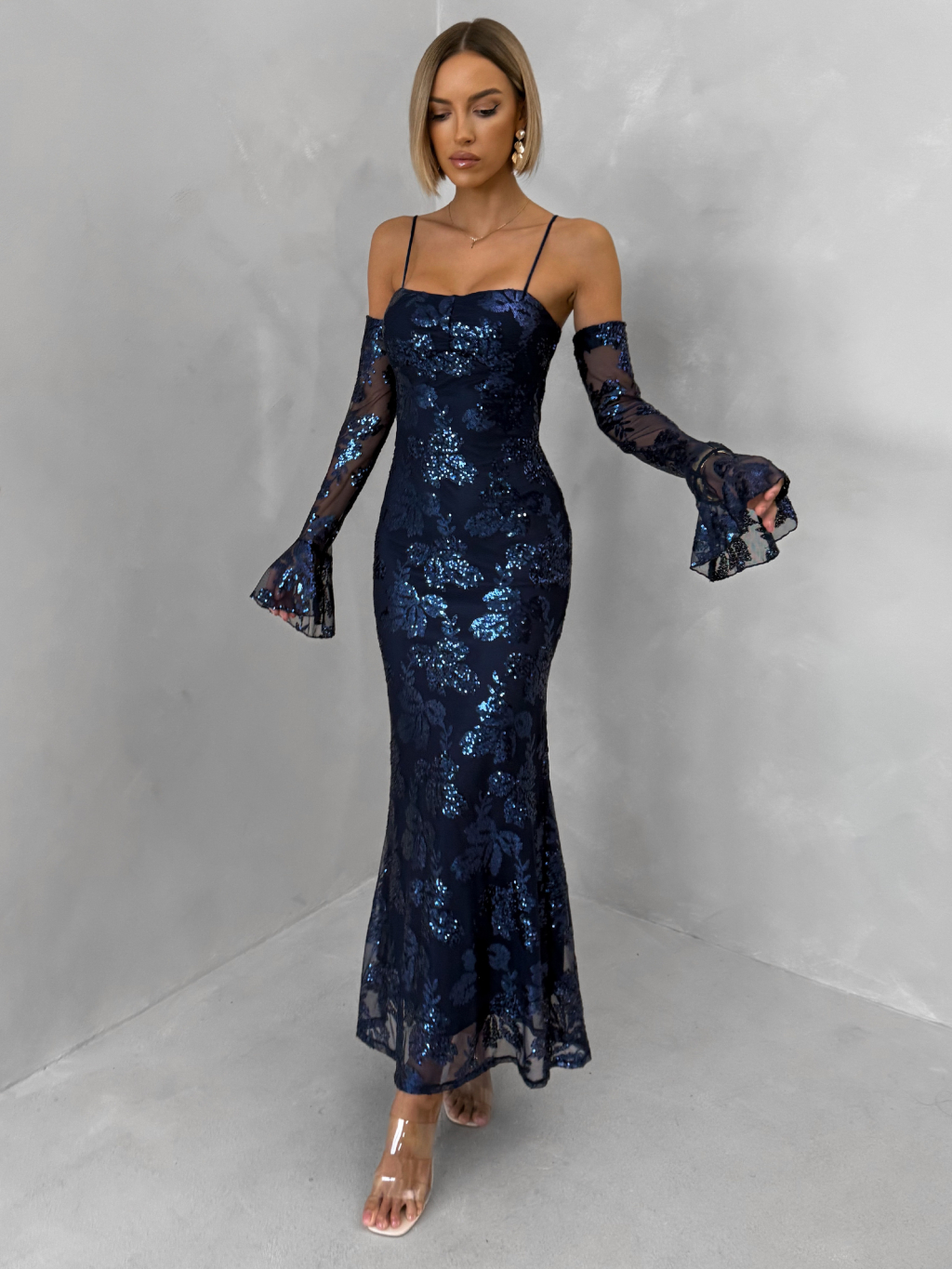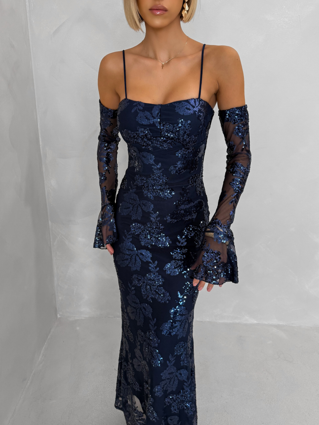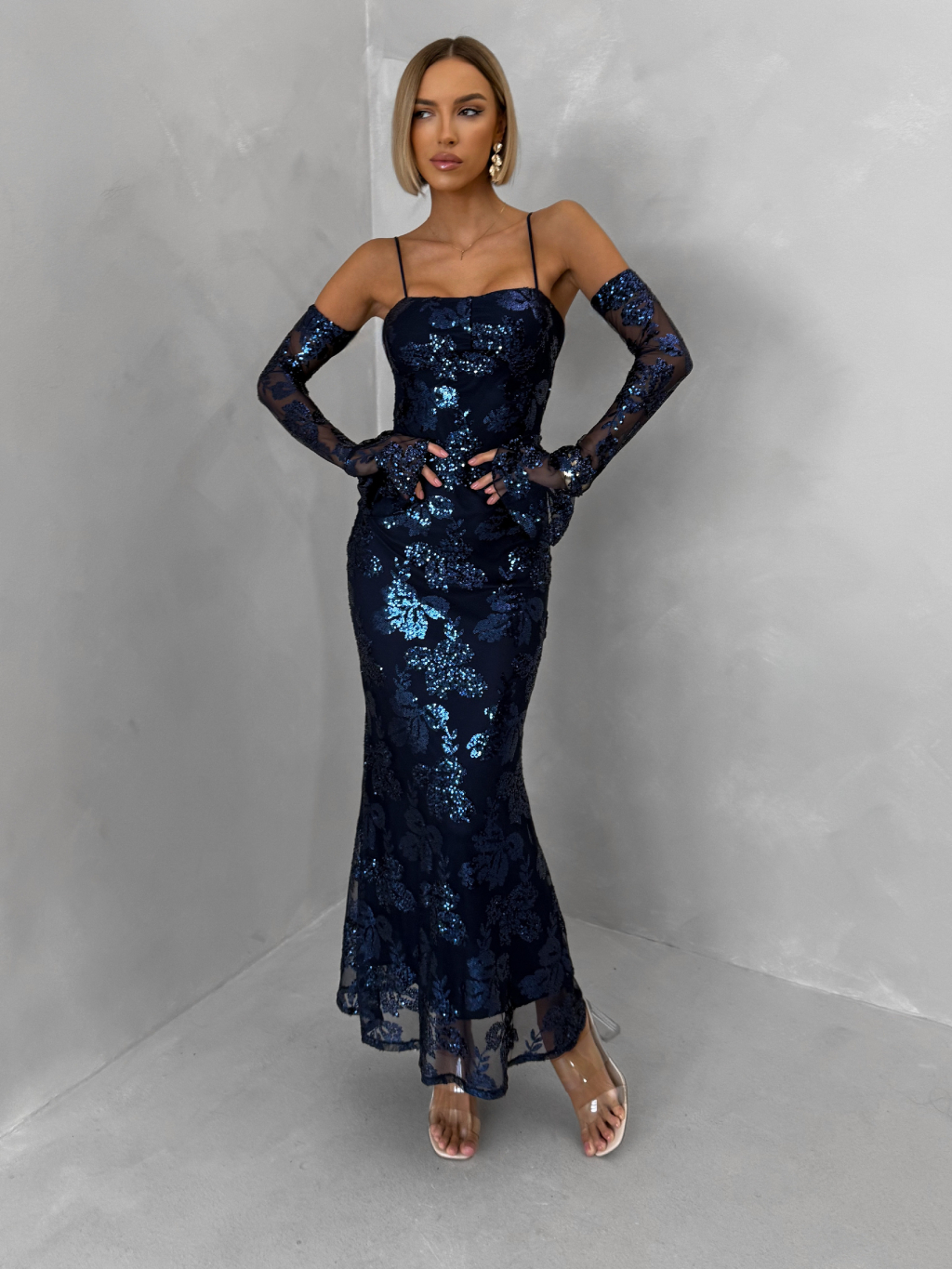Tmavomodré elegantné trblietavé šaty LARKINO s rukávmi