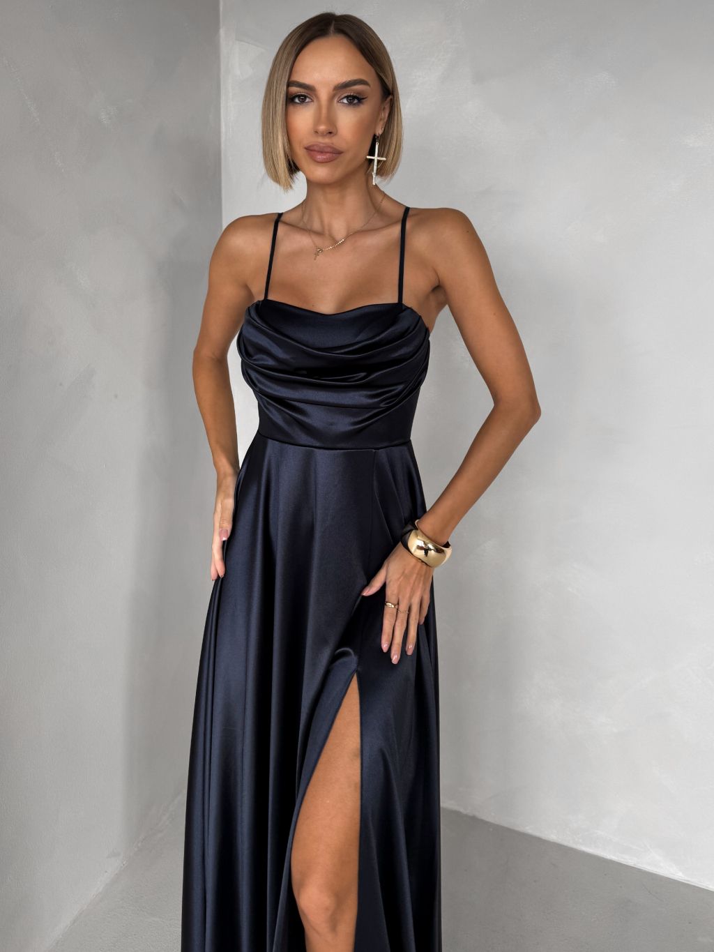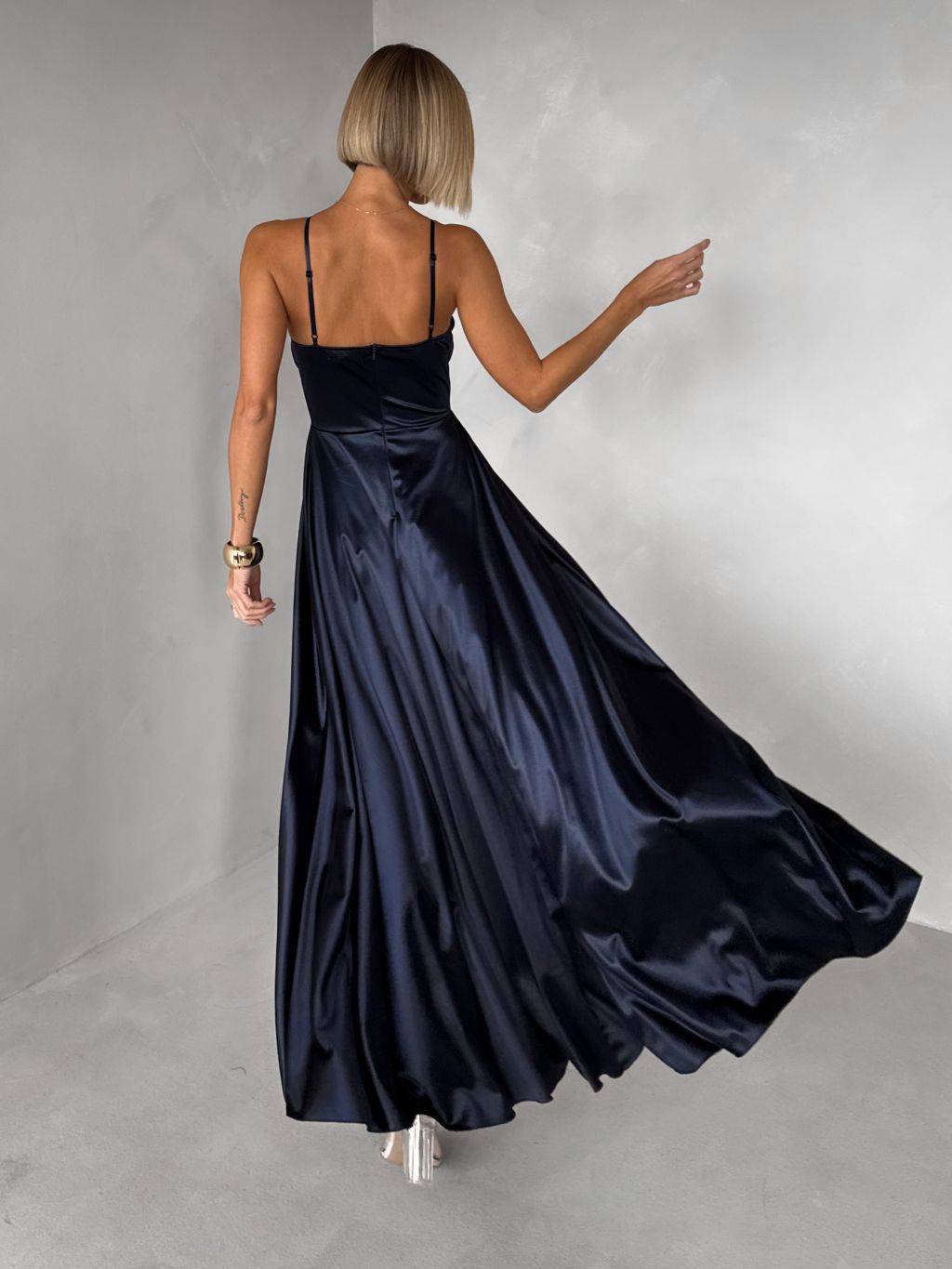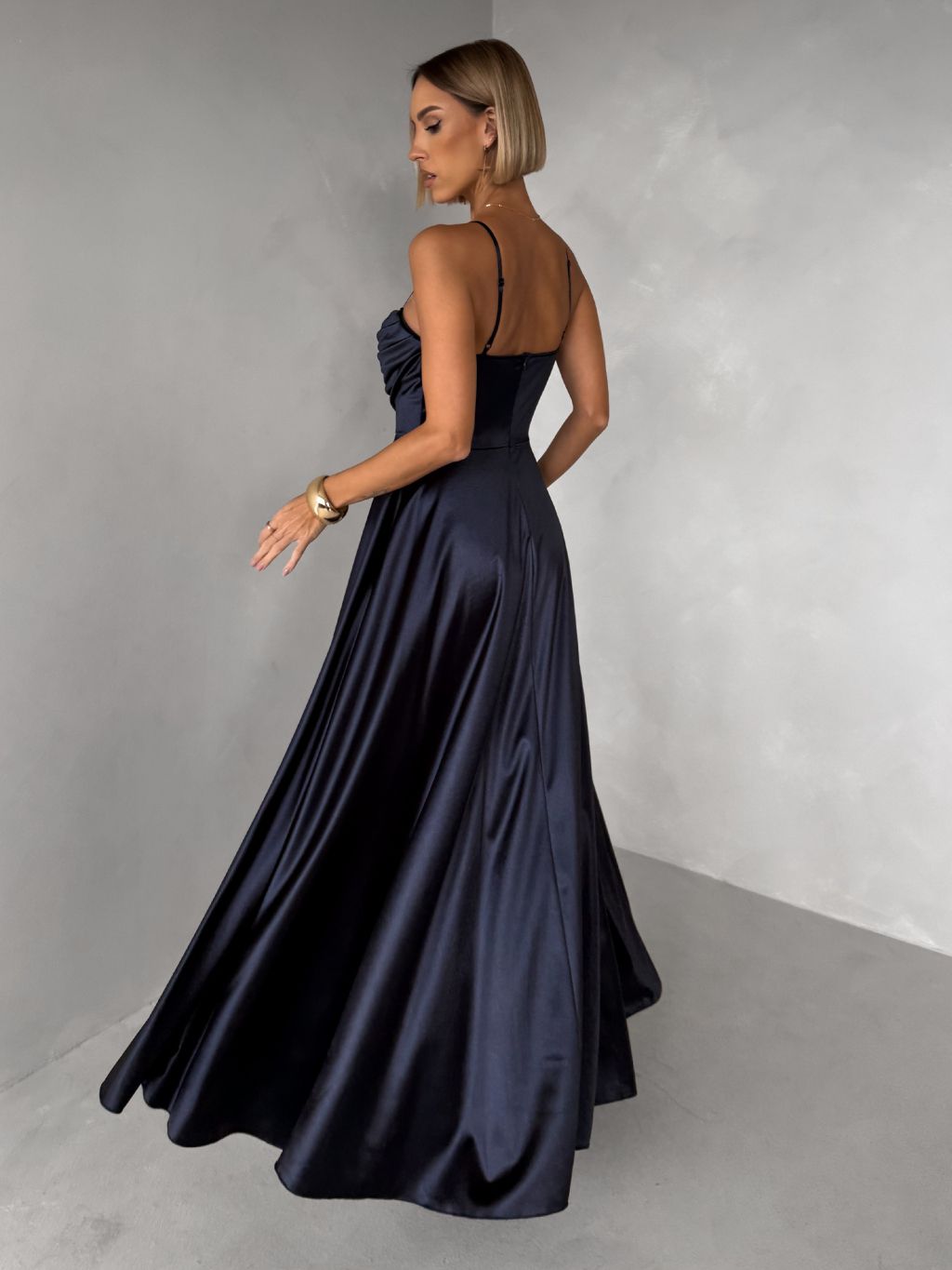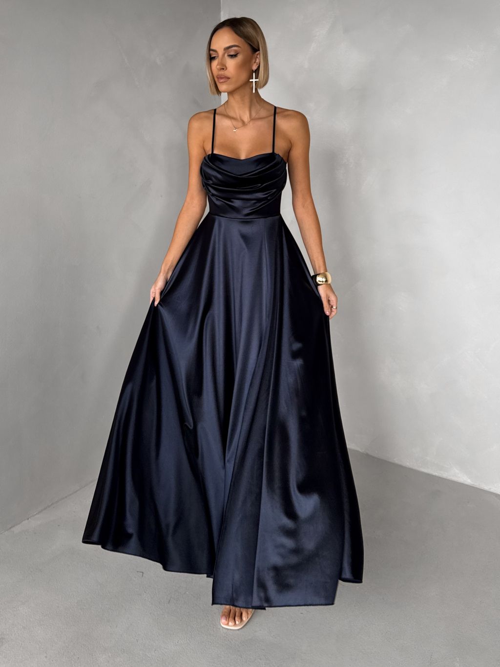 Tmavomodré saténové dlhé spoločenské šaty LUNOREX