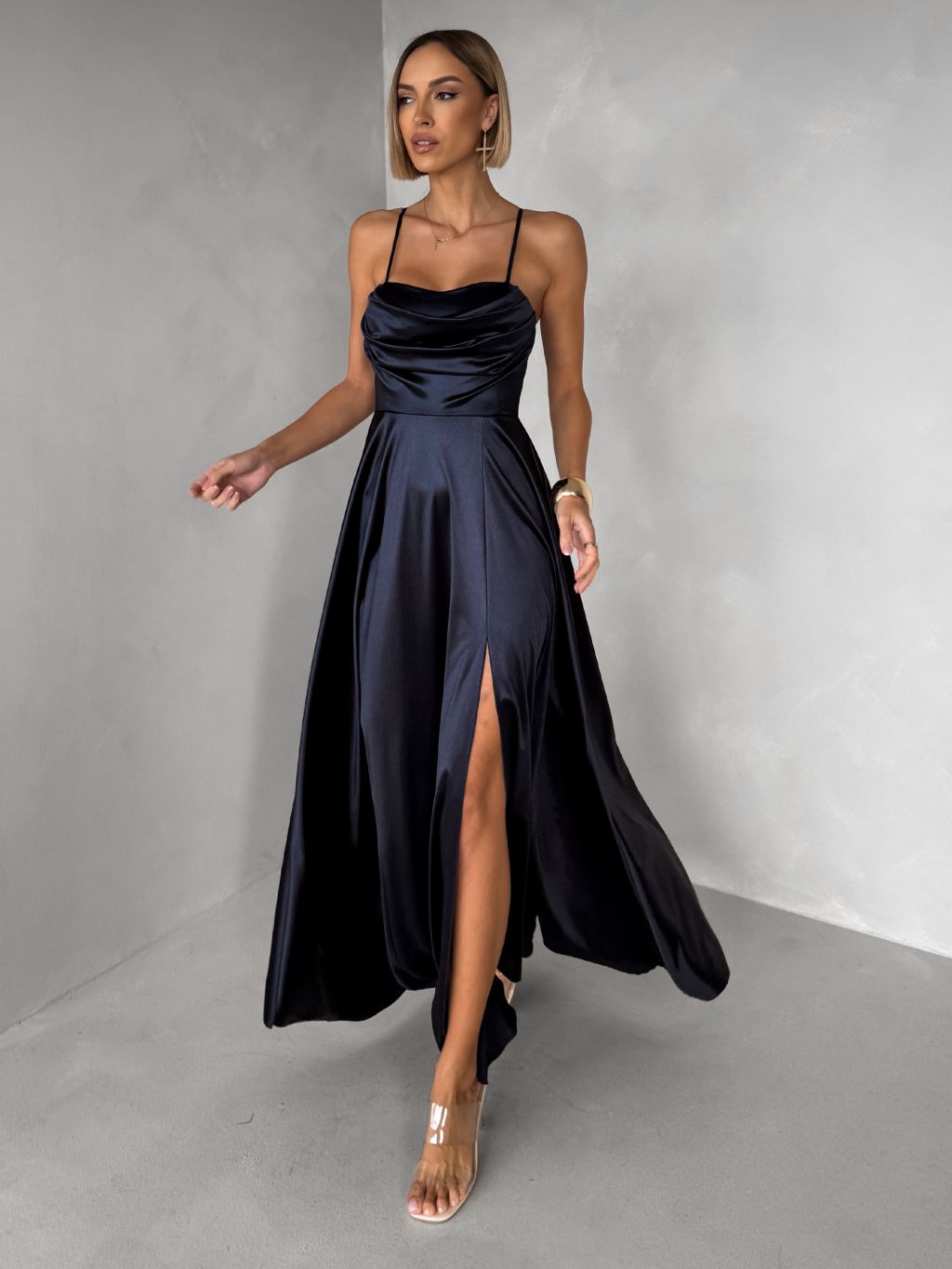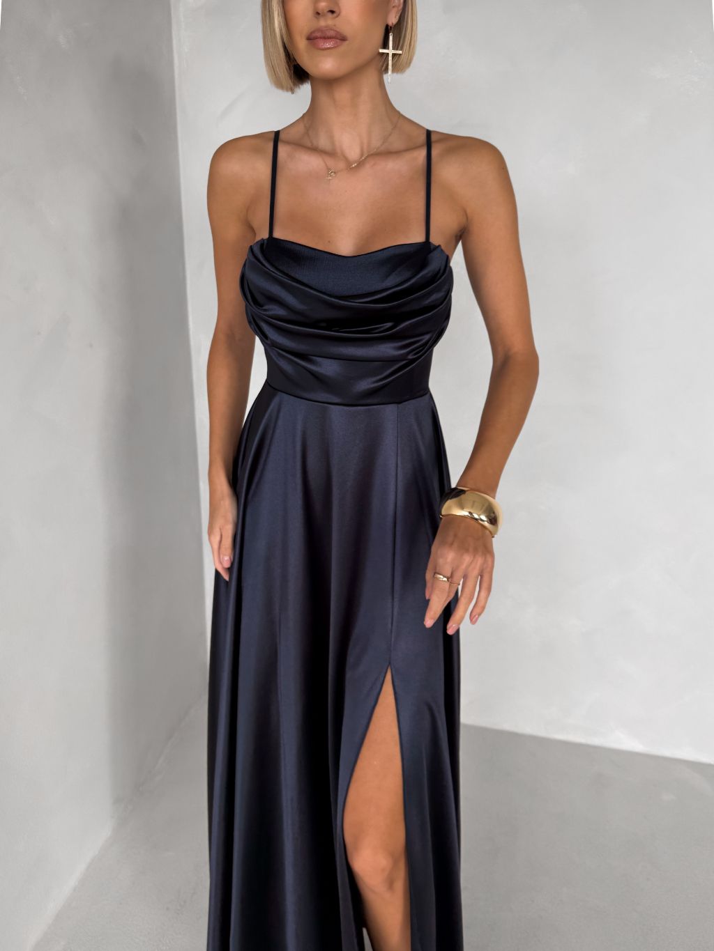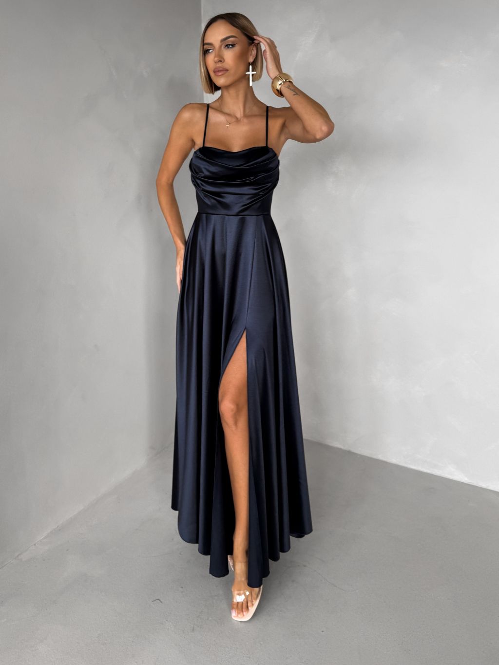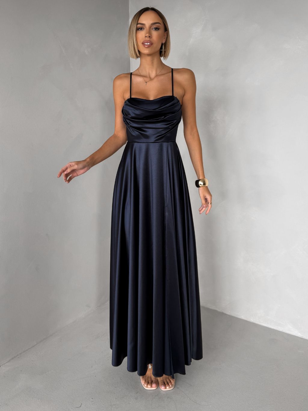 Tmavomodré saténové dlhé spoločenské šaty LUNOREX