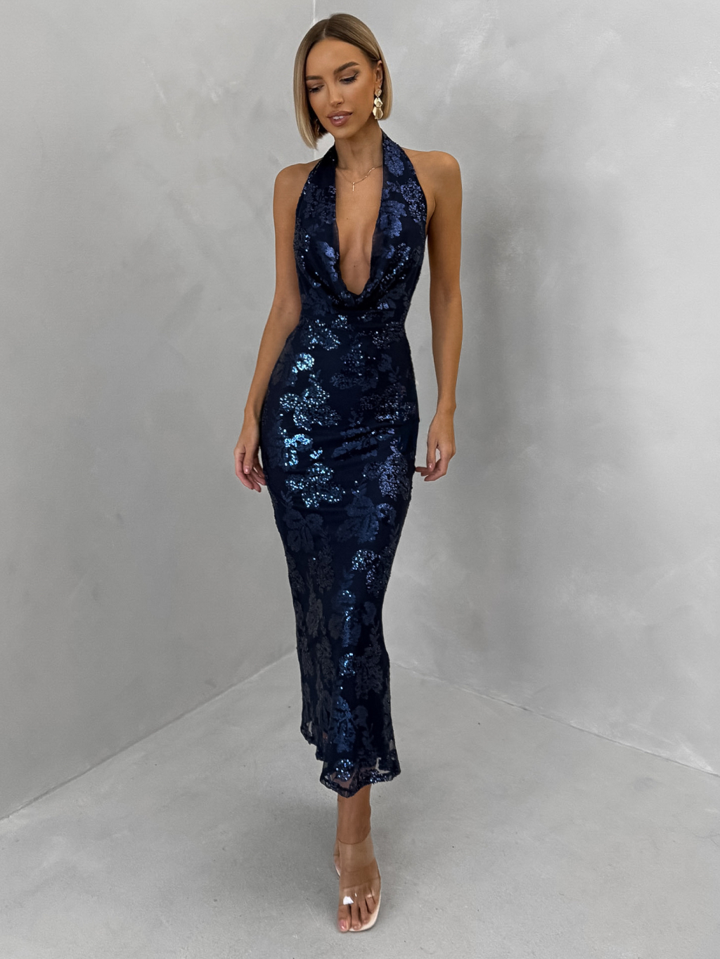 Tmavomodré trblietavé spoločenské šaty ZUNETRA s výstrihom