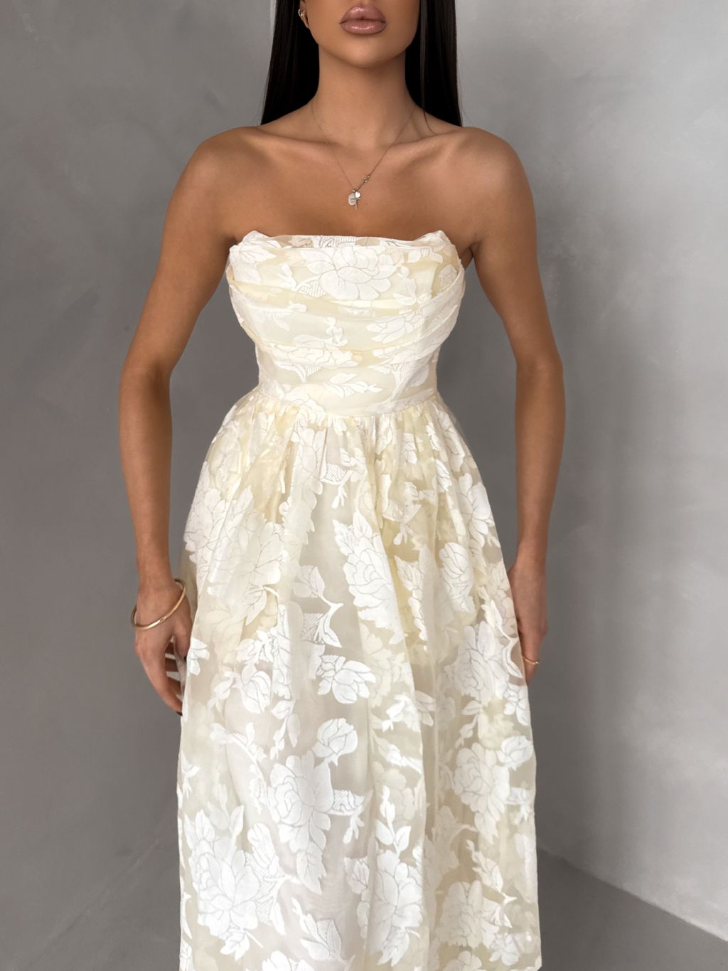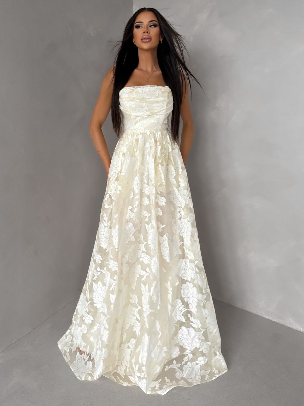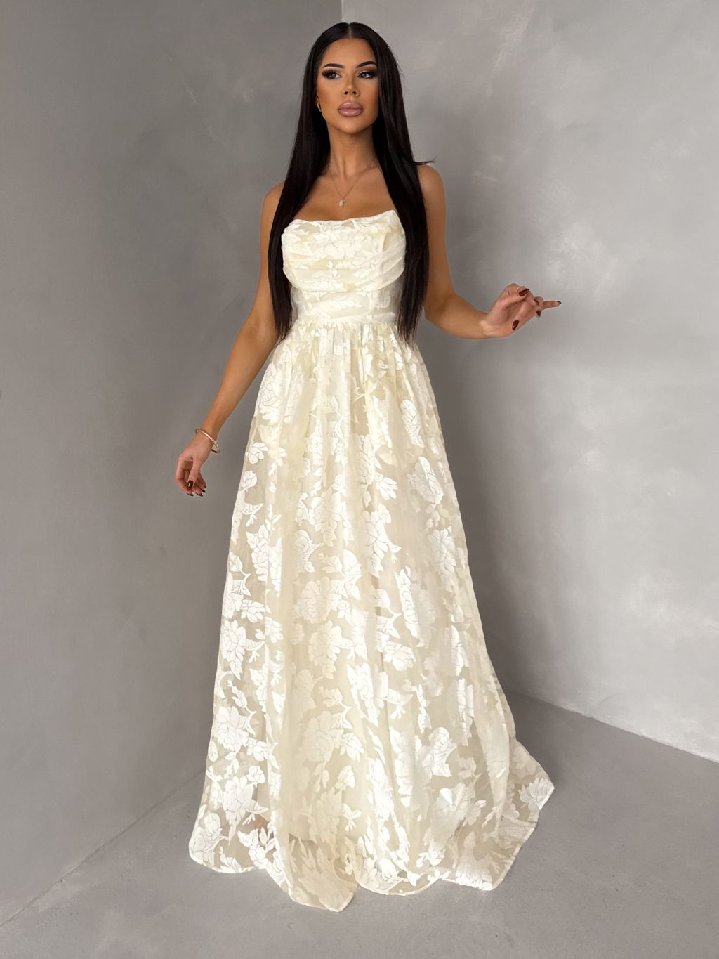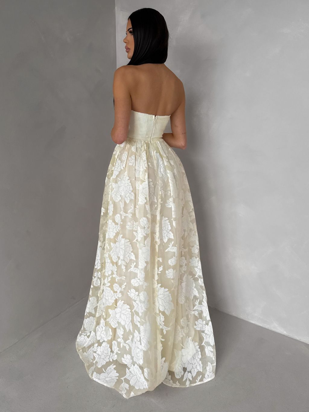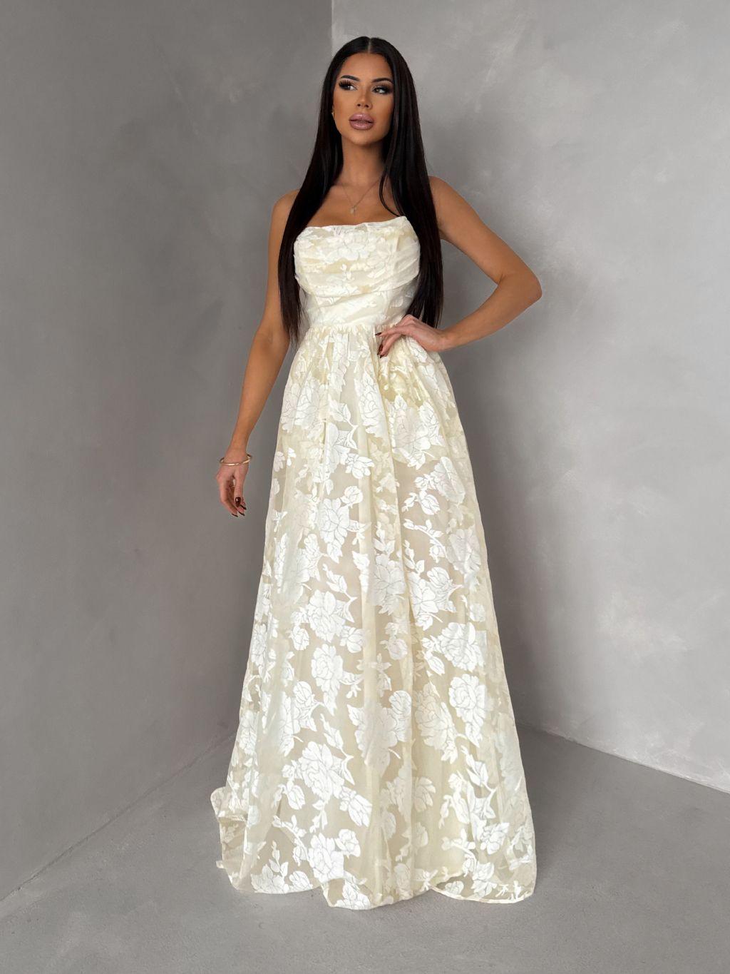 Vanilkové plesové dlhé šaty MIRELLE s kvetinovým vzorom