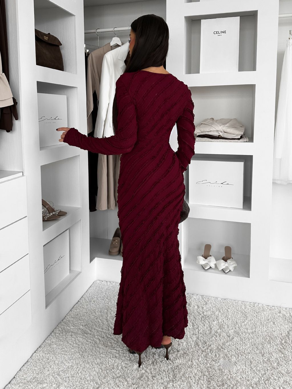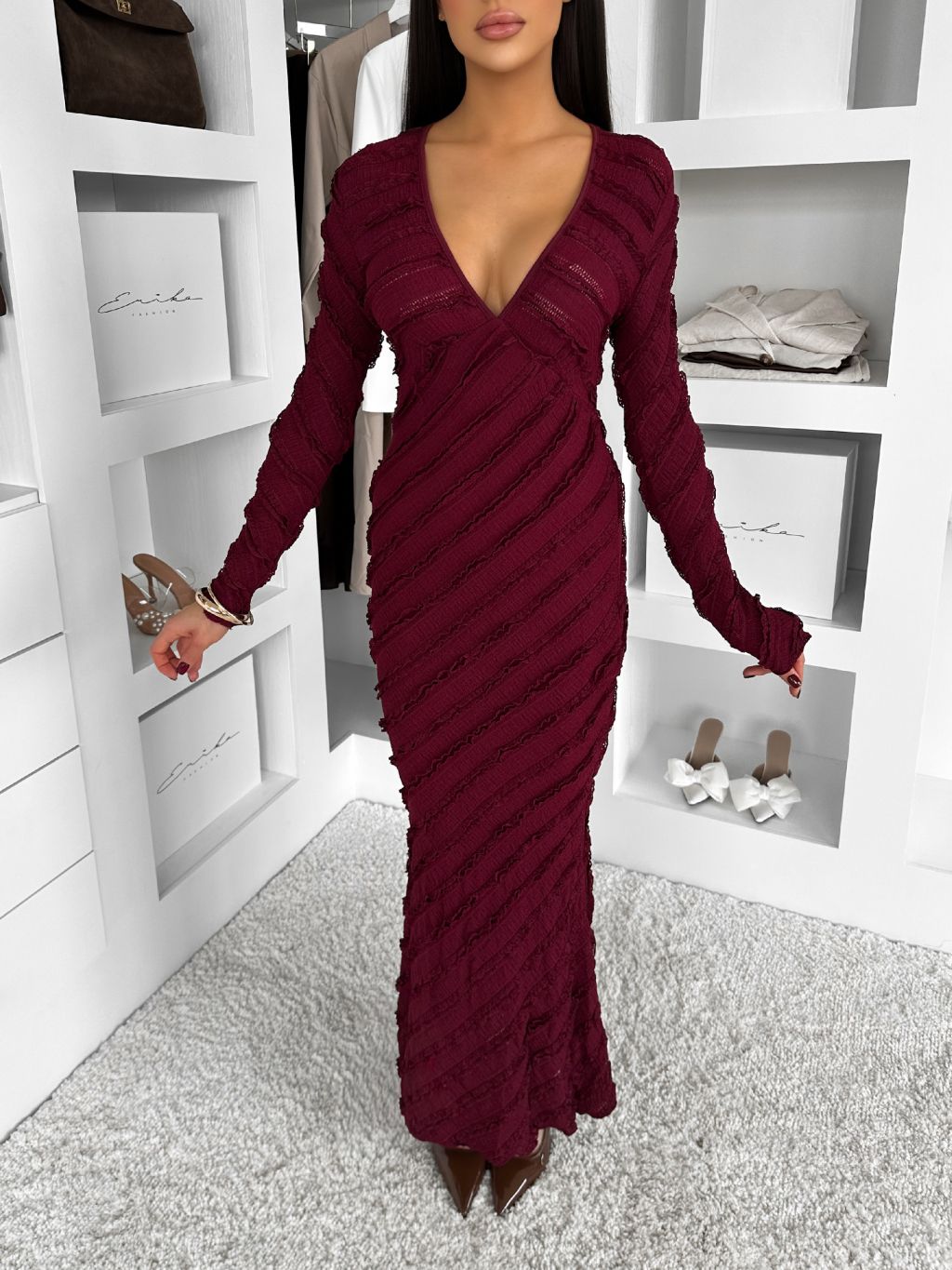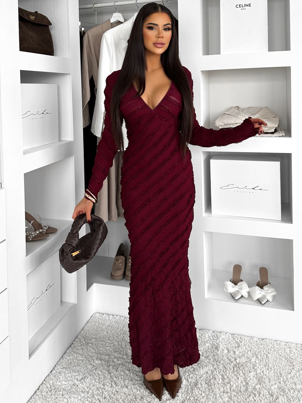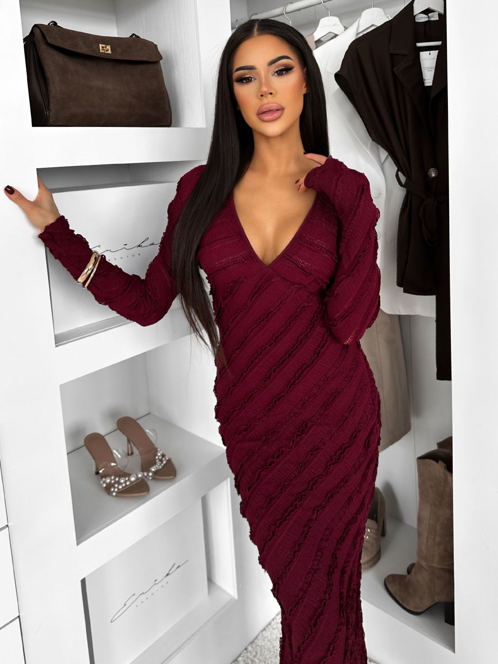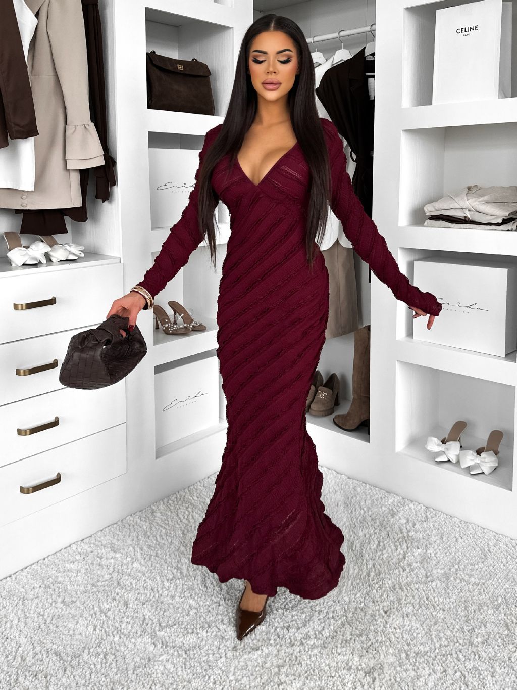 Vínové dlhé šaty FAYMONT s dlhým rukávom