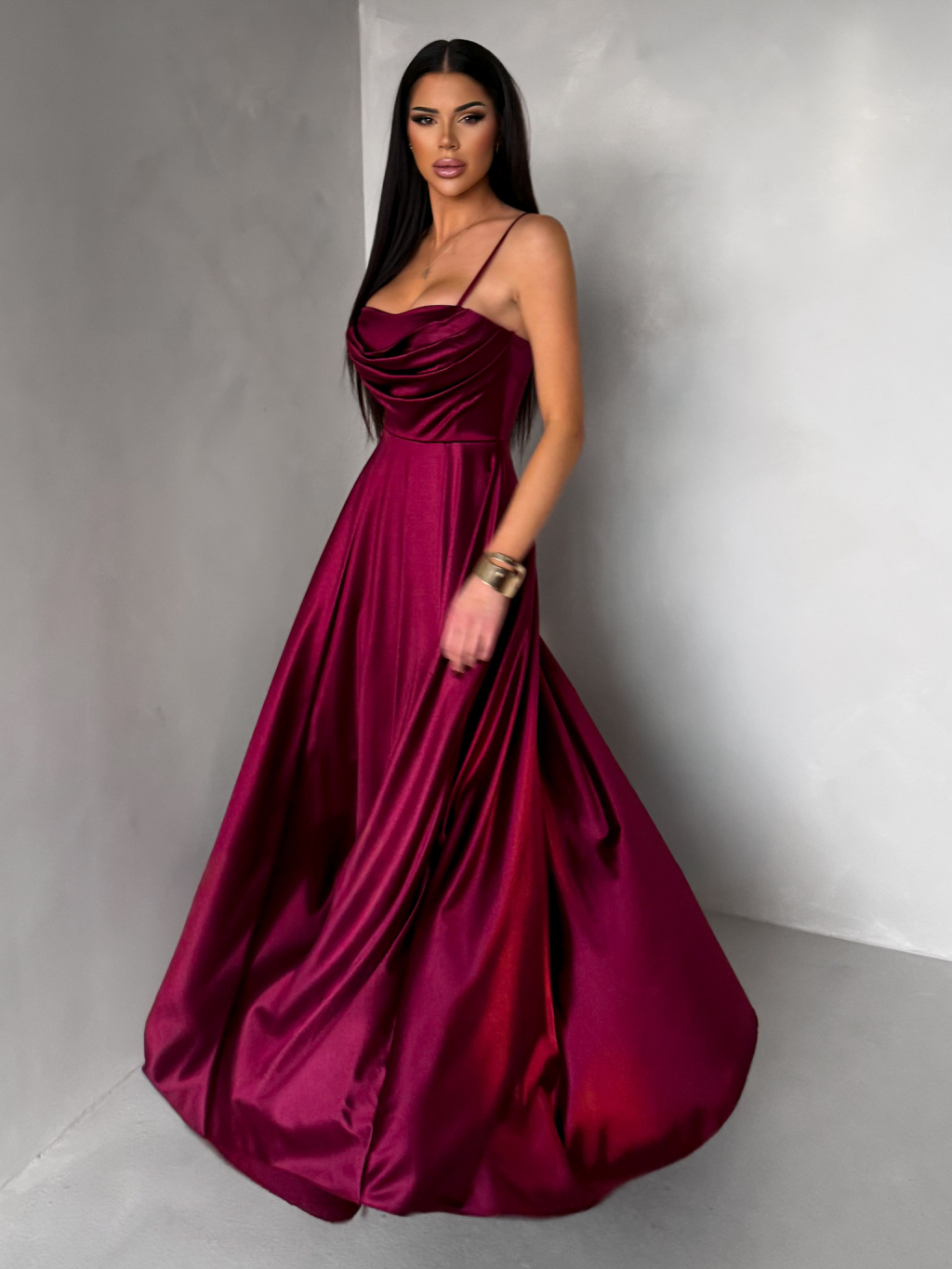 Vínové saténové dlhé spoločenské šaty LUNOREX