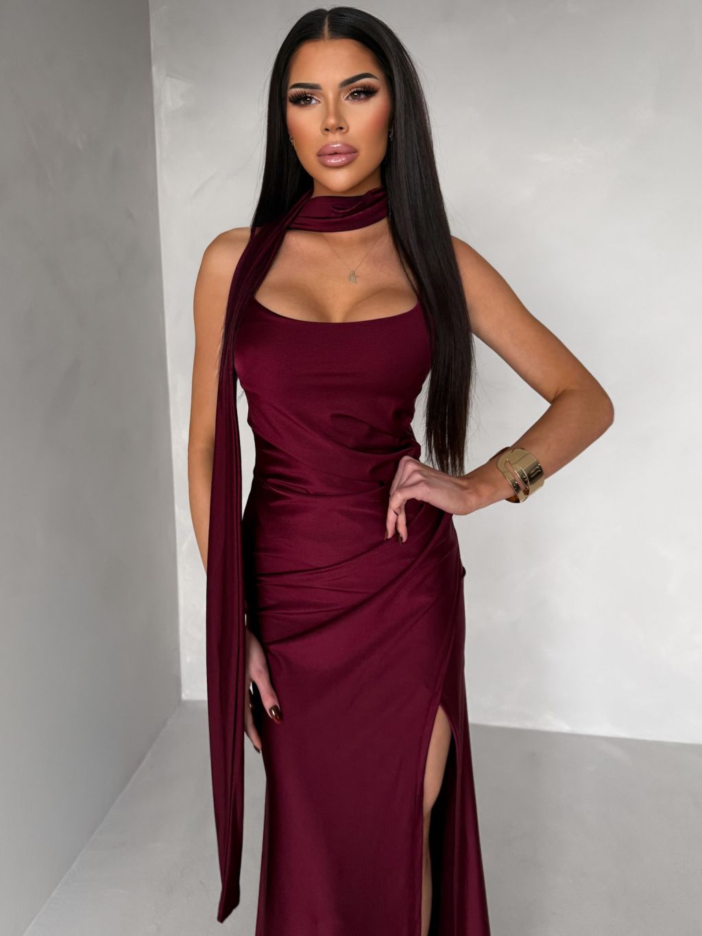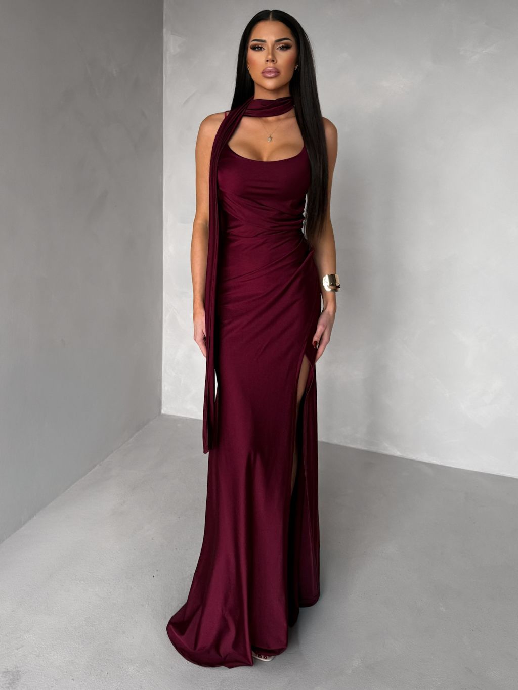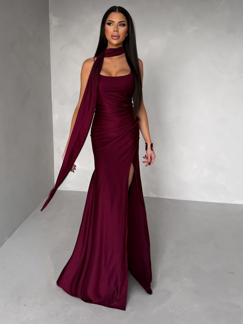 Vínové spoločenské dlhé šaty BELUNA so šálom