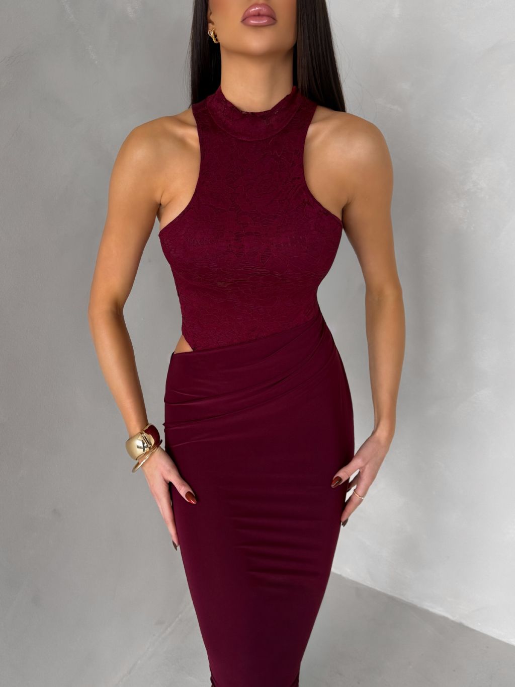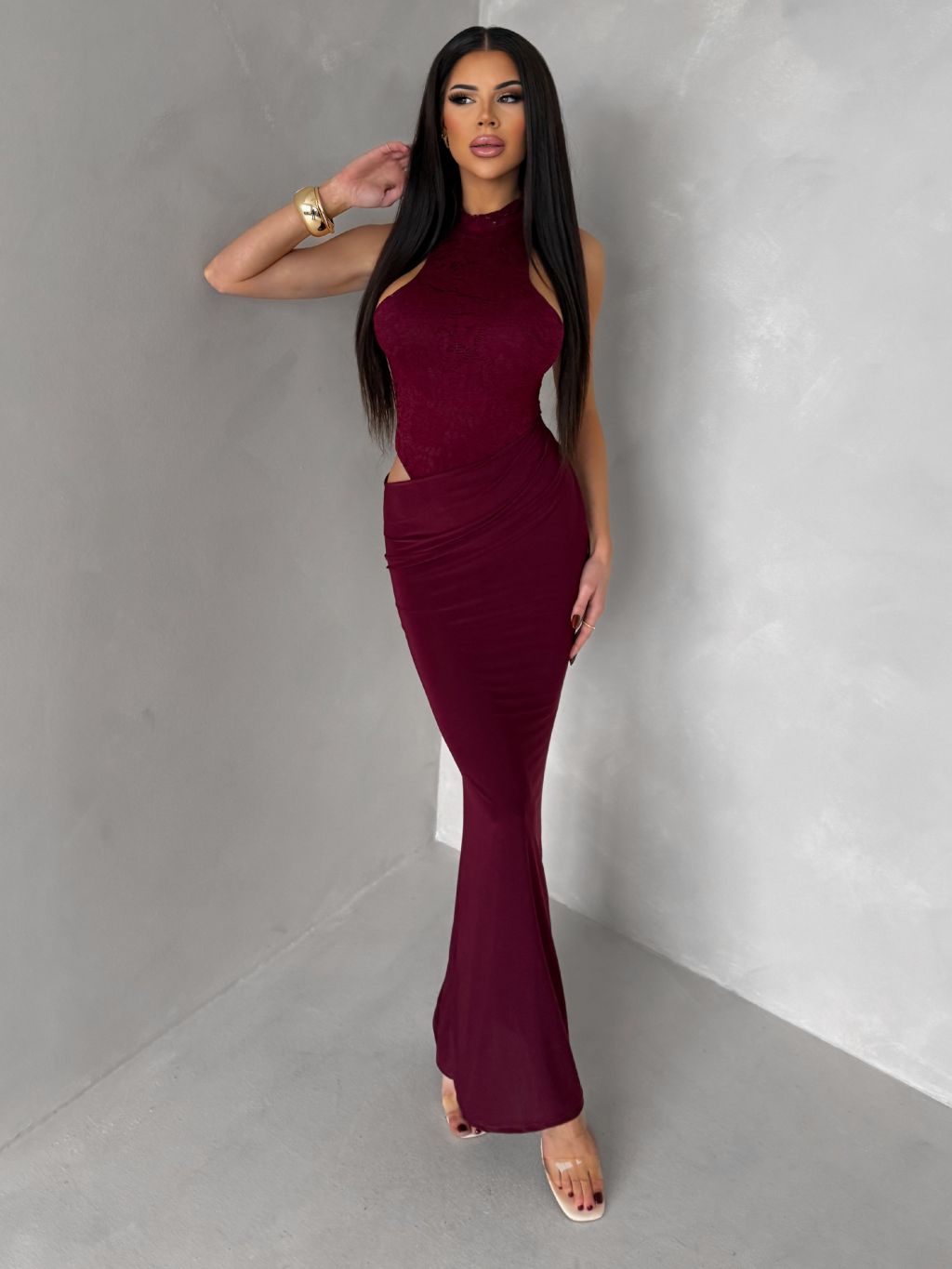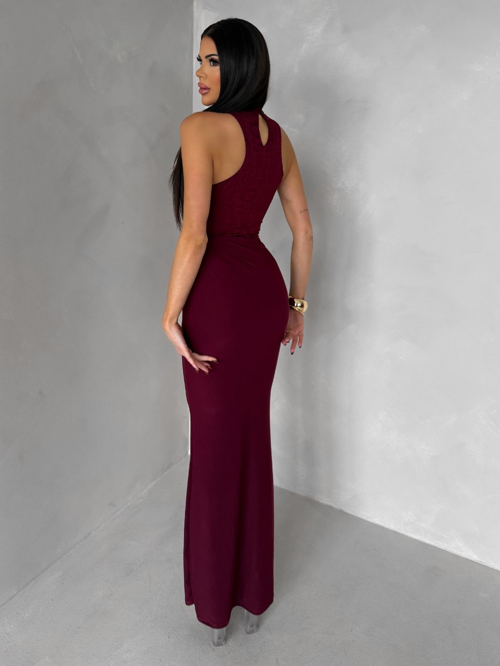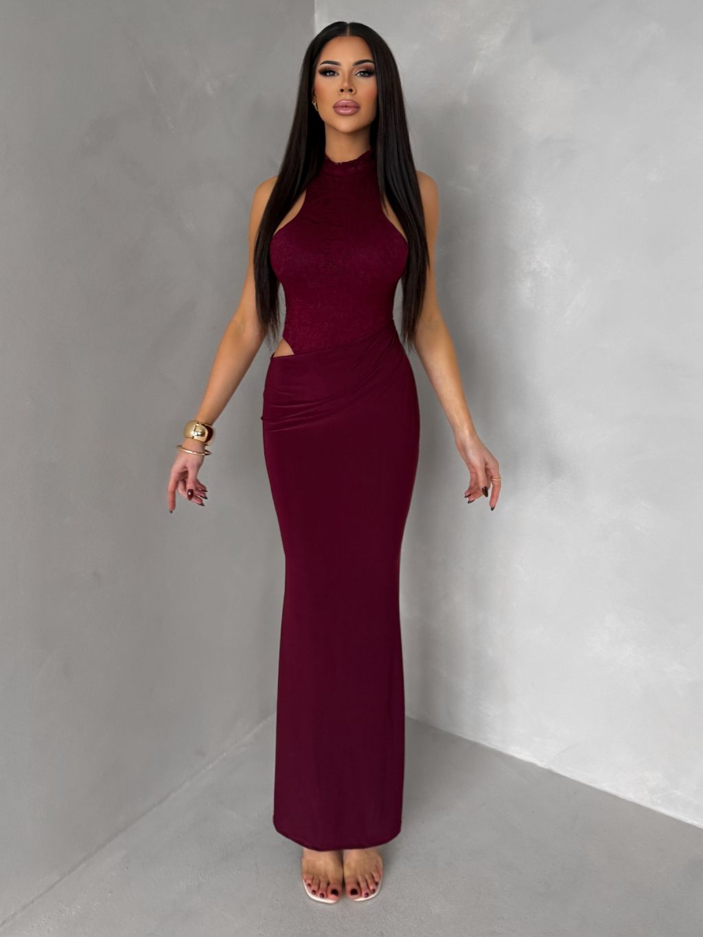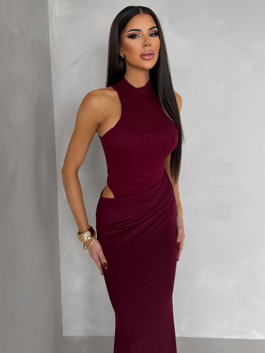 Vínové spoločenské dlhé šaty OLIVIEN s bodmi