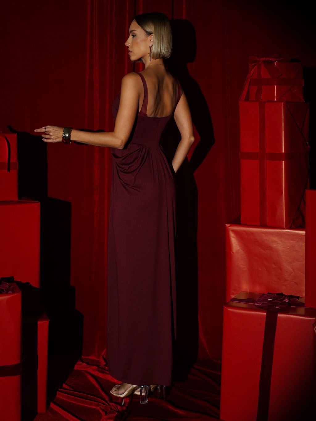 Vínové spoločenské tvarujúce dlhé šaty NOBLEN
