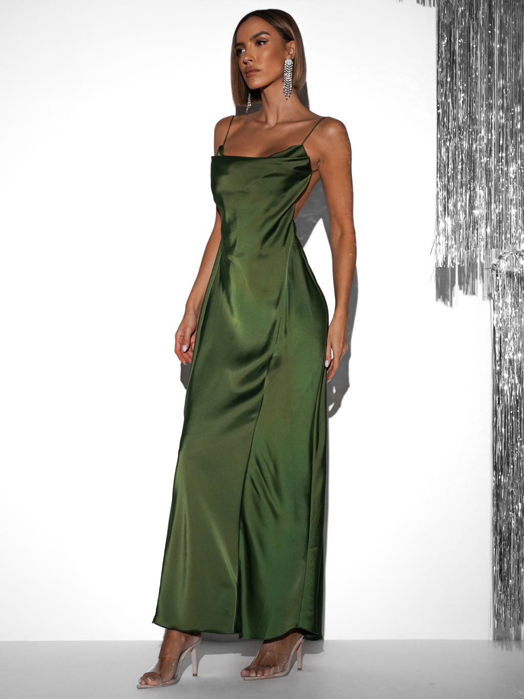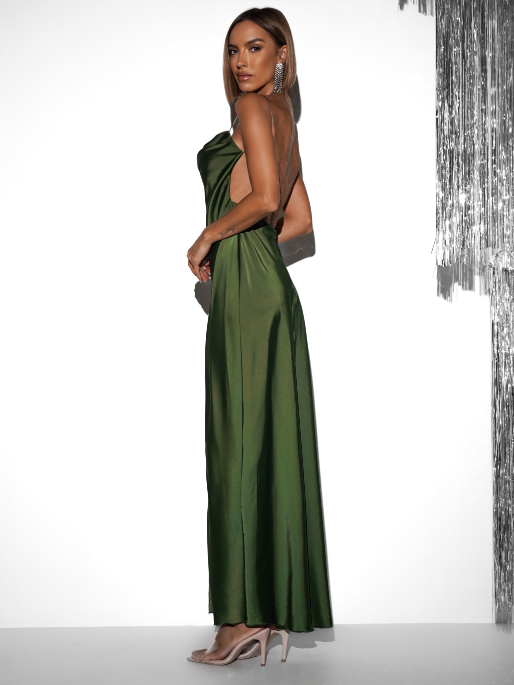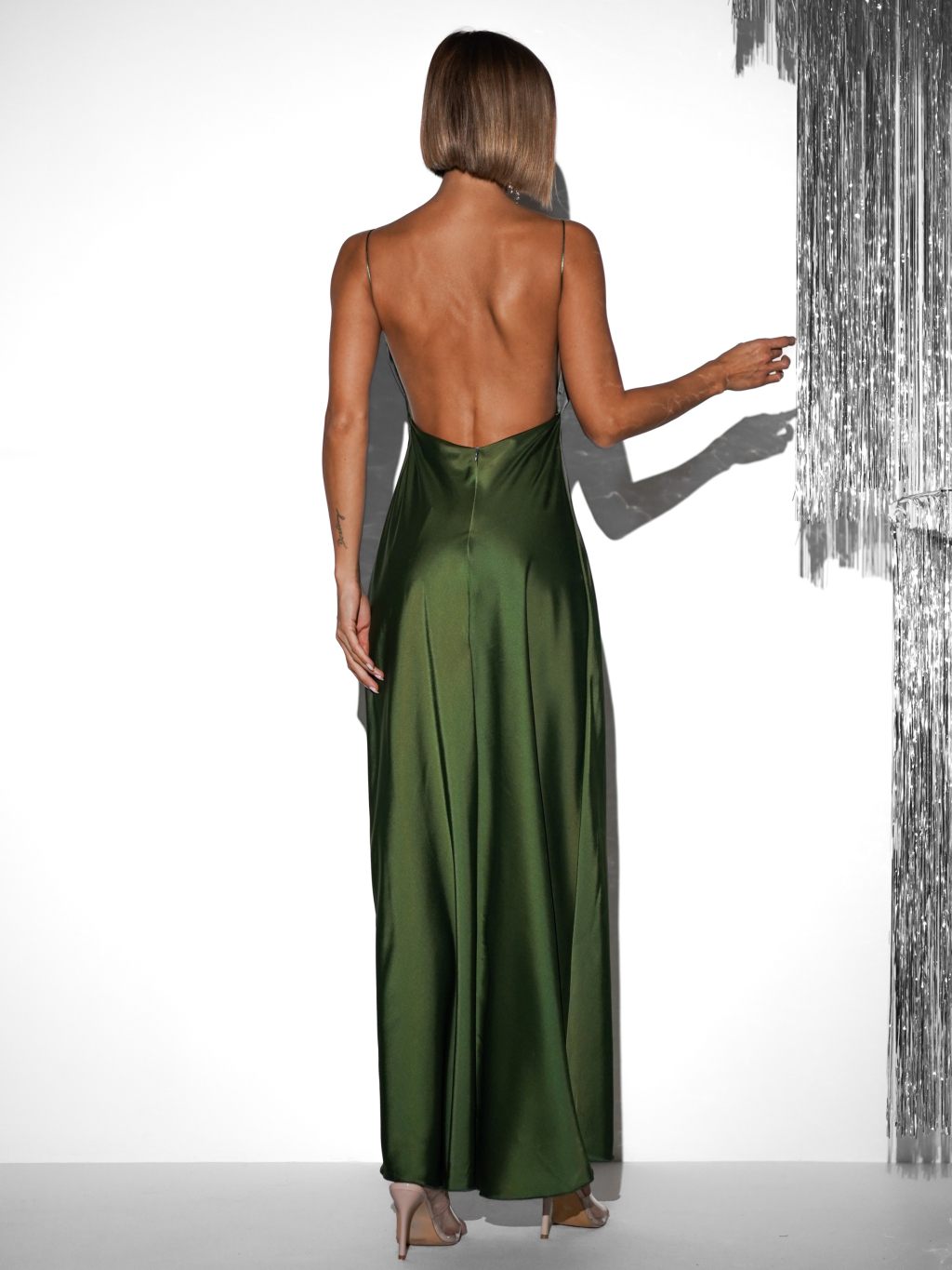 Zelené dlhé saténové šaty UNUTA s holým chrbtom