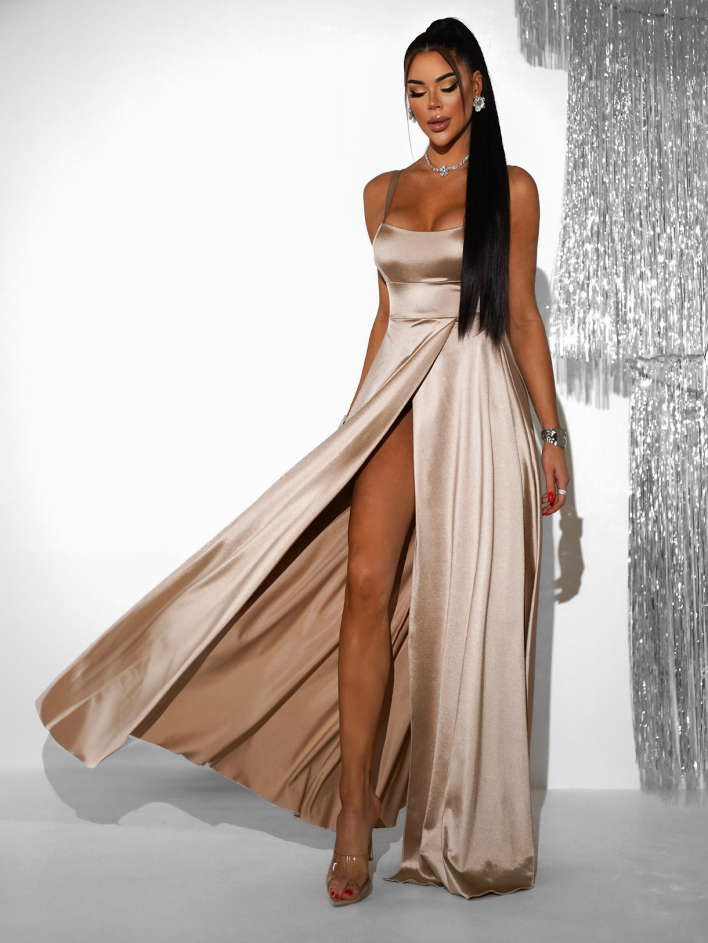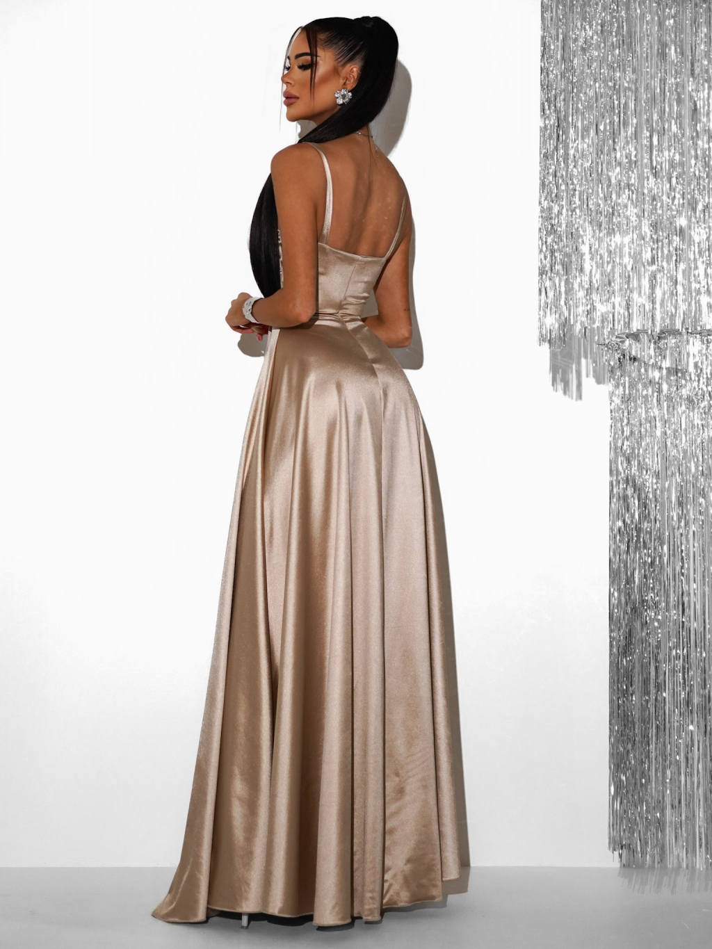 Zlaté dlhé saténové šaty HELSIN s rázporkom