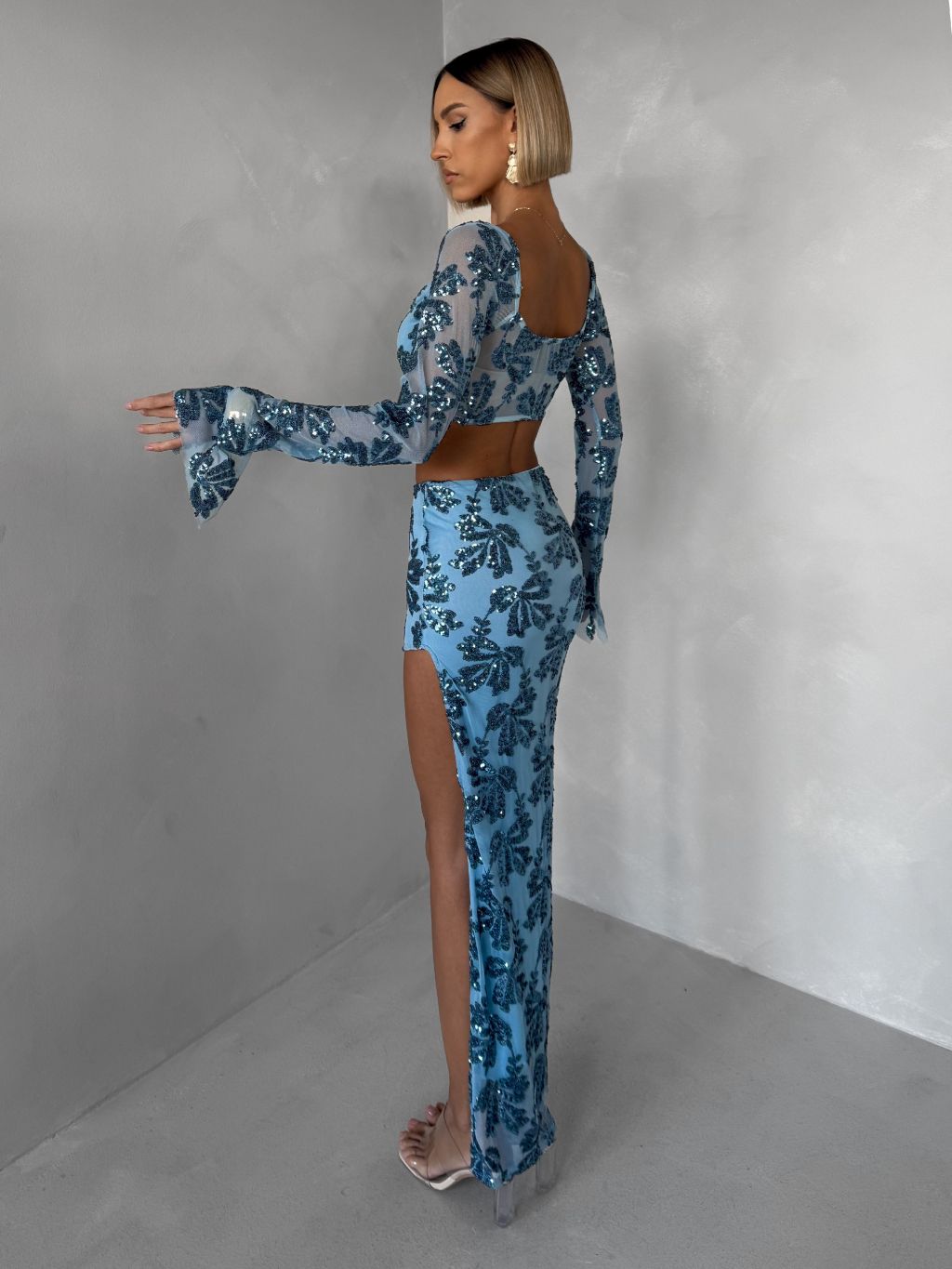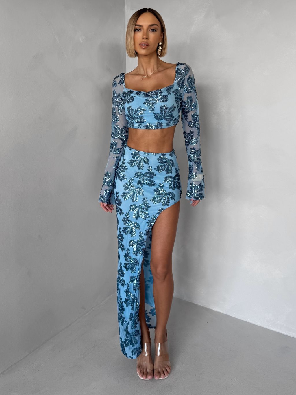 Modrý elegantný trblietavý komplet LARUNE so sukňou