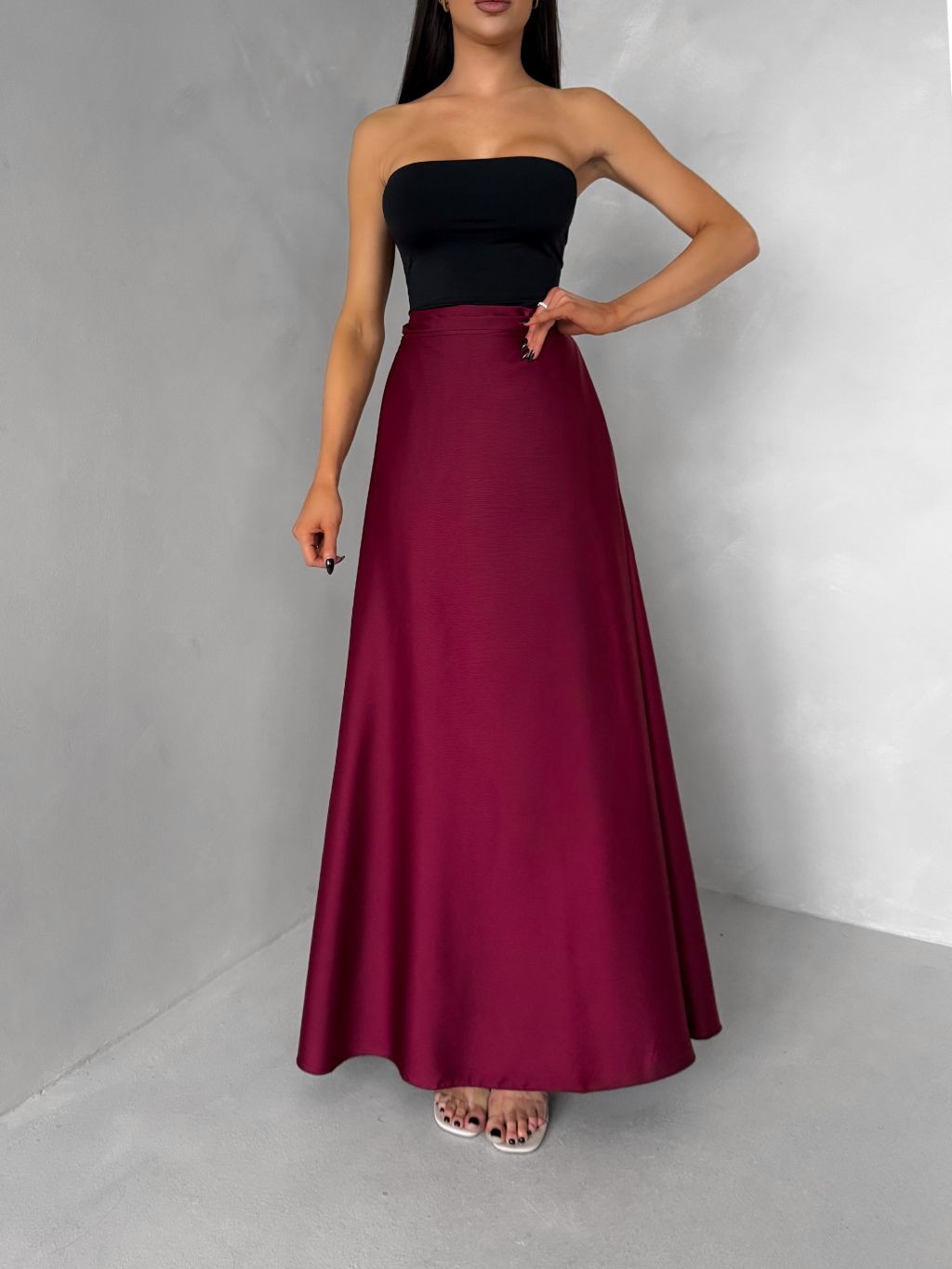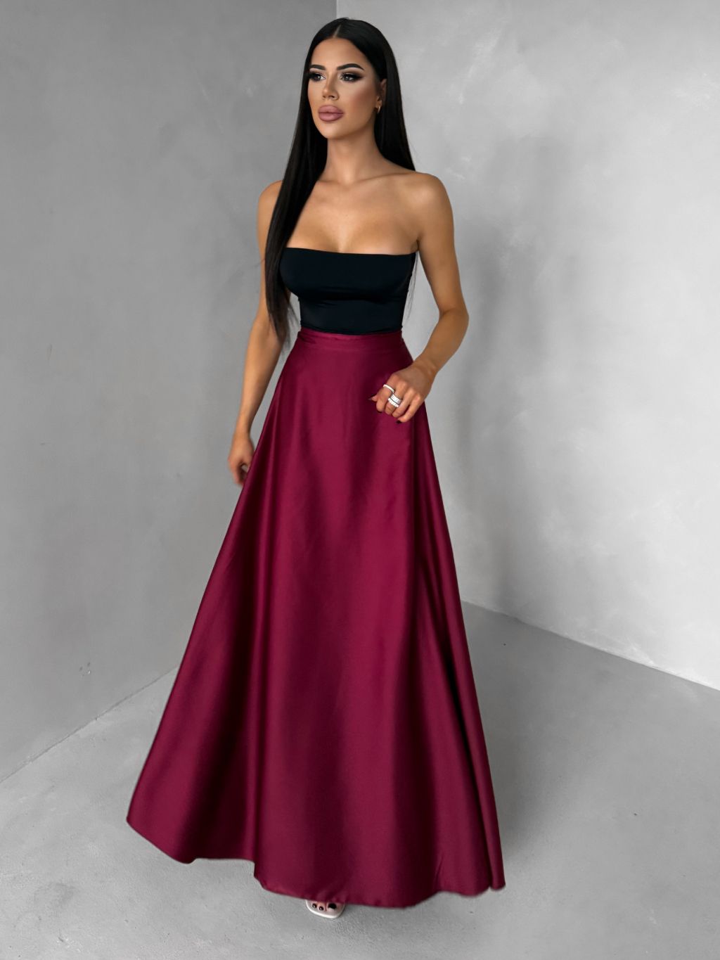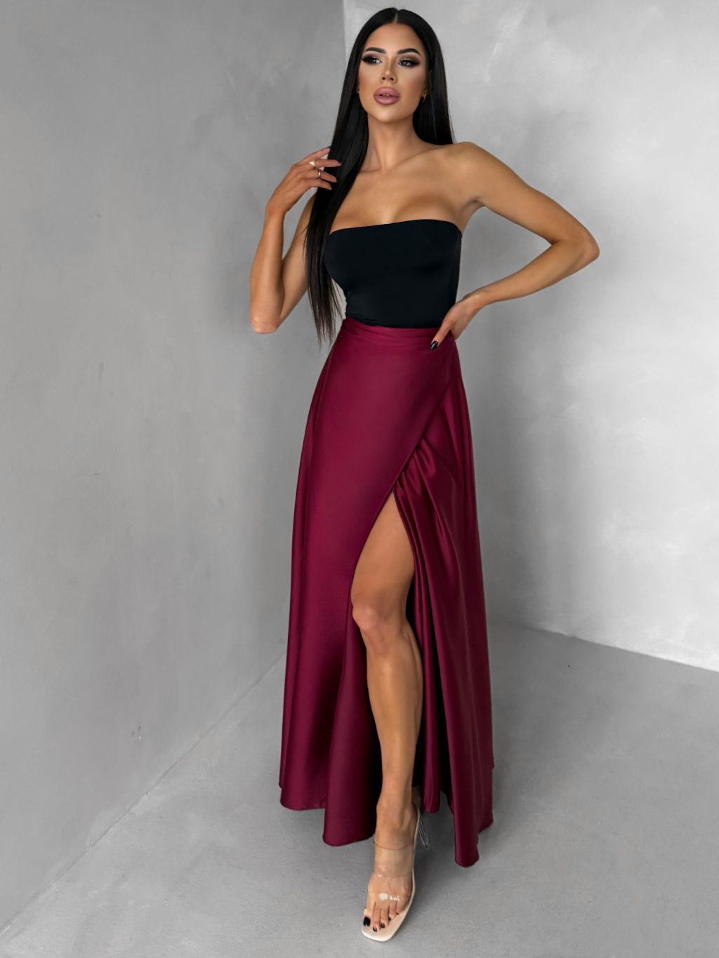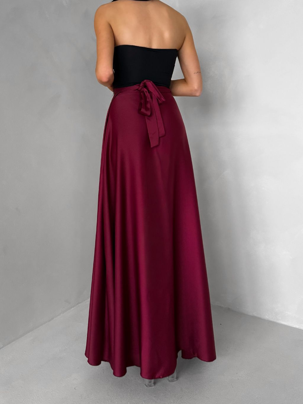 Vínová saténová dlhá zavinovacia maxi sukňa DENISSE