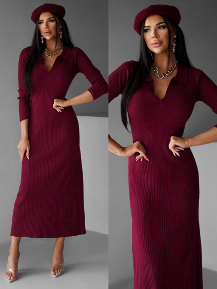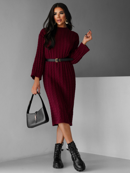 Vínové úpletové elegantné šaty CRESTILO s dlhým rukávom