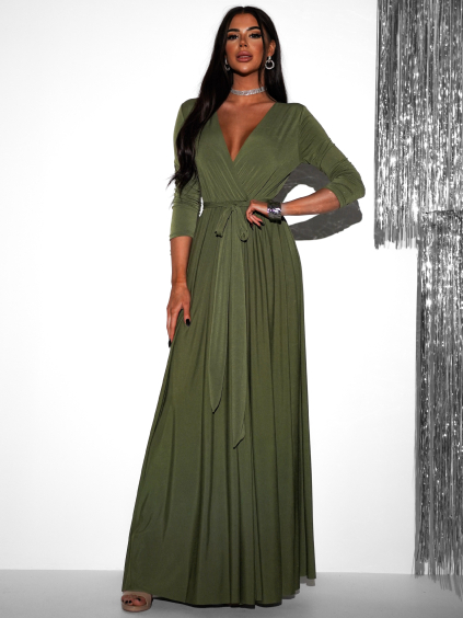 Olivové dlhé spoločenské šaty JOELLIAN s dlhým rukávom