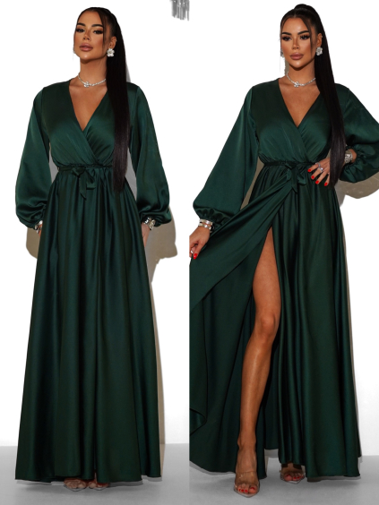 Smaragdové saténové maxi šaty WOMAN s dlhým rukávom