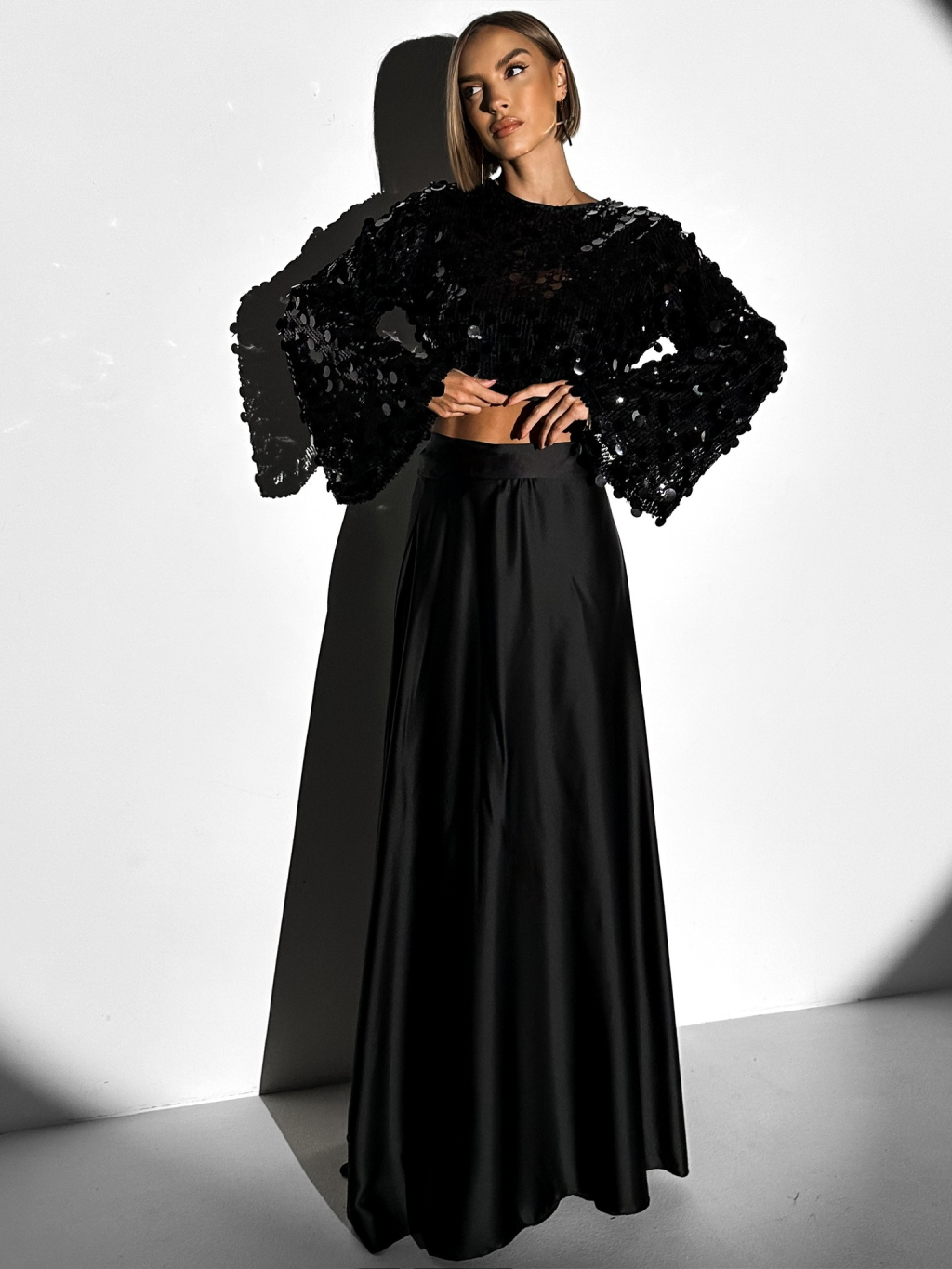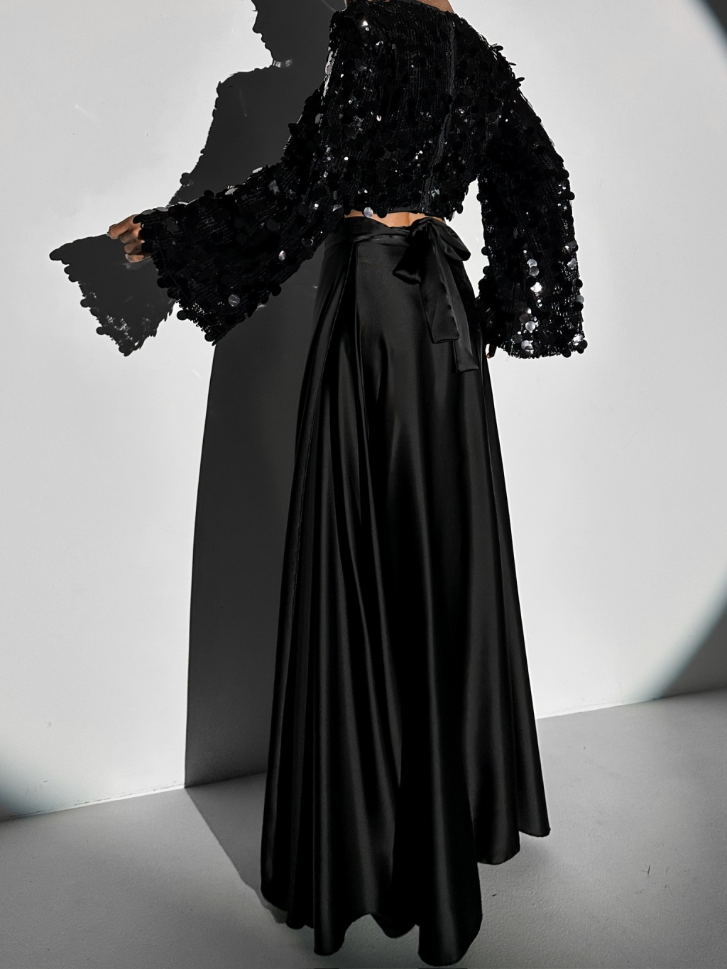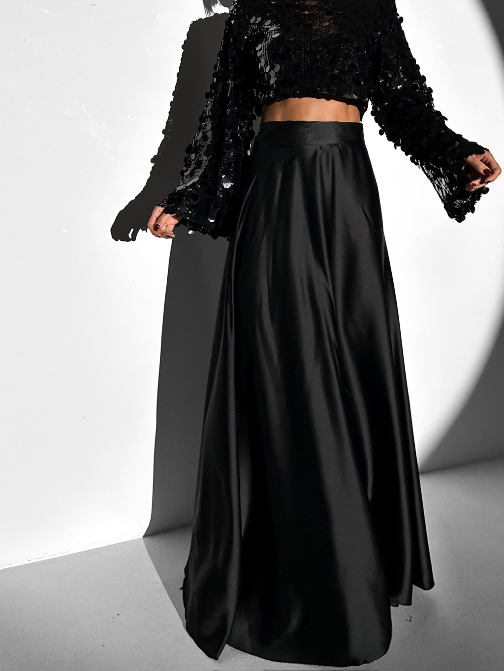 Čierna saténová dlhá plesová sukňa DENISSE na batožinu
