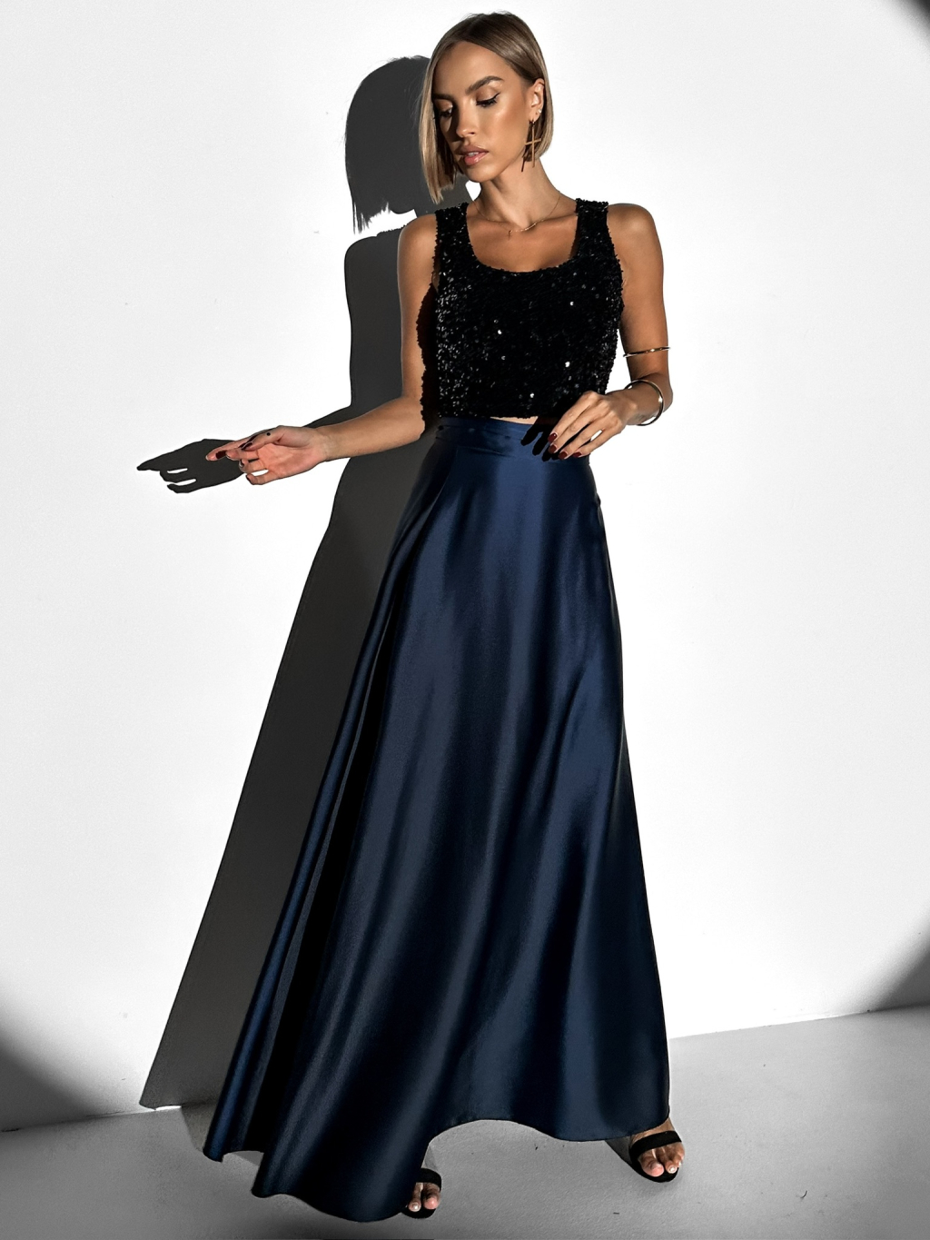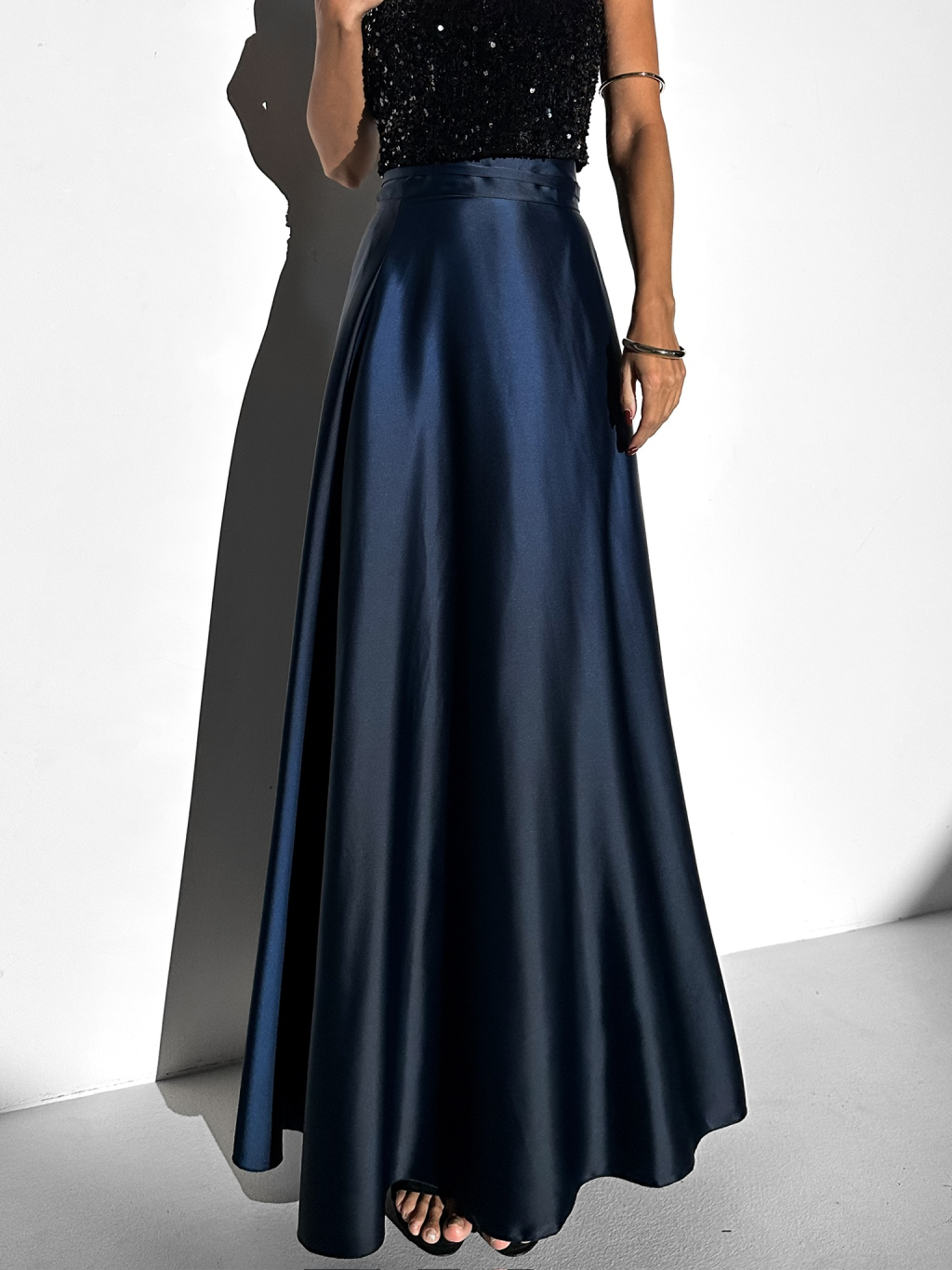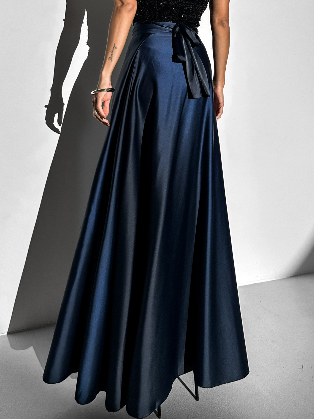 Tmavomodrá dlhá saténová sukňa DENISSE zavinovací